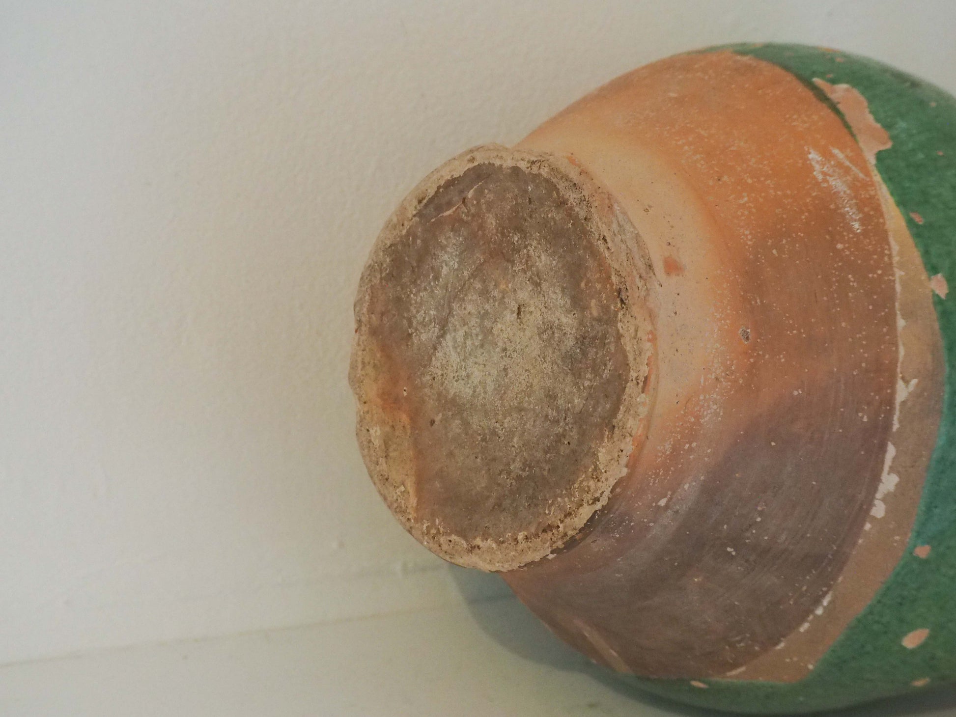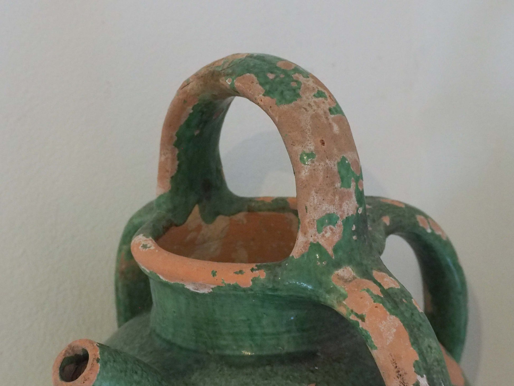 An beautiful rustic antique green confit pot with spout and handles, believed to have originally been used to store and keep water cool in the south of France. This particular pot is made from terracotta with characterful traditional half glaze.