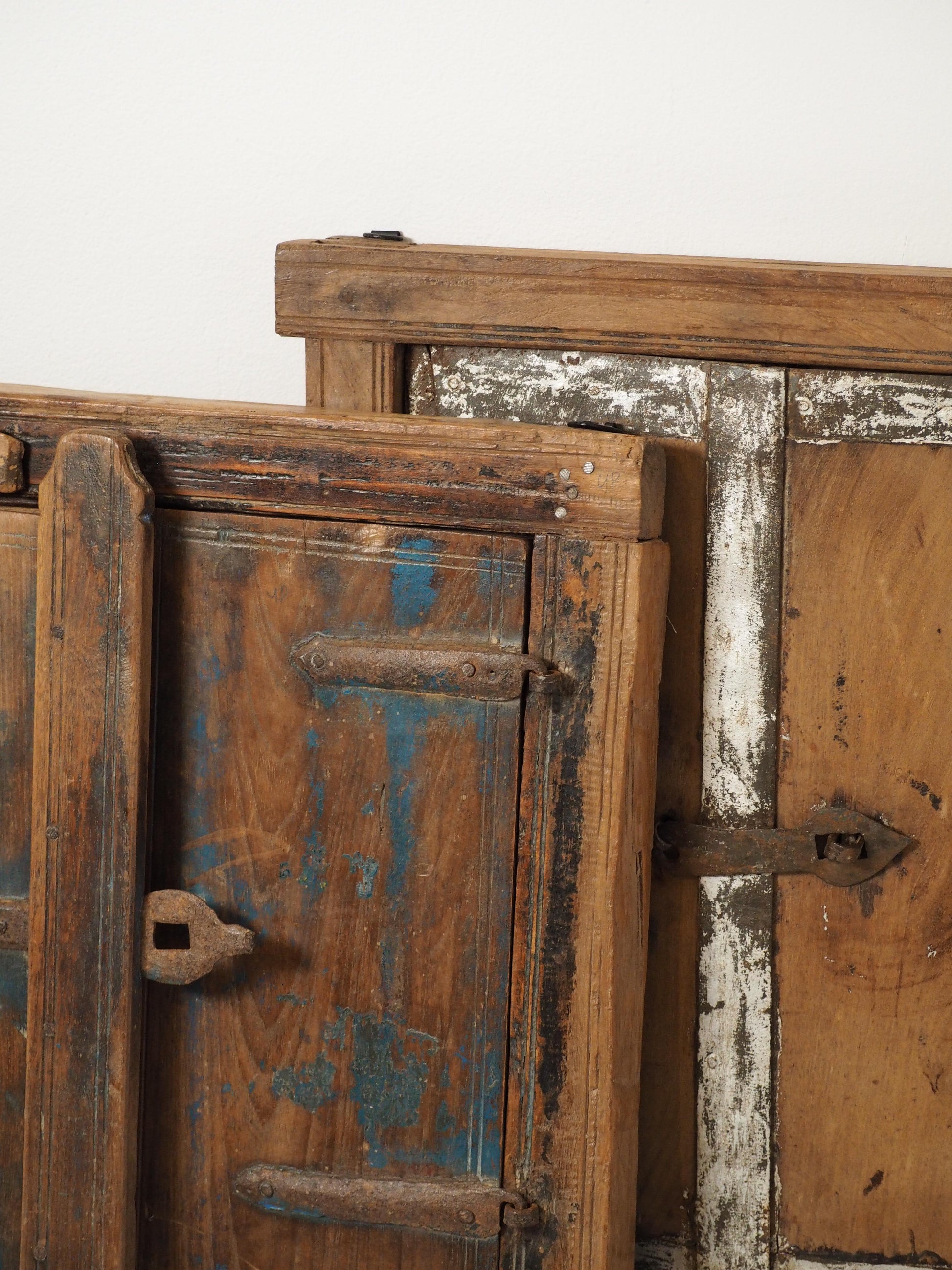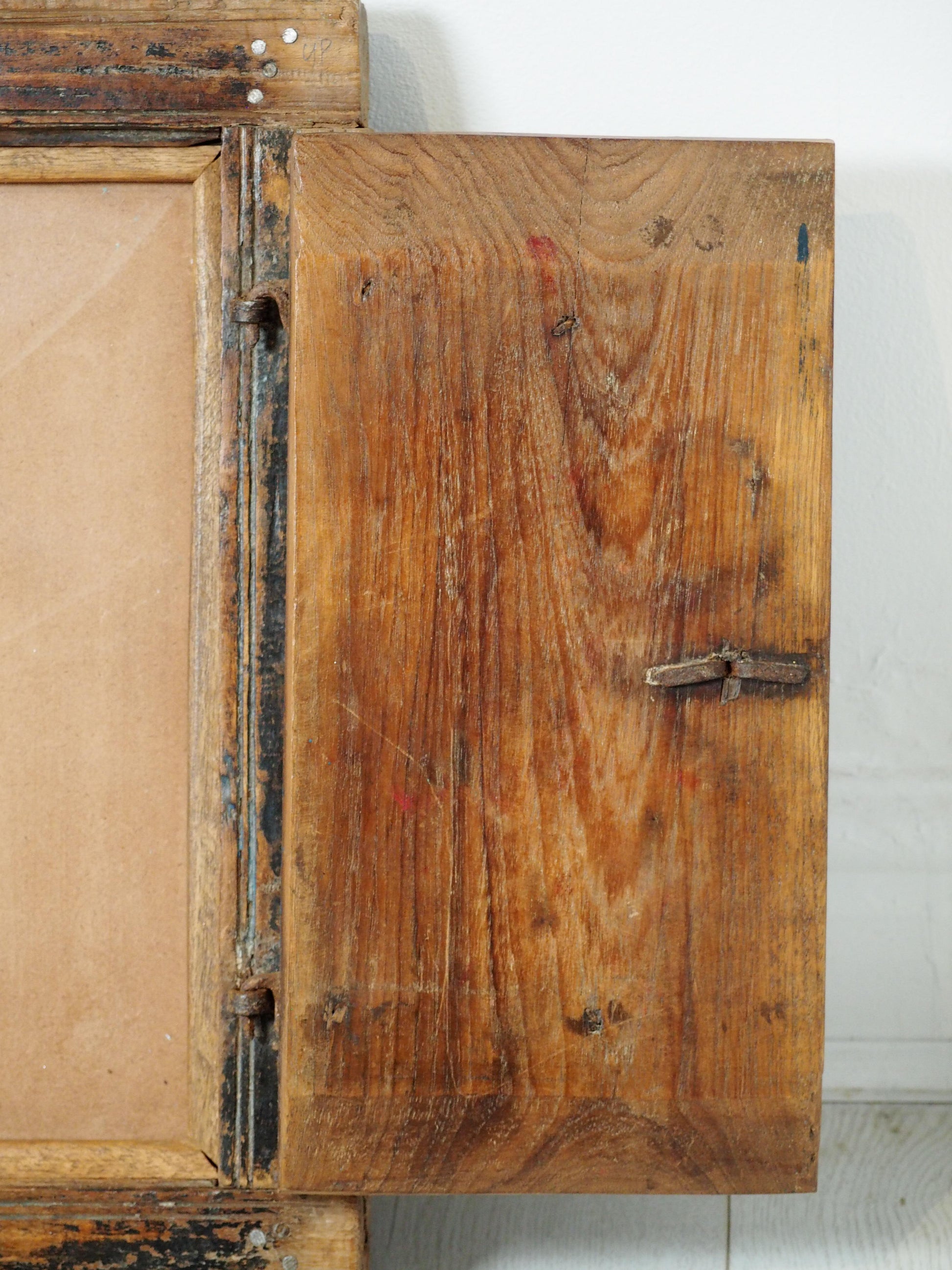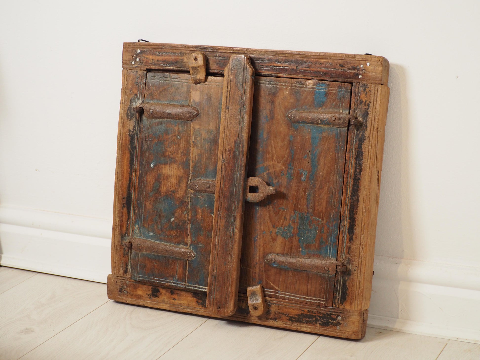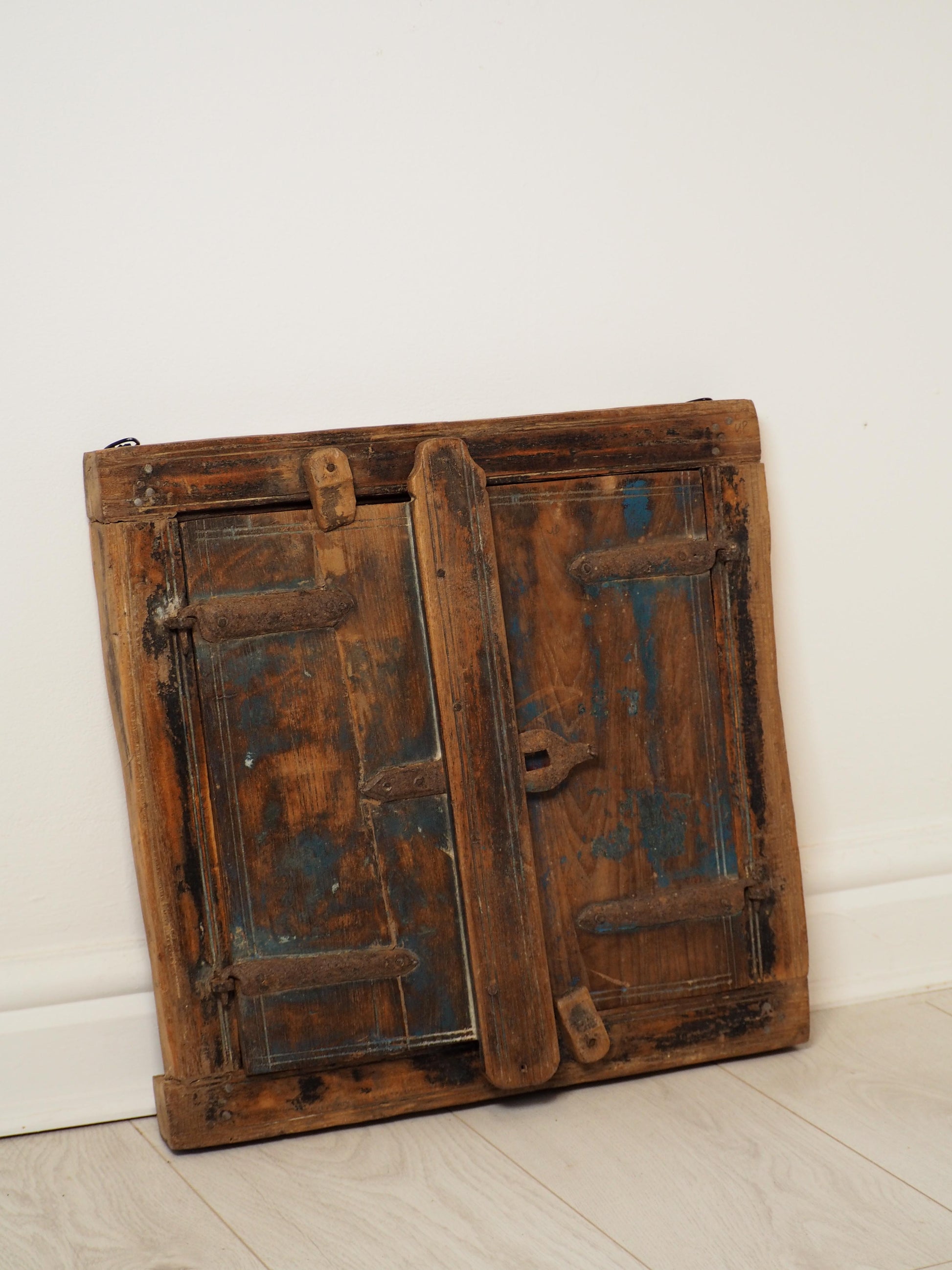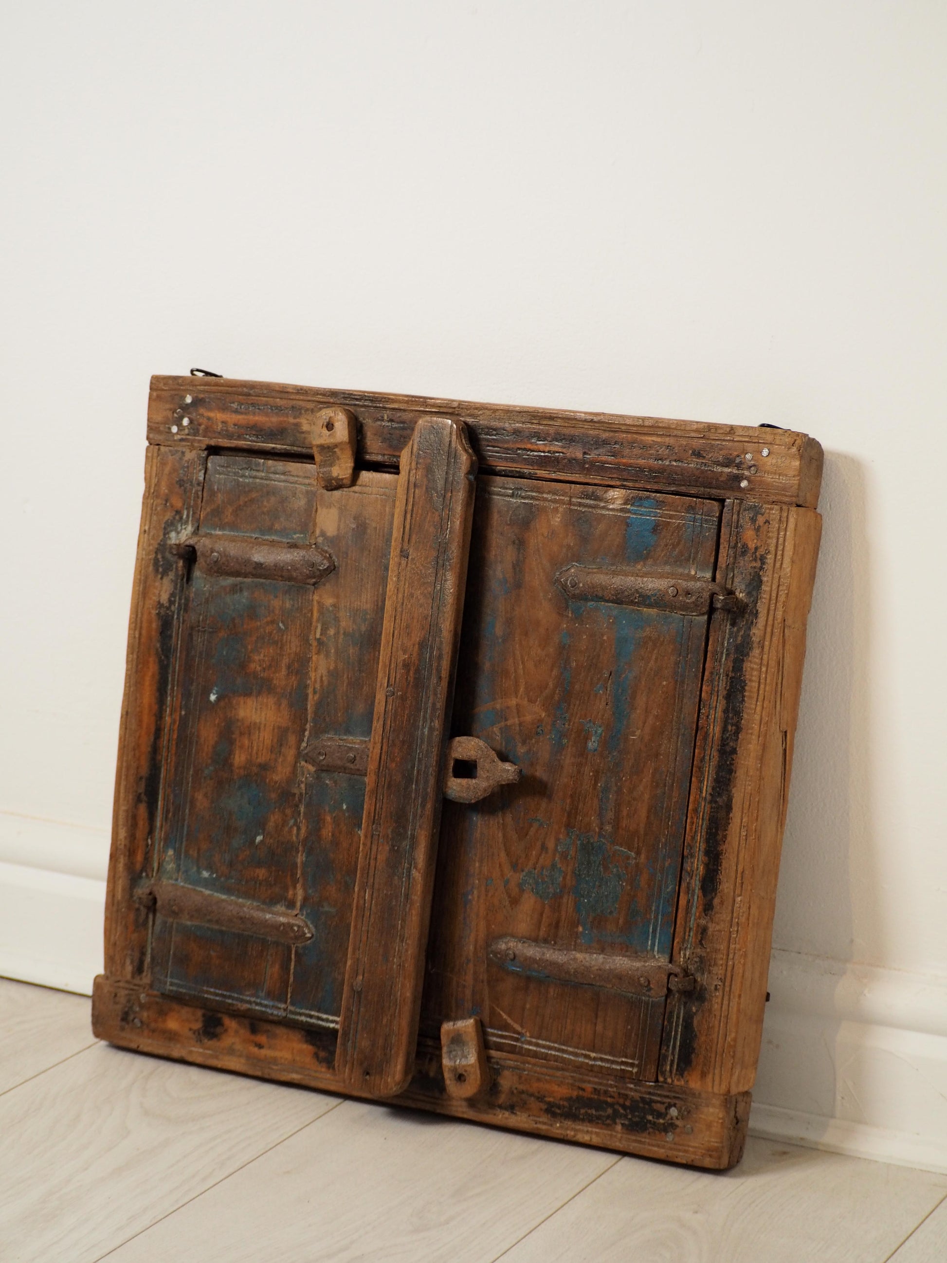 A lovely rustic antique Indian shutter window with metal latch and colourful original paint detailing. It originally would have been used as a window to allow ventilation and natural light into indoor spaces, essential for maintaining air circulation and creating a comfortable environment. Now, it makes a beautiful piece of decorative wall art, and includes two fixtures on the back ready to be hung.