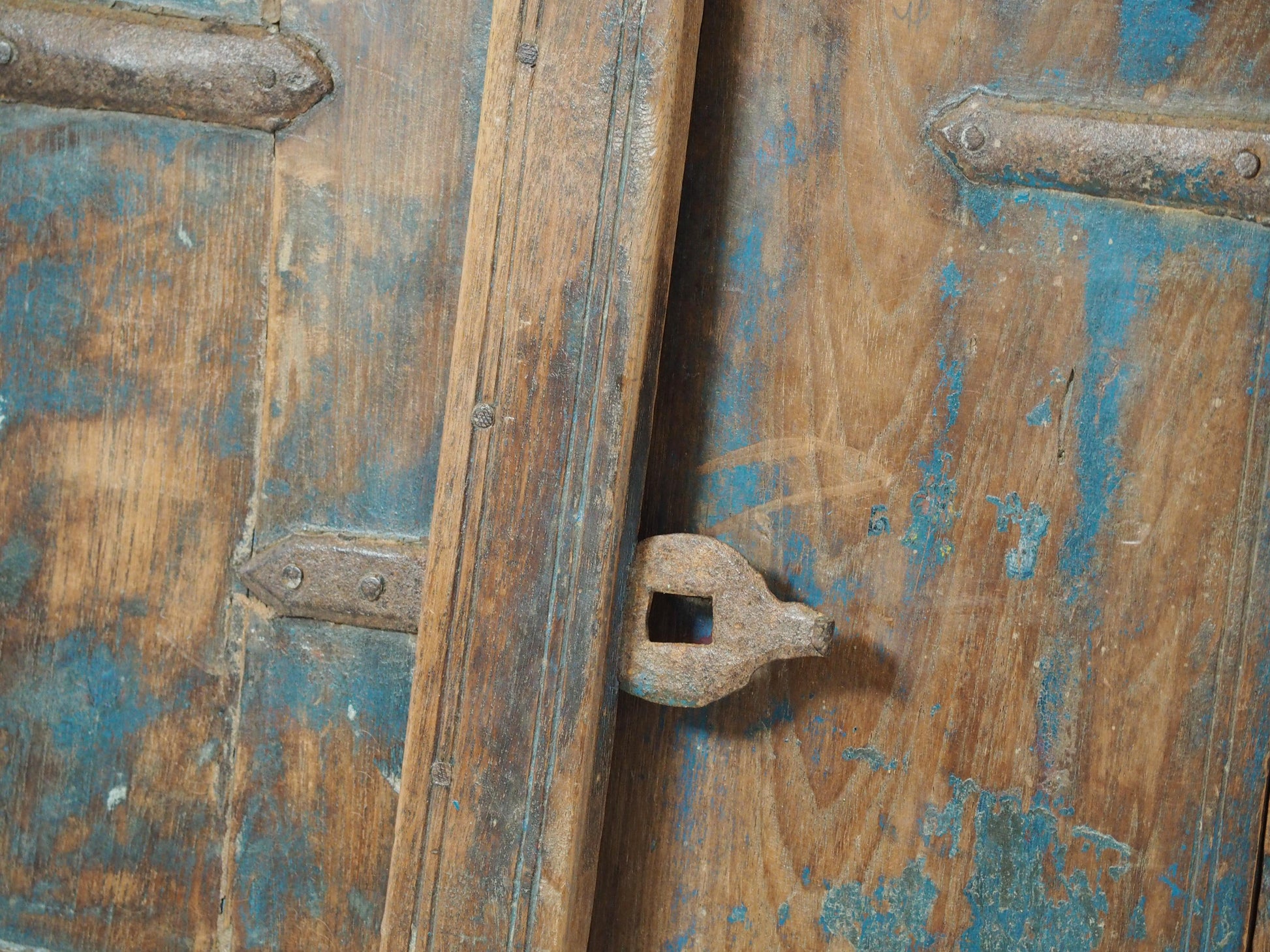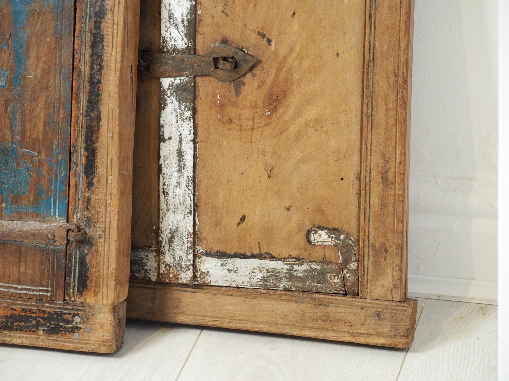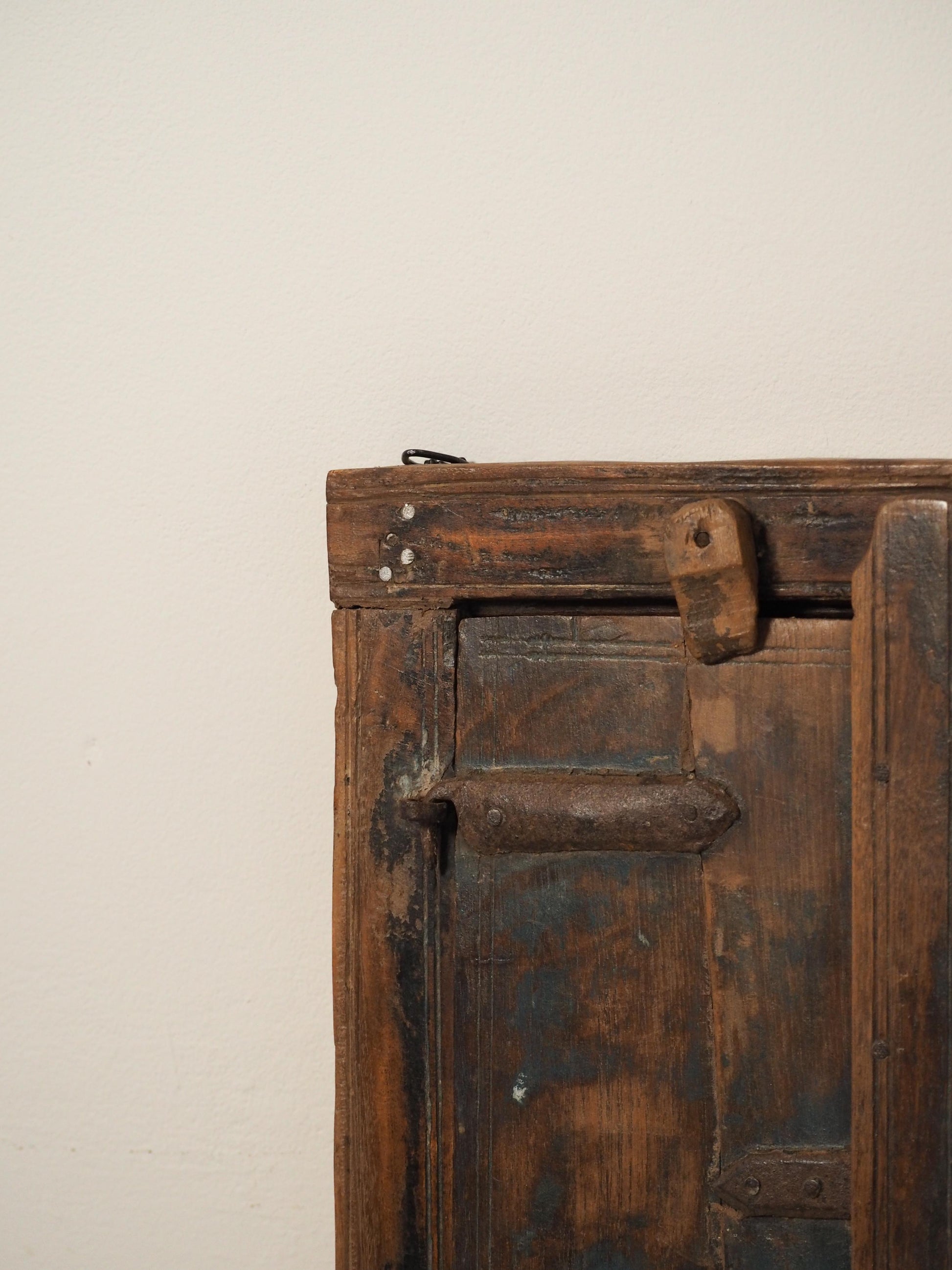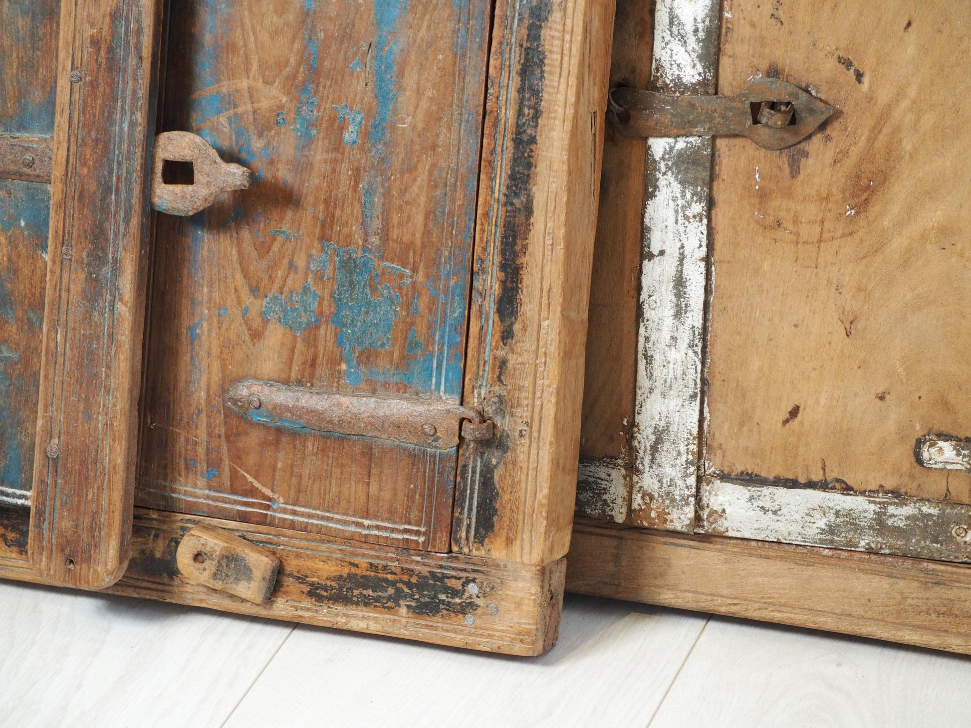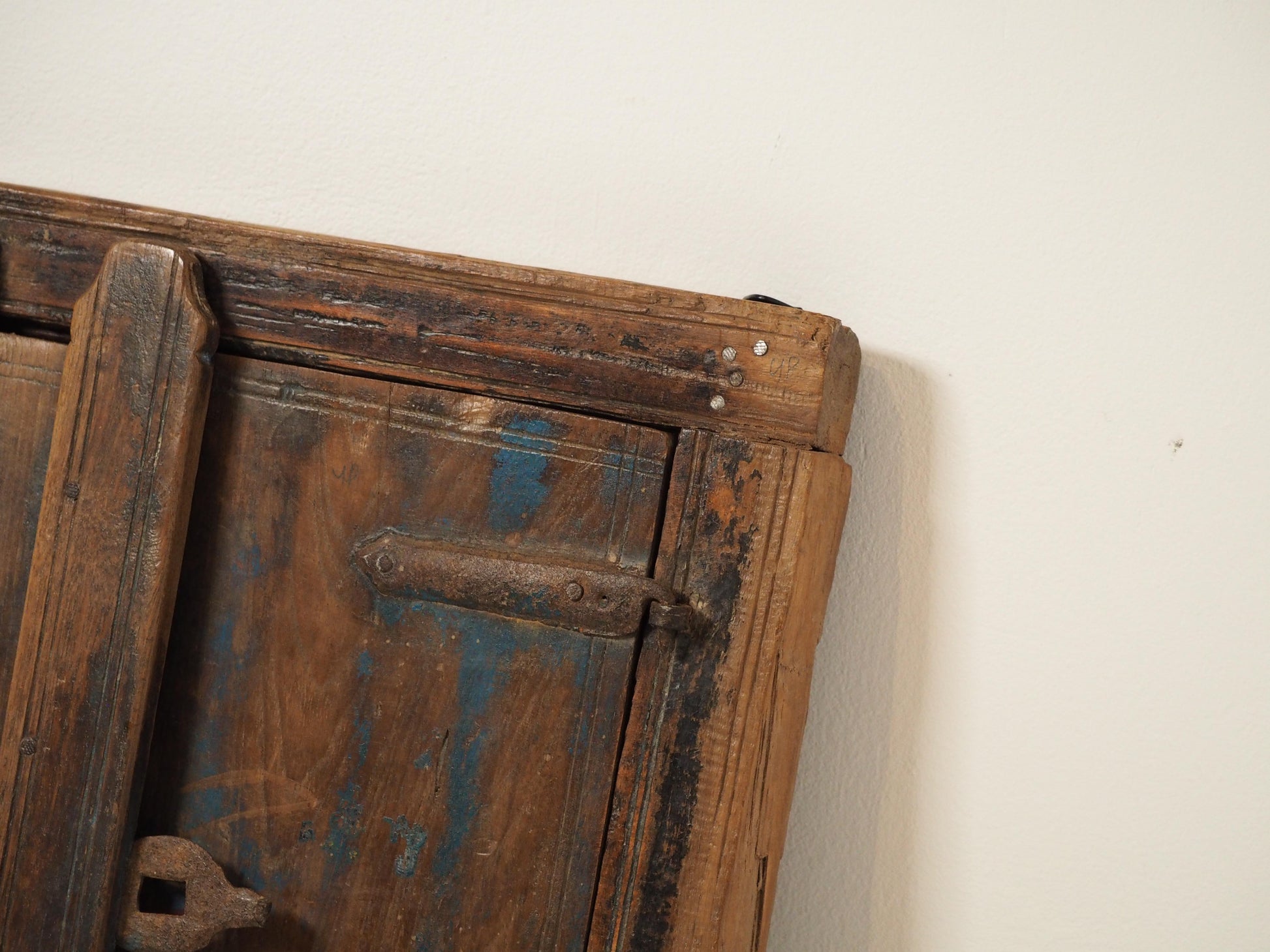 A lovely rustic antique Indian shutter window with metal latch and colourful original paint detailing. It originally would have been used as a window to allow ventilation and natural light into indoor spaces, essential for maintaining air circulation and creating a comfortable environment. Now, it makes a beautiful piece of decorative wall art, and includes two fixtures on the back ready to be hung.