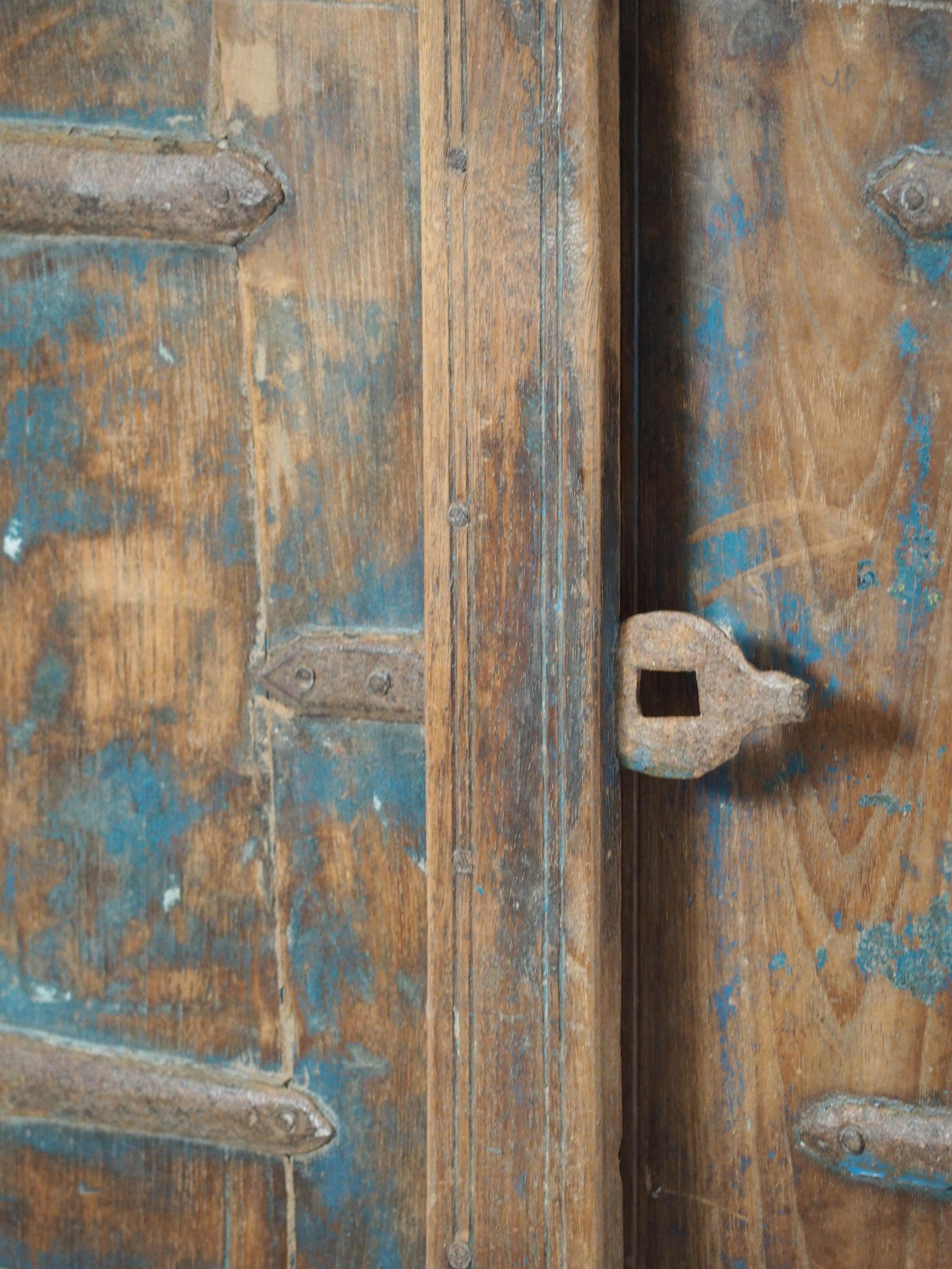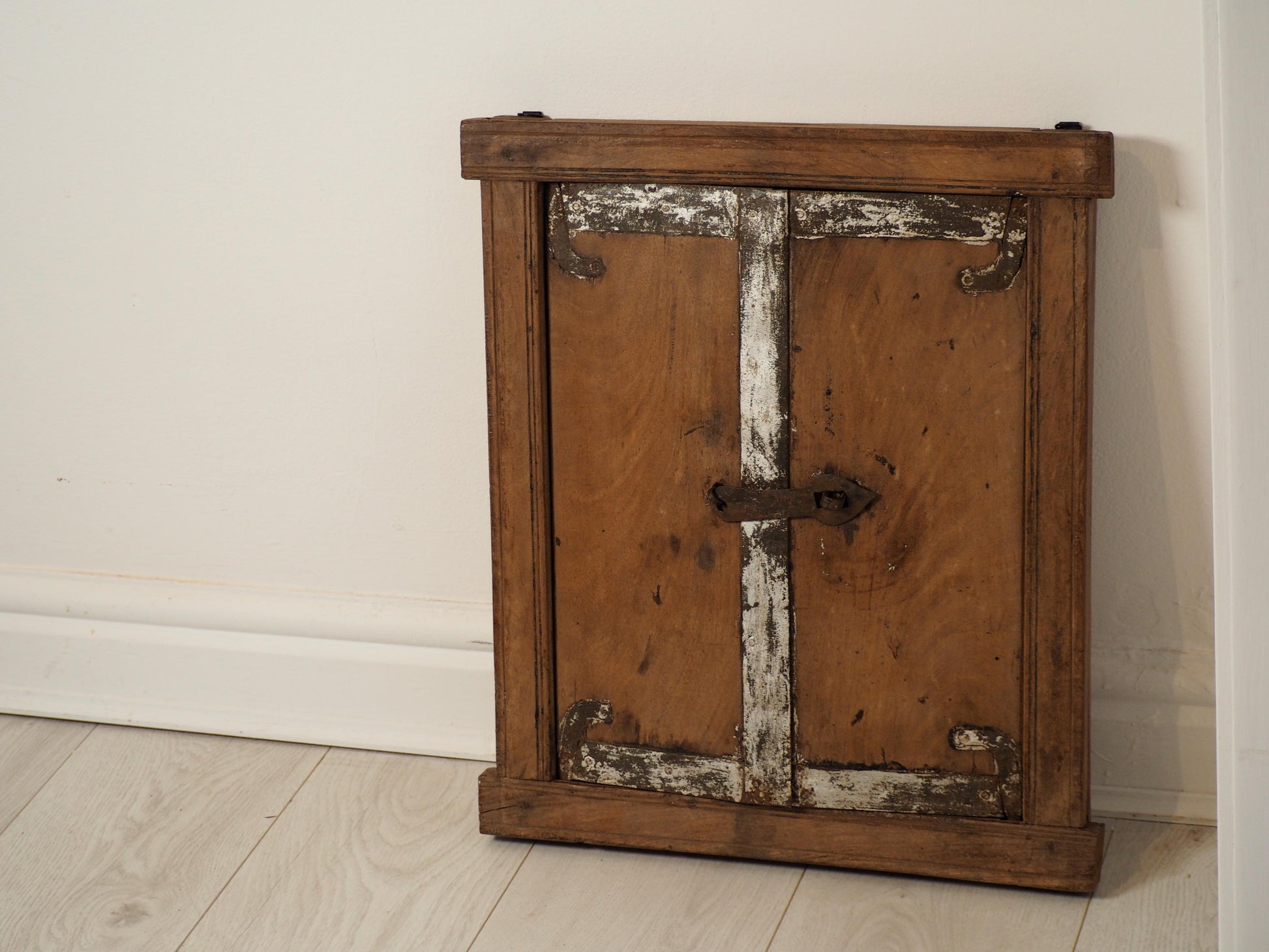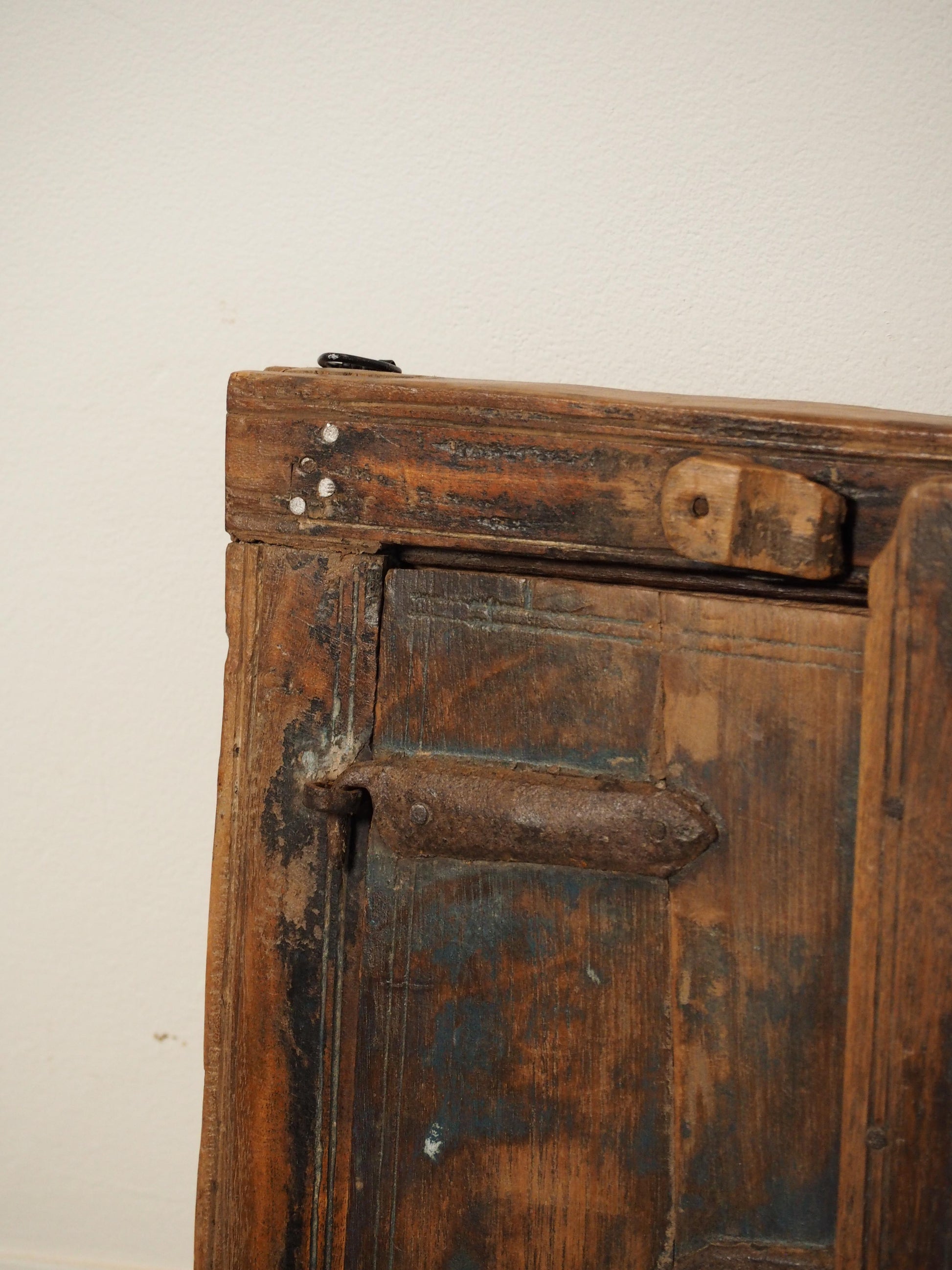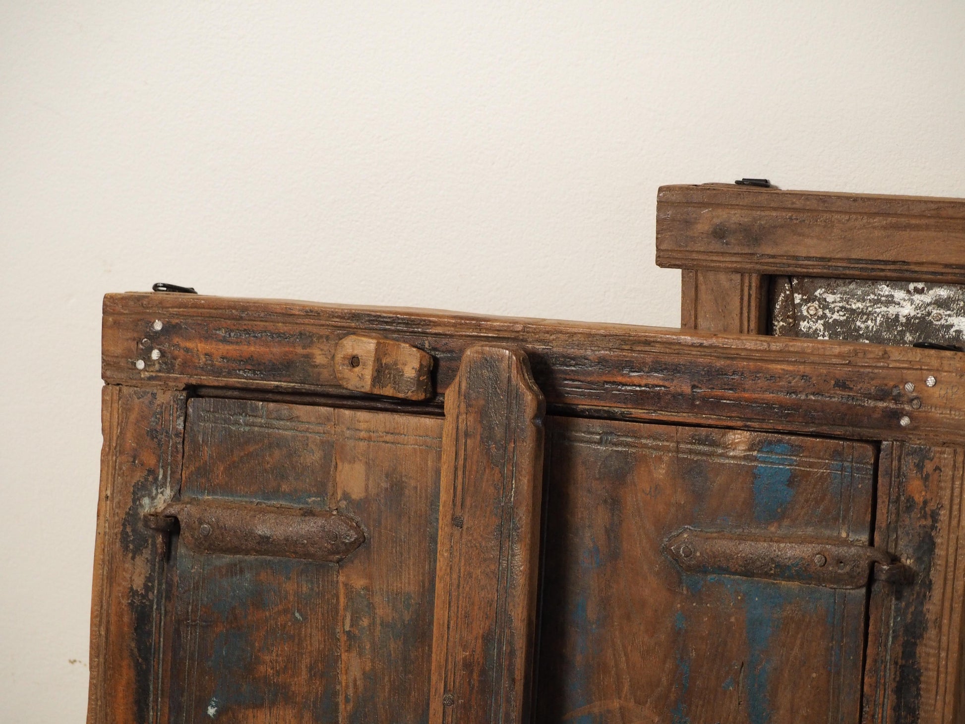 A lovely rustic antique Indian shutter window with metal latch and colourful original paint detailing. It originally would have been used as a window to allow ventilation and natural light into indoor spaces, essential for maintaining air circulation and creating a comfortable environment. Now, it makes a beautiful piece of decorative wall art, and includes two fixtures on the back ready to be hung.