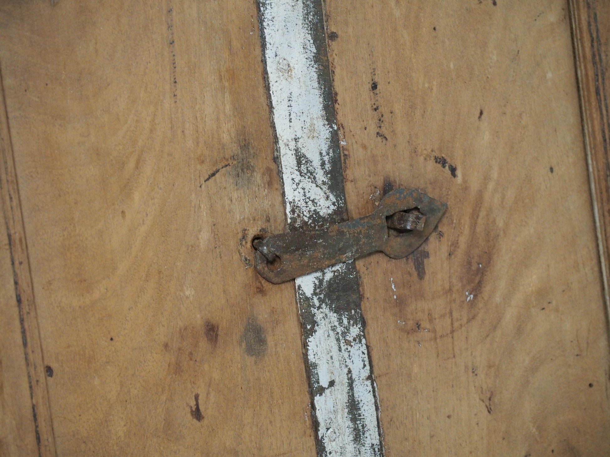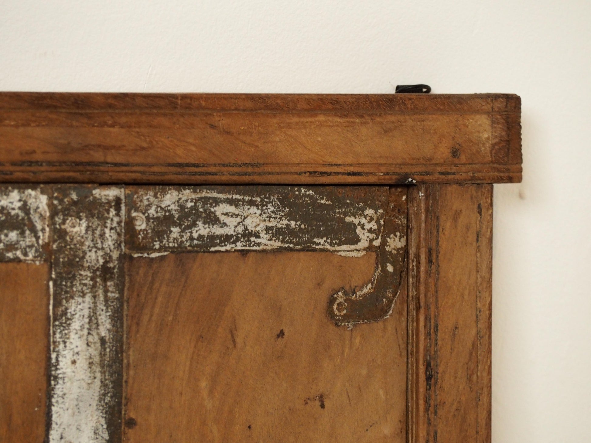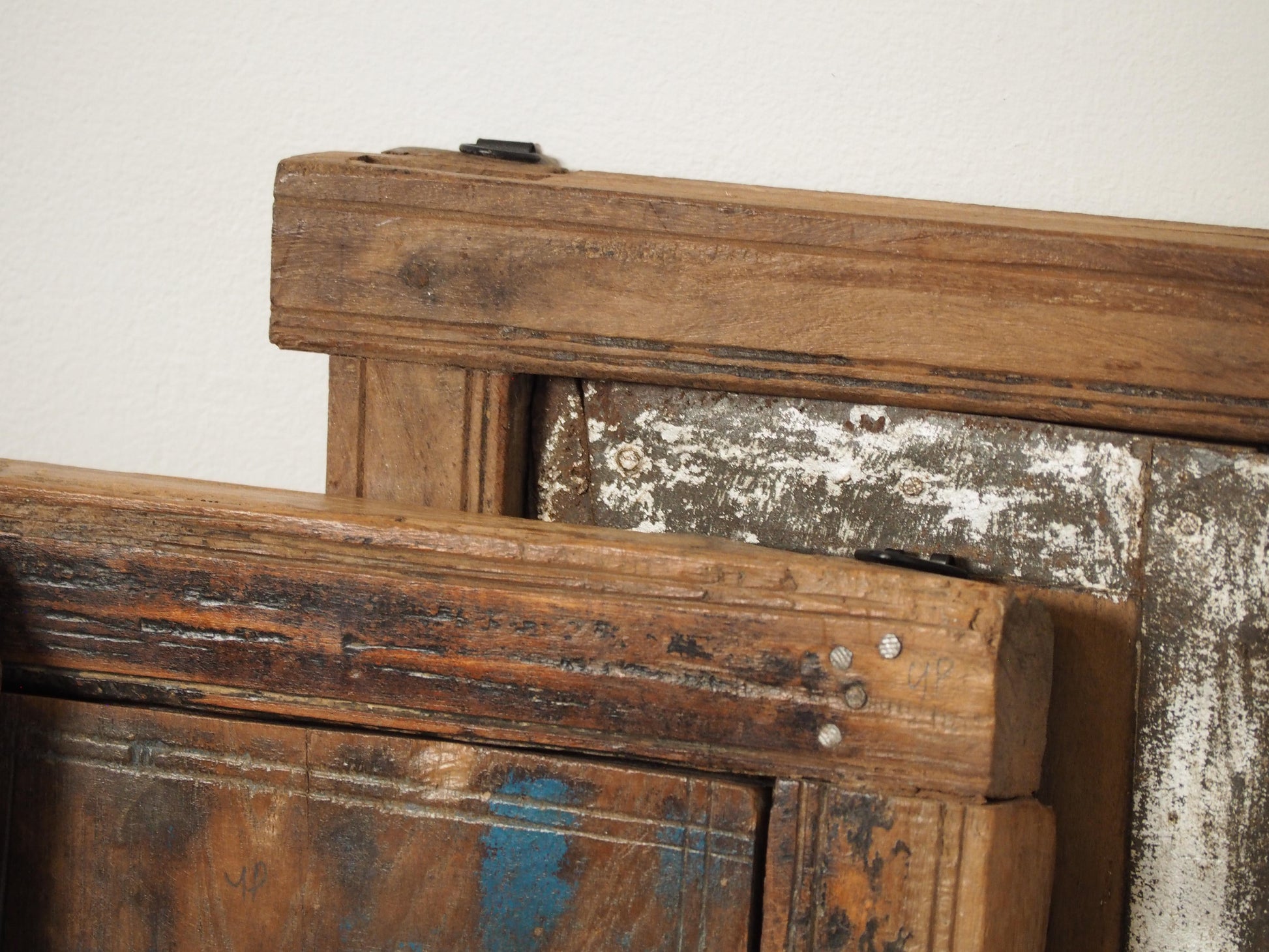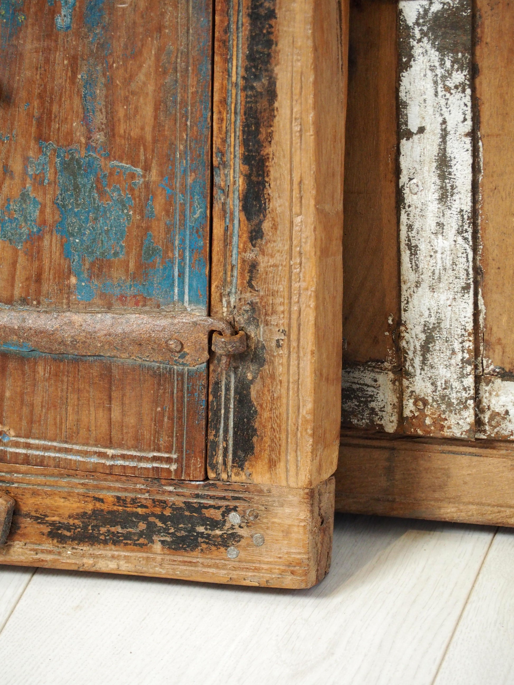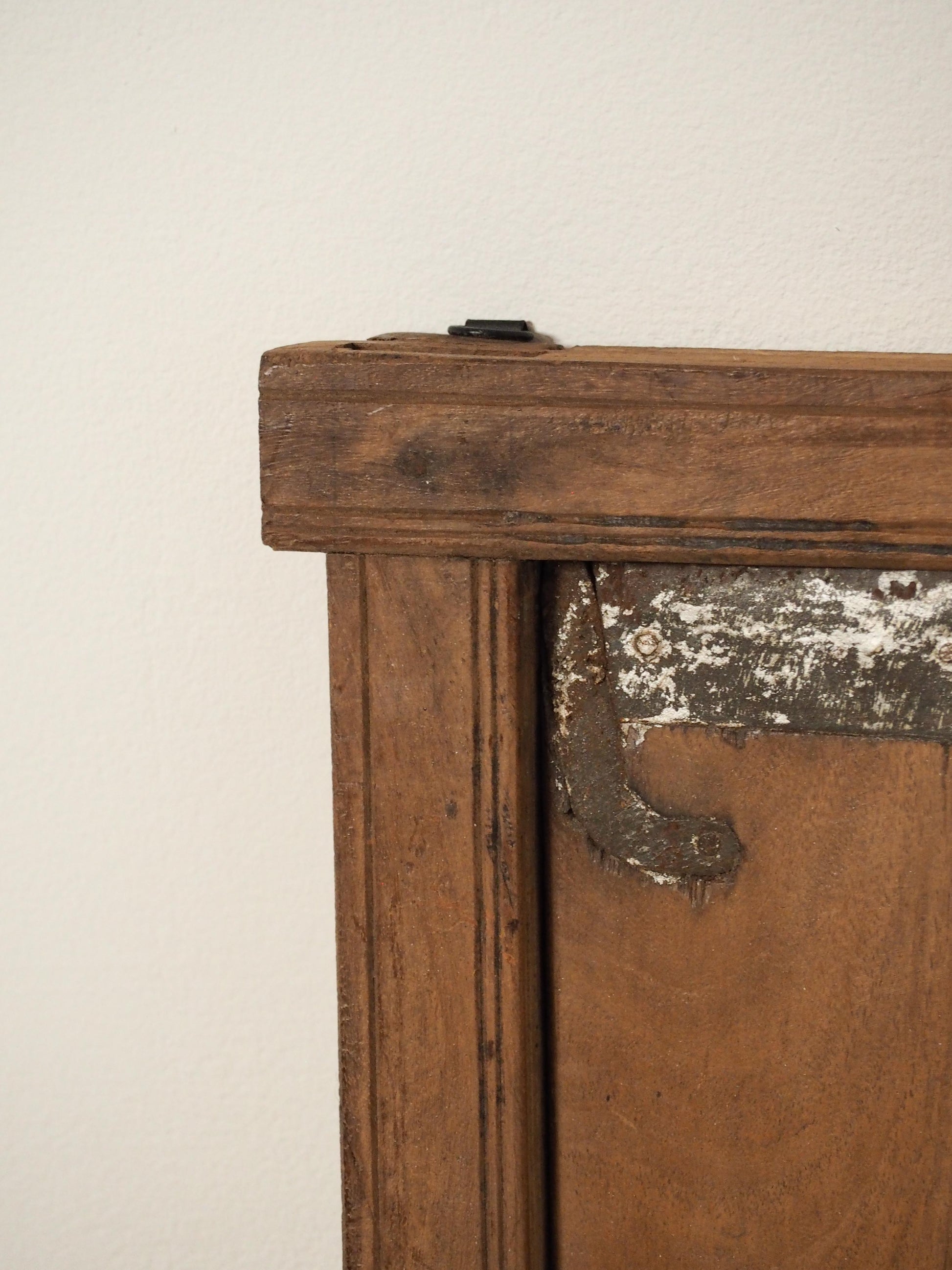 A lovely rustic antique Indian shutter window with metal latch and colourful original paint detailing. It originally would have been used as a window to allow ventilation and natural light into indoor spaces, essential for maintaining air circulation and creating a comfortable environment. Now, it makes a beautiful piece of decorative wall art, and includes two fixtures on the back ready to be hung.