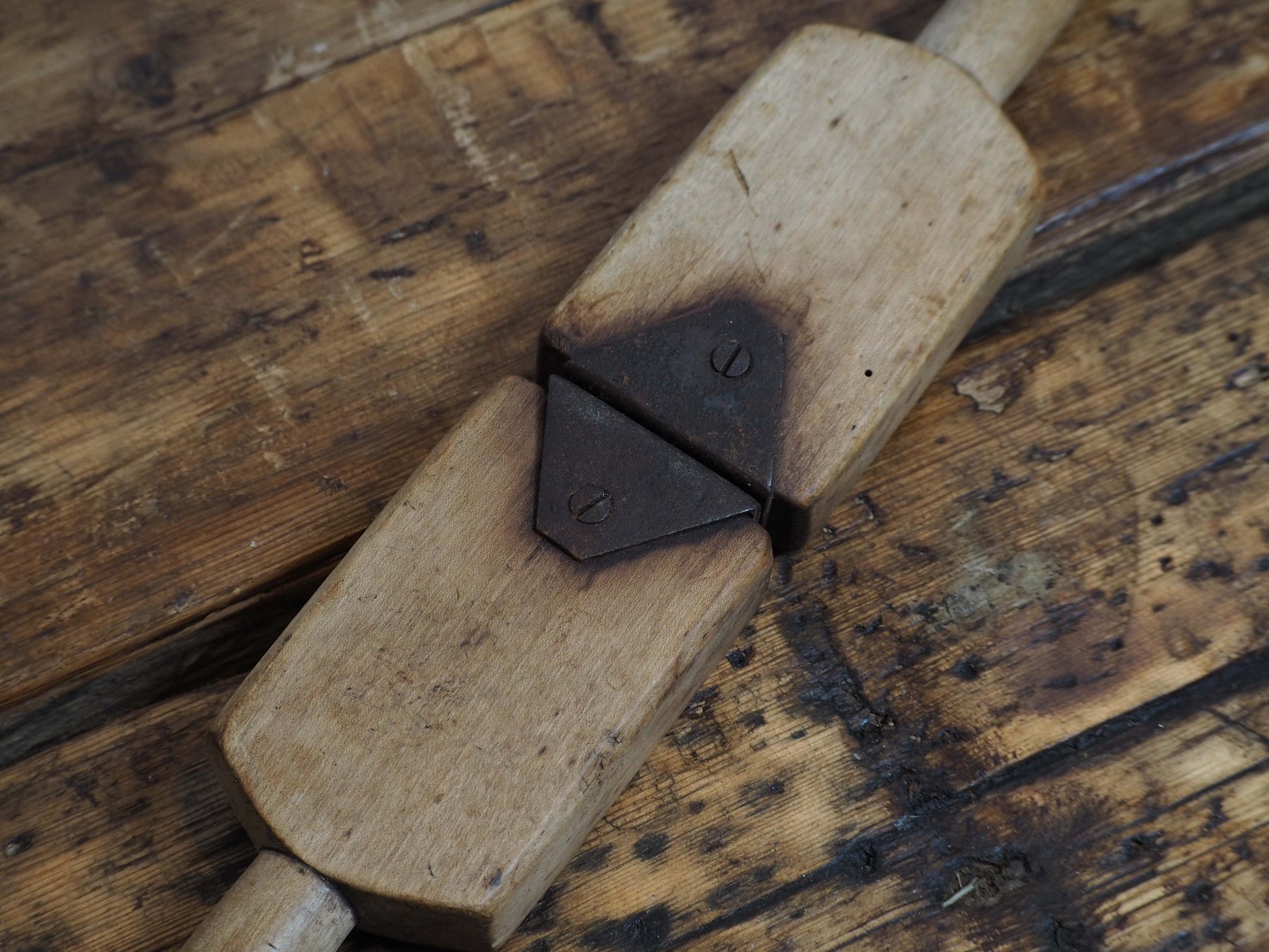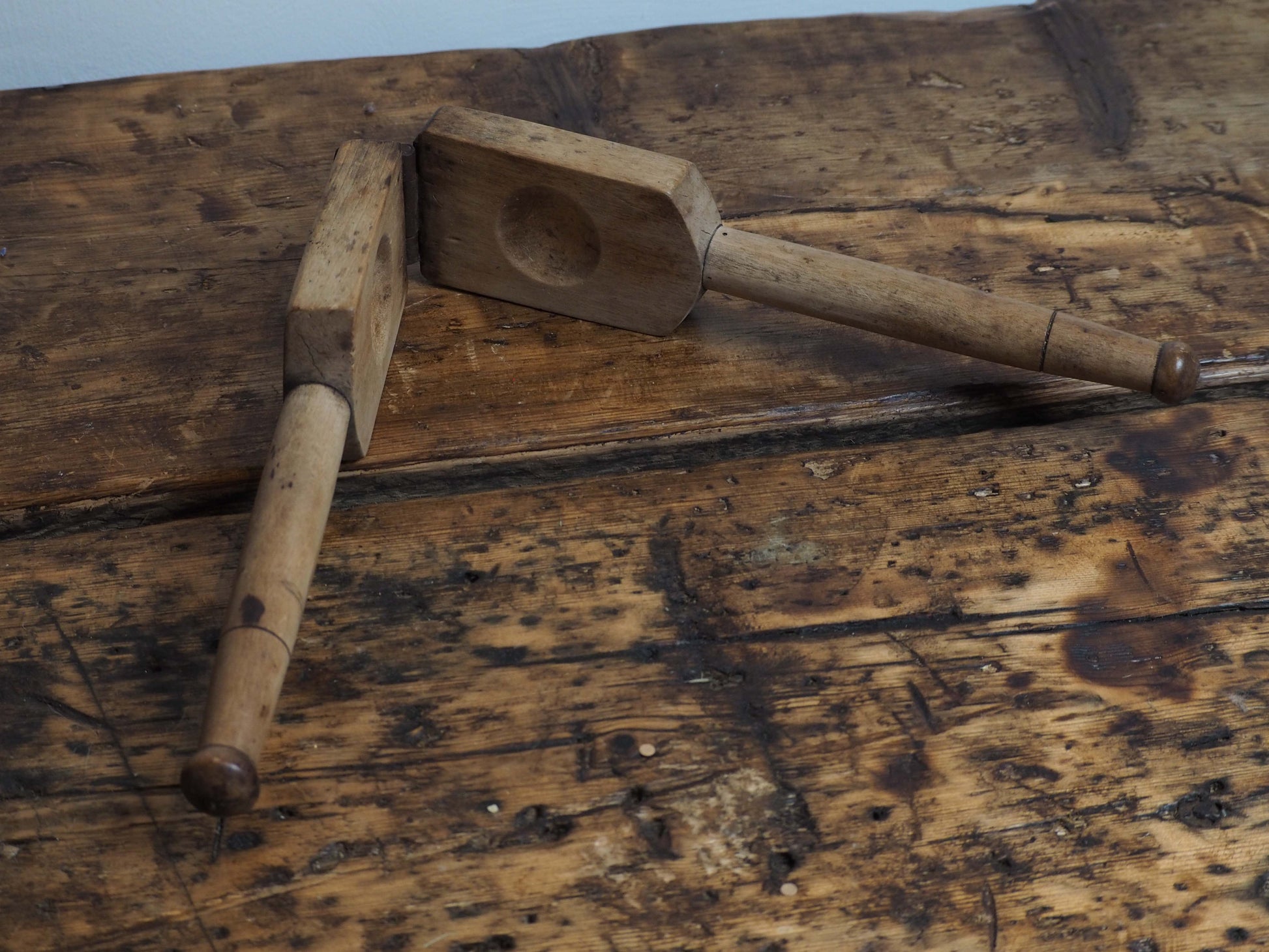 A lovely primitive antique wooden lemon squeezer. Features two wooden paddles fixed together with a metal hinge. It has beautiful patina, and would make a great decorative item in any kitchen.