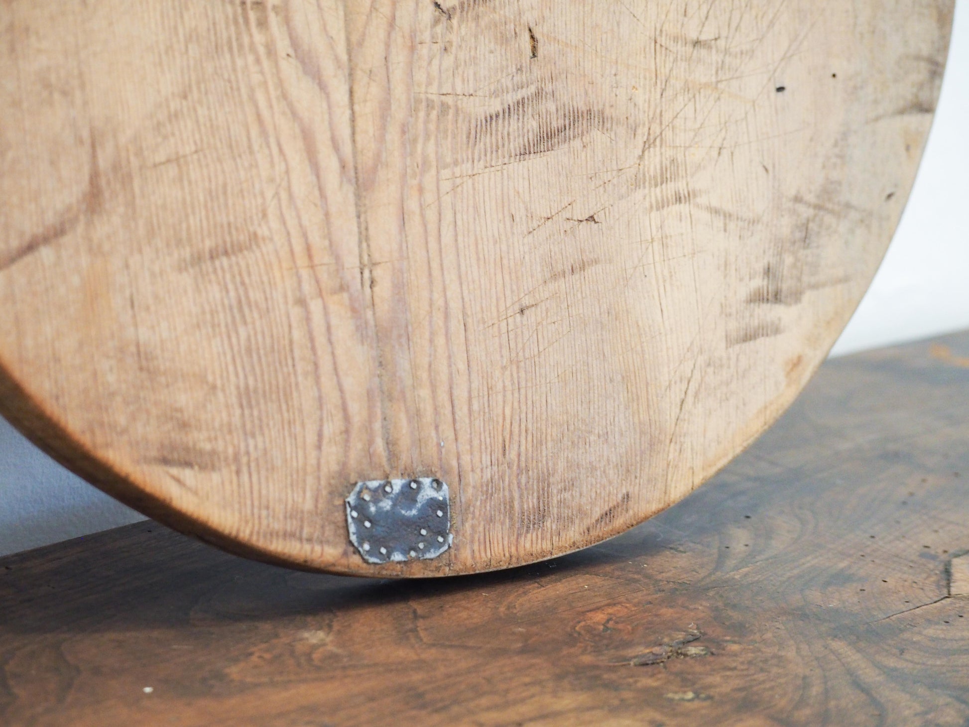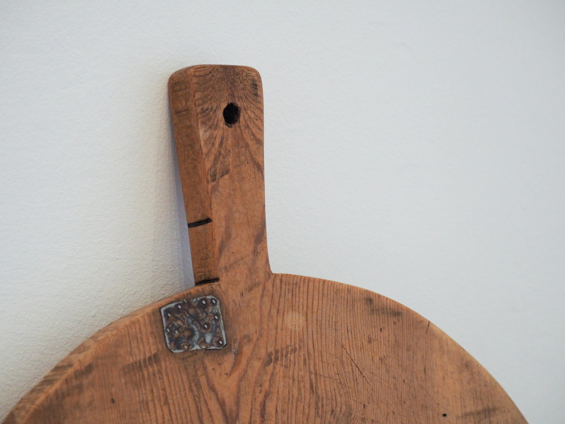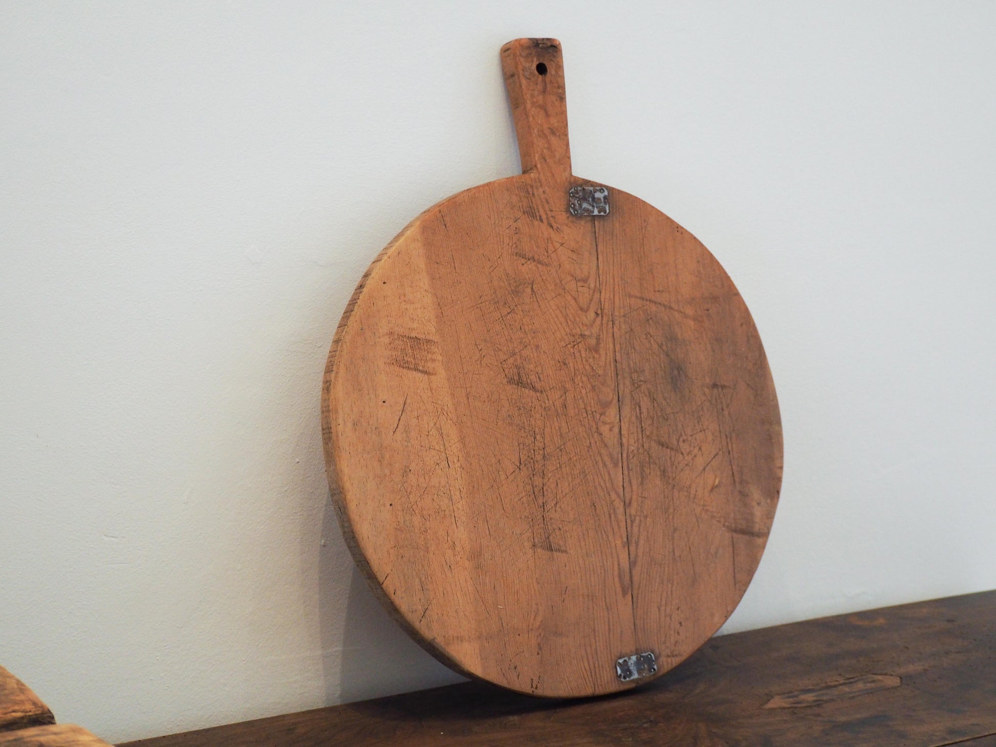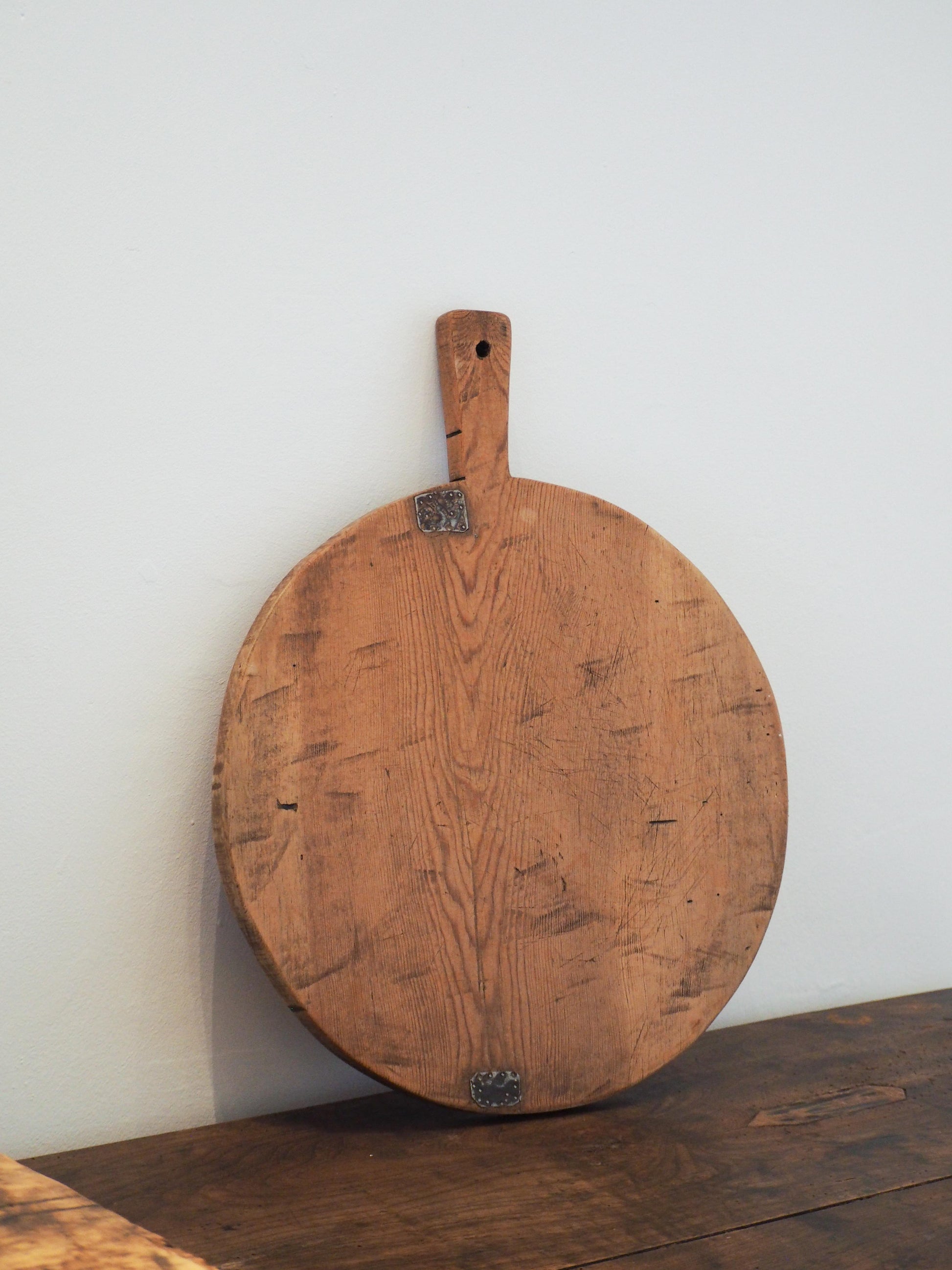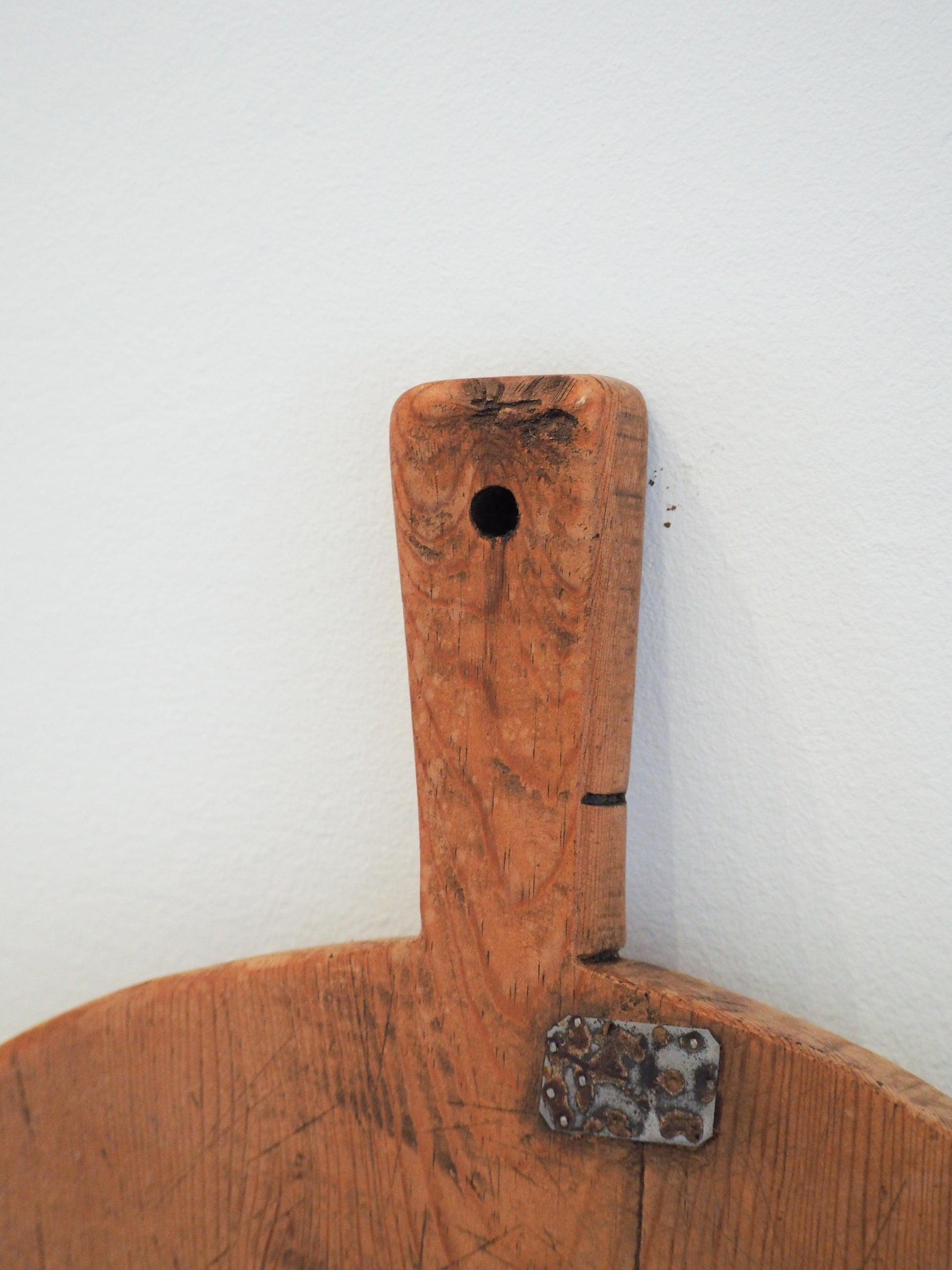 We have numerous boards in stock of varying sizes and tones. This particular board features old metal repairs and a hole in the handle for hanging.
