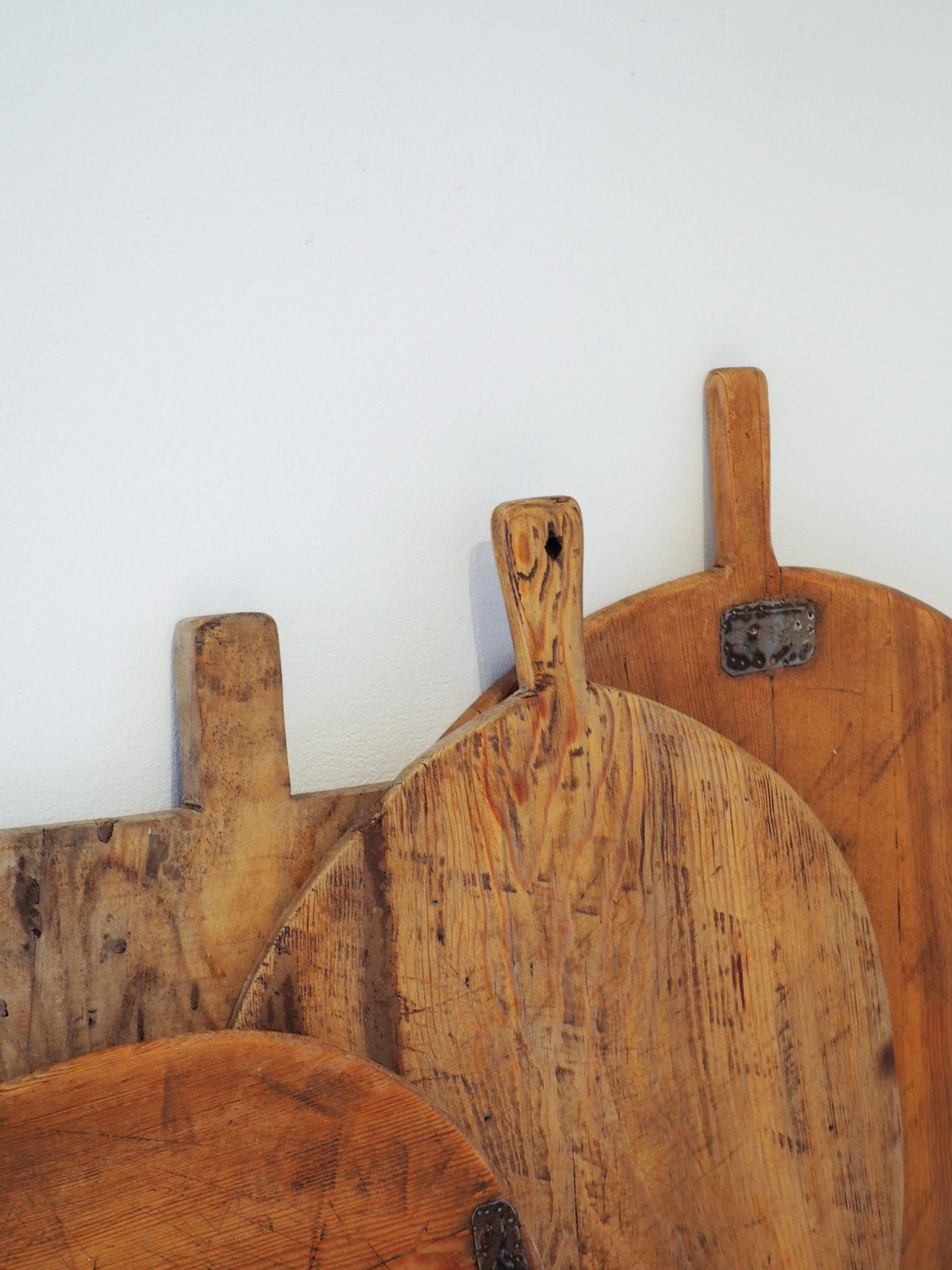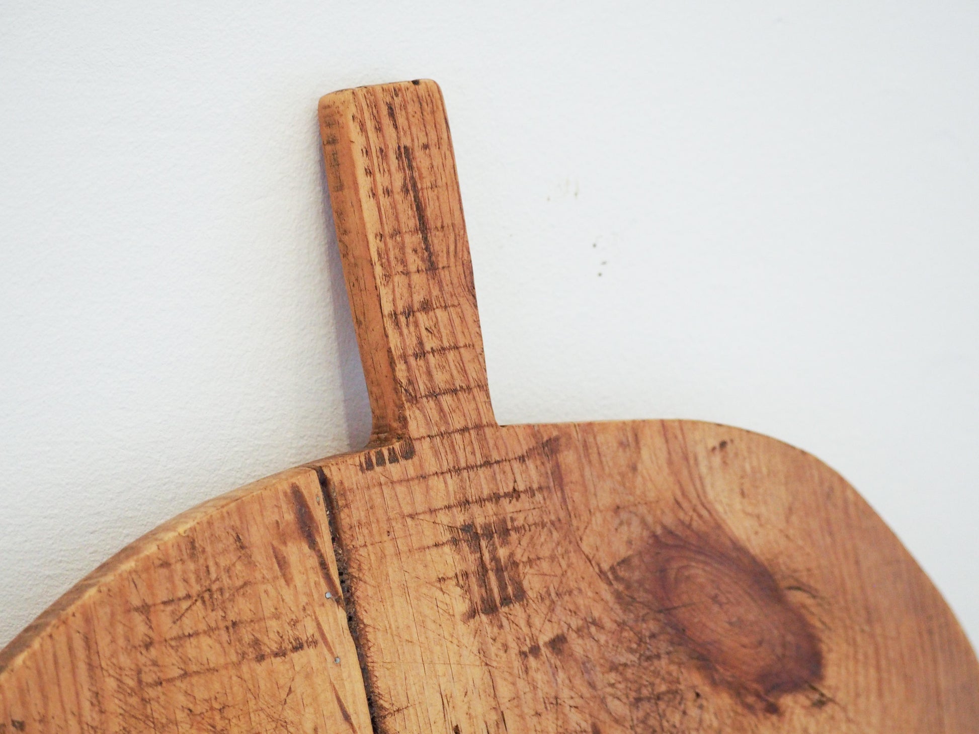 We have numerous boards in stock of varying sizes and tones. This particular board features old metal repairs and a hole in the handle for hanging.