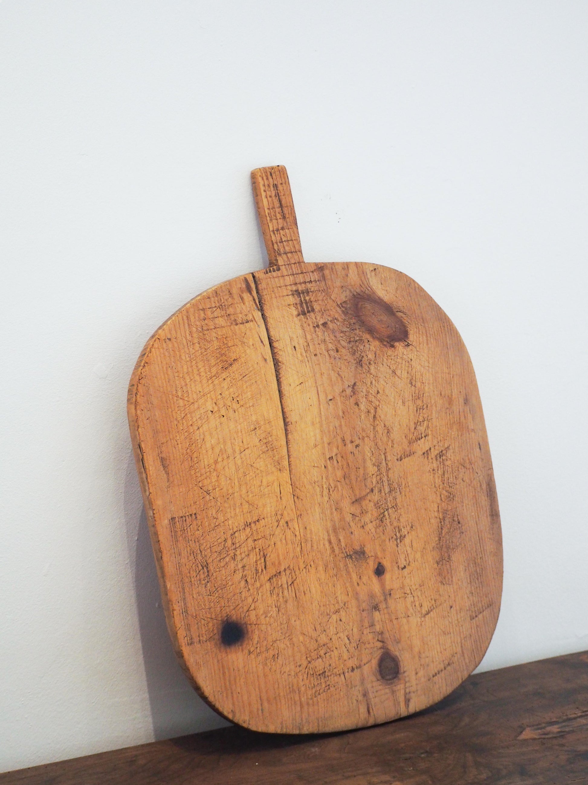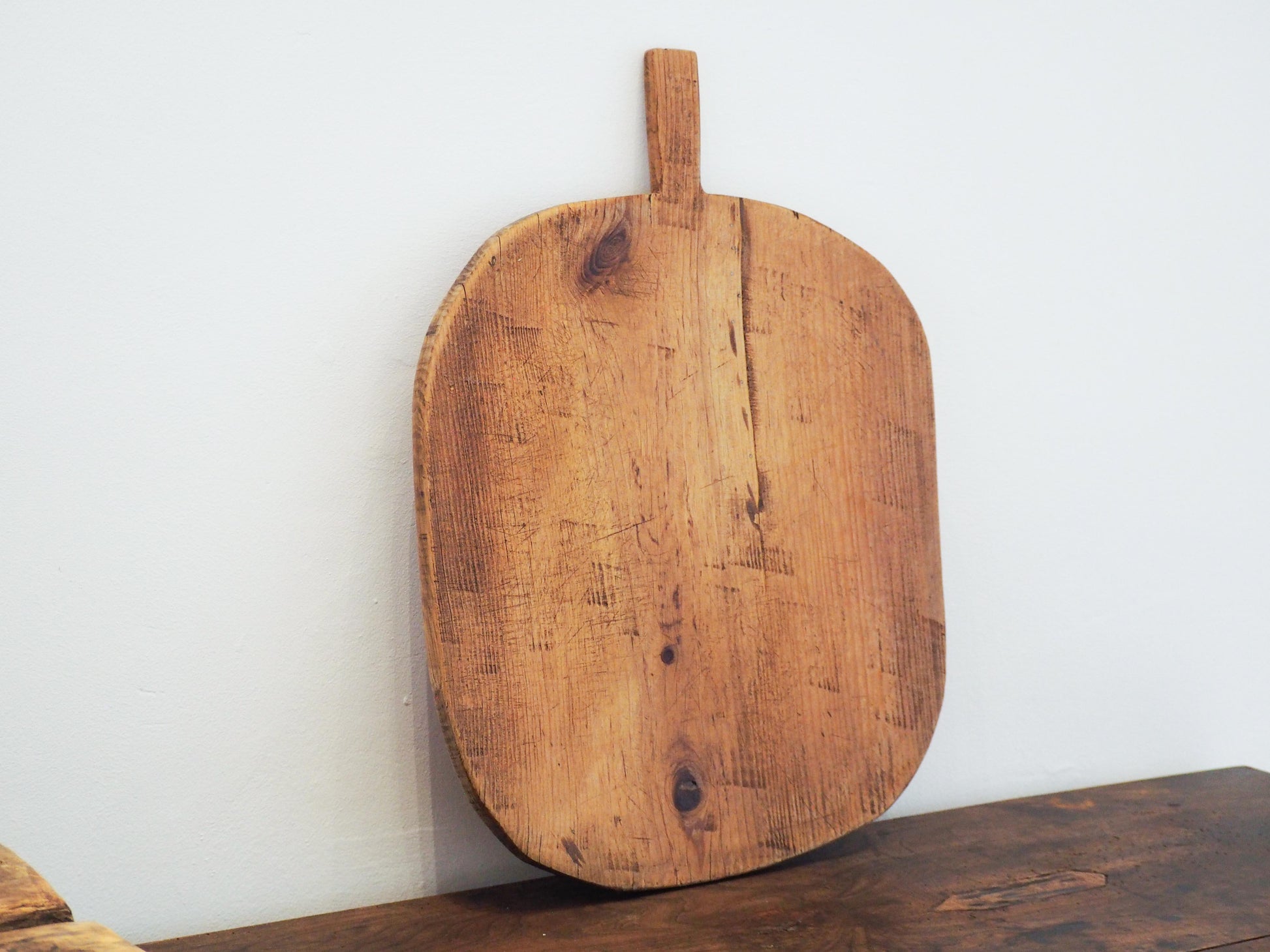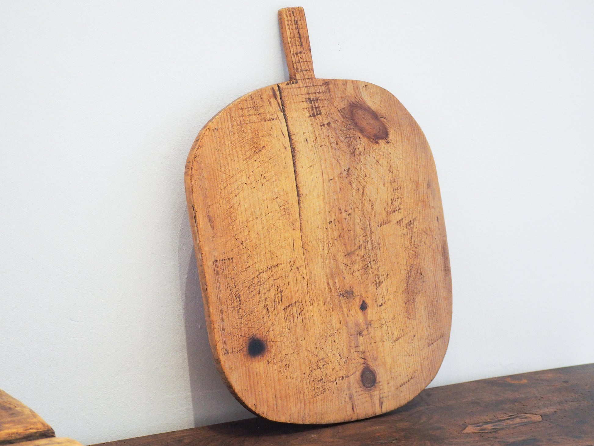 A beautiful rustic wooden bread board originally from Turkey. Often made from a single piece of wood, they were used traditionally in bread making and are prized for their unique character and imperfections (like stains, splits, or repairs), and farmhouse charm. Now, they serve as decorative kitchen pieces or charcuterie platters, showcasing rich history and craftsmanship.