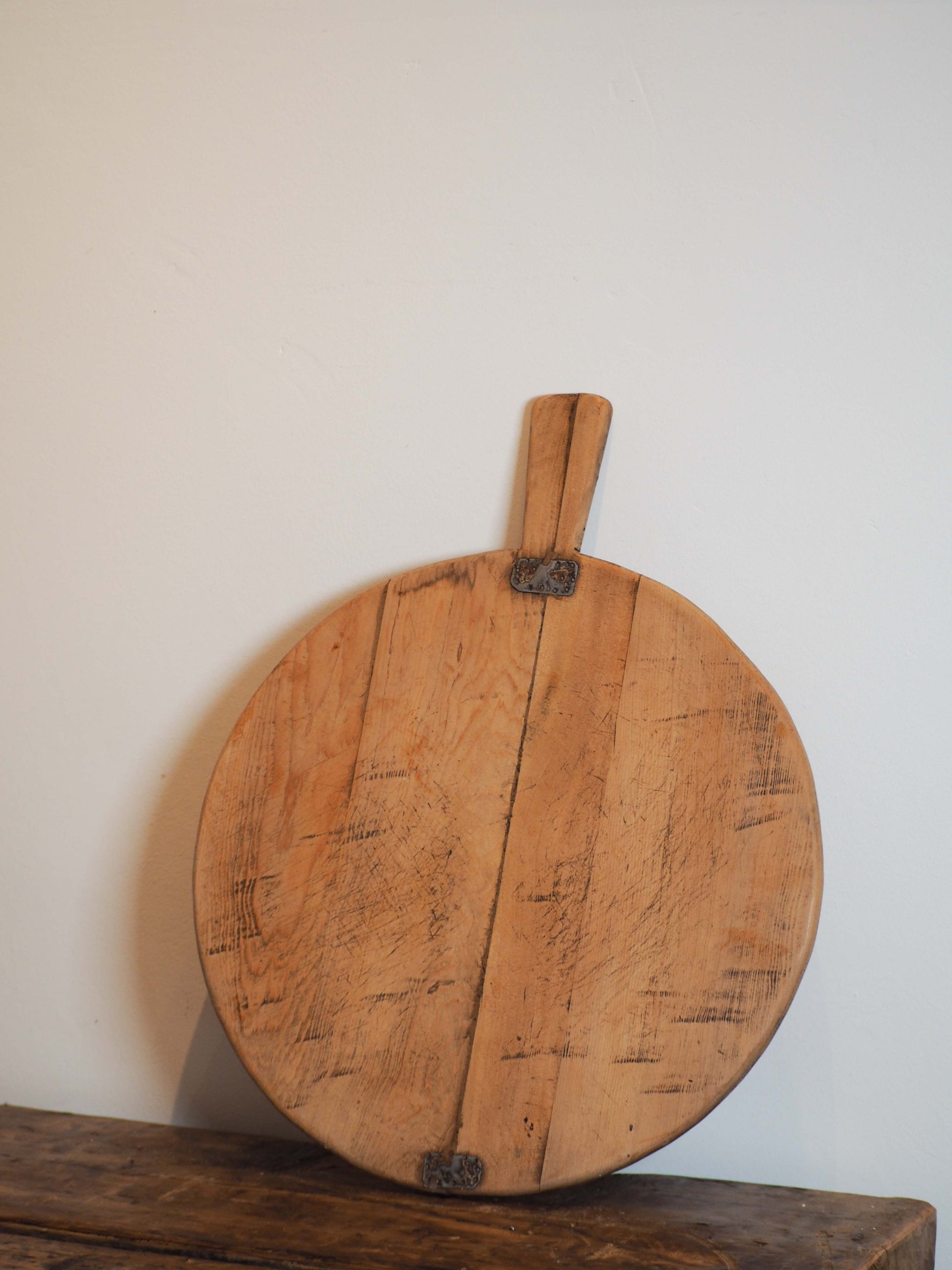 A beautiful rustic wooden bread board originally from Turkey. Often made from a single piece of wood, they were used traditionally in bread making and are prized for their unique character and imperfections (like stains, splits, or repairs), and farmhouse charm. Now, they serve as decorative kitchen pieces or charcuterie platters, showcasing rich history and craftsmanship.