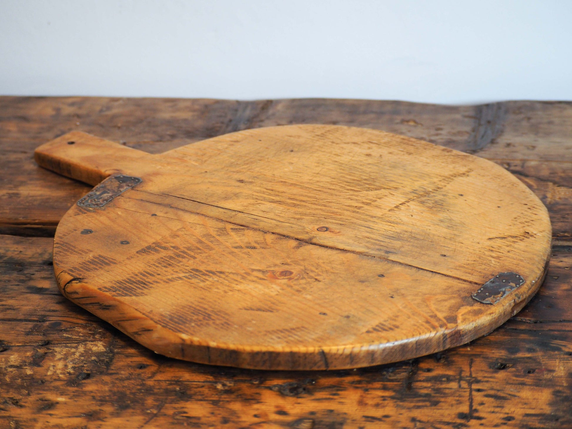 A beautiful rustic wooden bread board originally from Turkey. Often made from a single piece of wood, they were used traditionally in bread making and are prized for their unique character and imperfections (like stains, splits, or repairs), and farmhouse charm. Now, they serve as decorative kitchen pieces or charcuterie platters, showcasing rich history and craftsmanship.