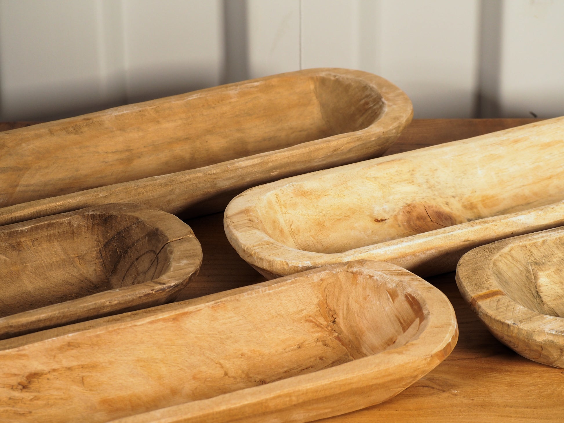 A beautiful hand made light weight long vintage rustic Baguette bowl in natural wood colour. It would make a fantastic decorative piece in the centre of a coffee table, or can be used to hold candles. Each bowl differs slightly from each other due to the handmade nature. We will send one bowl at random.