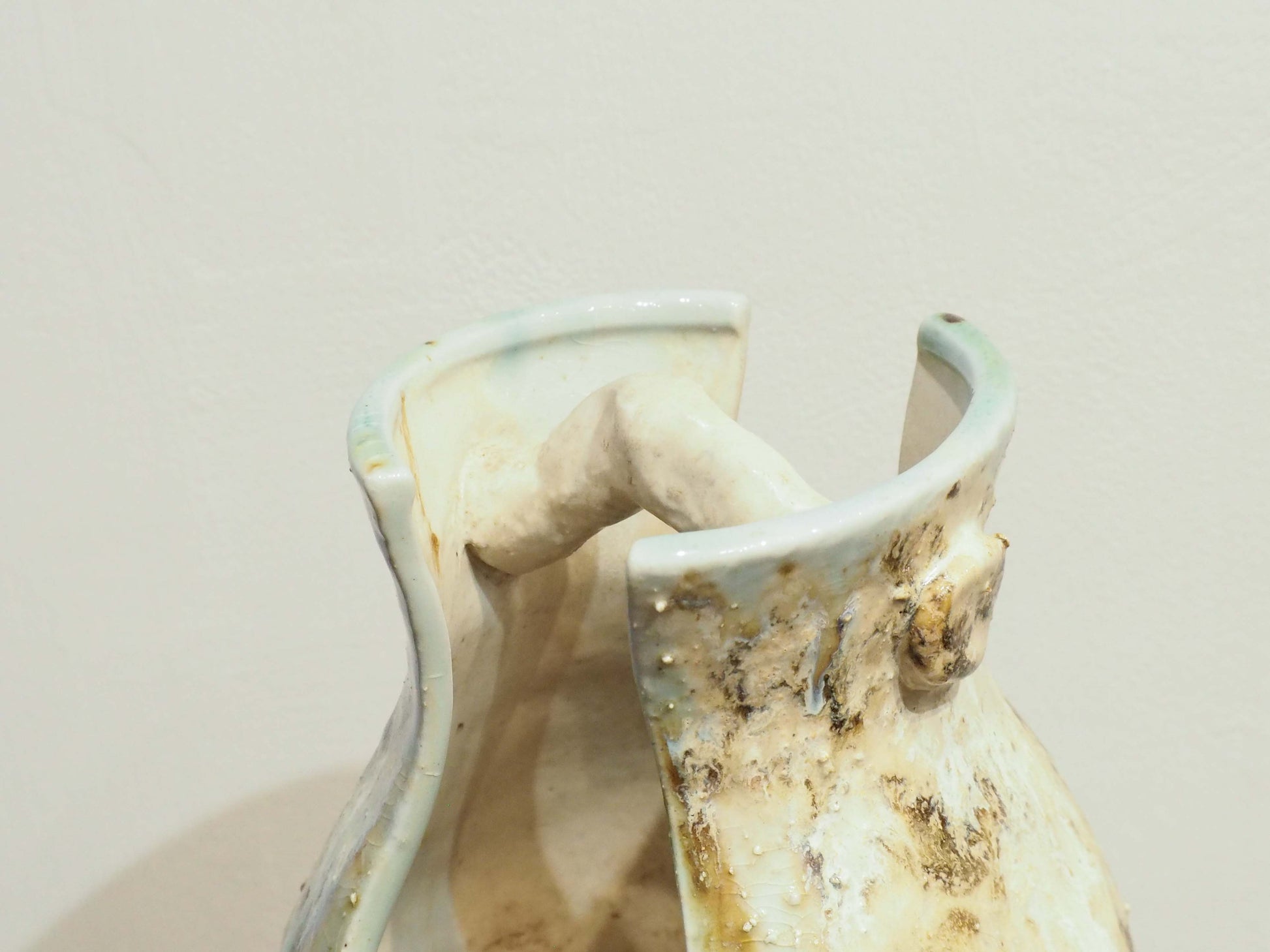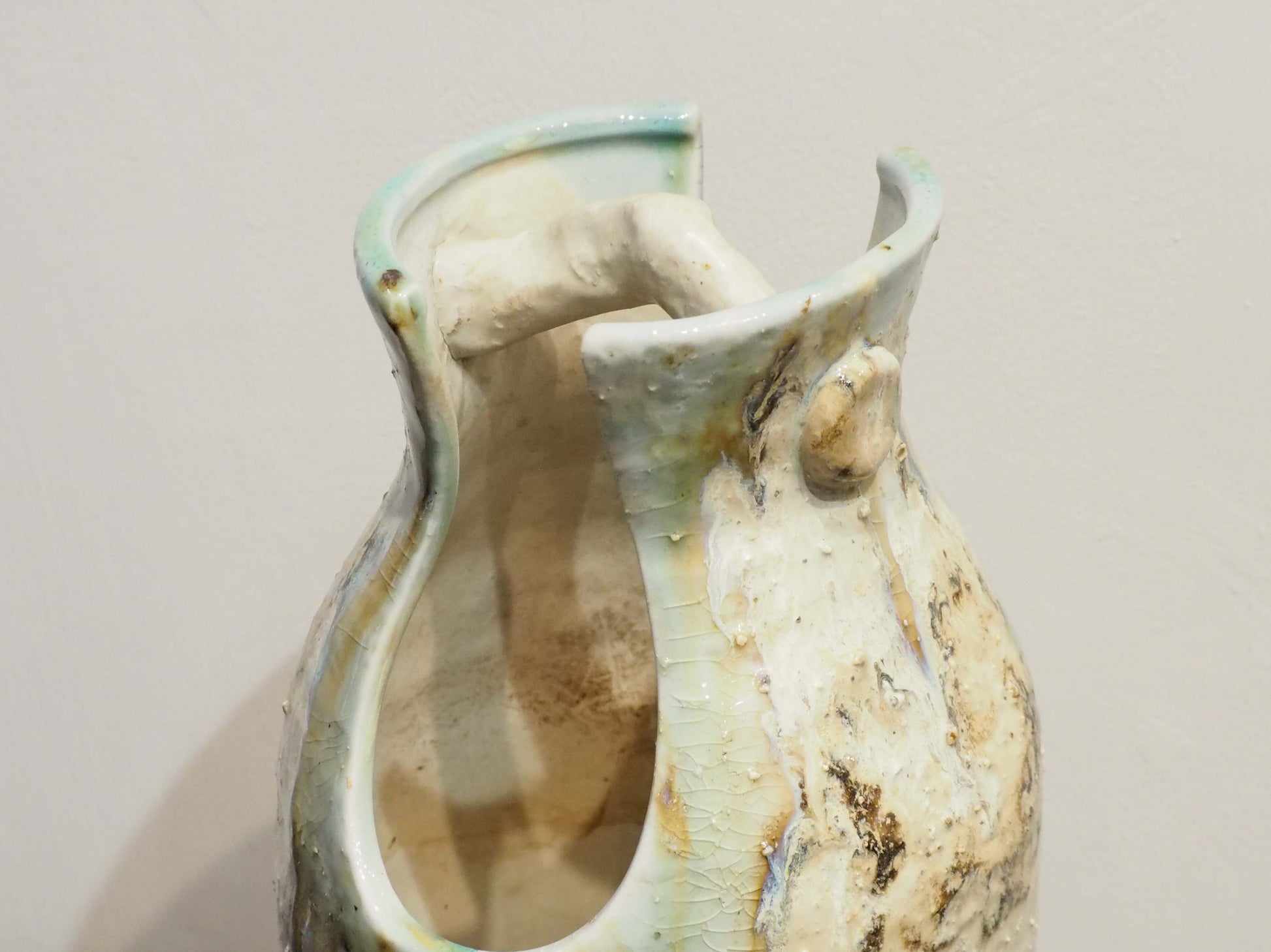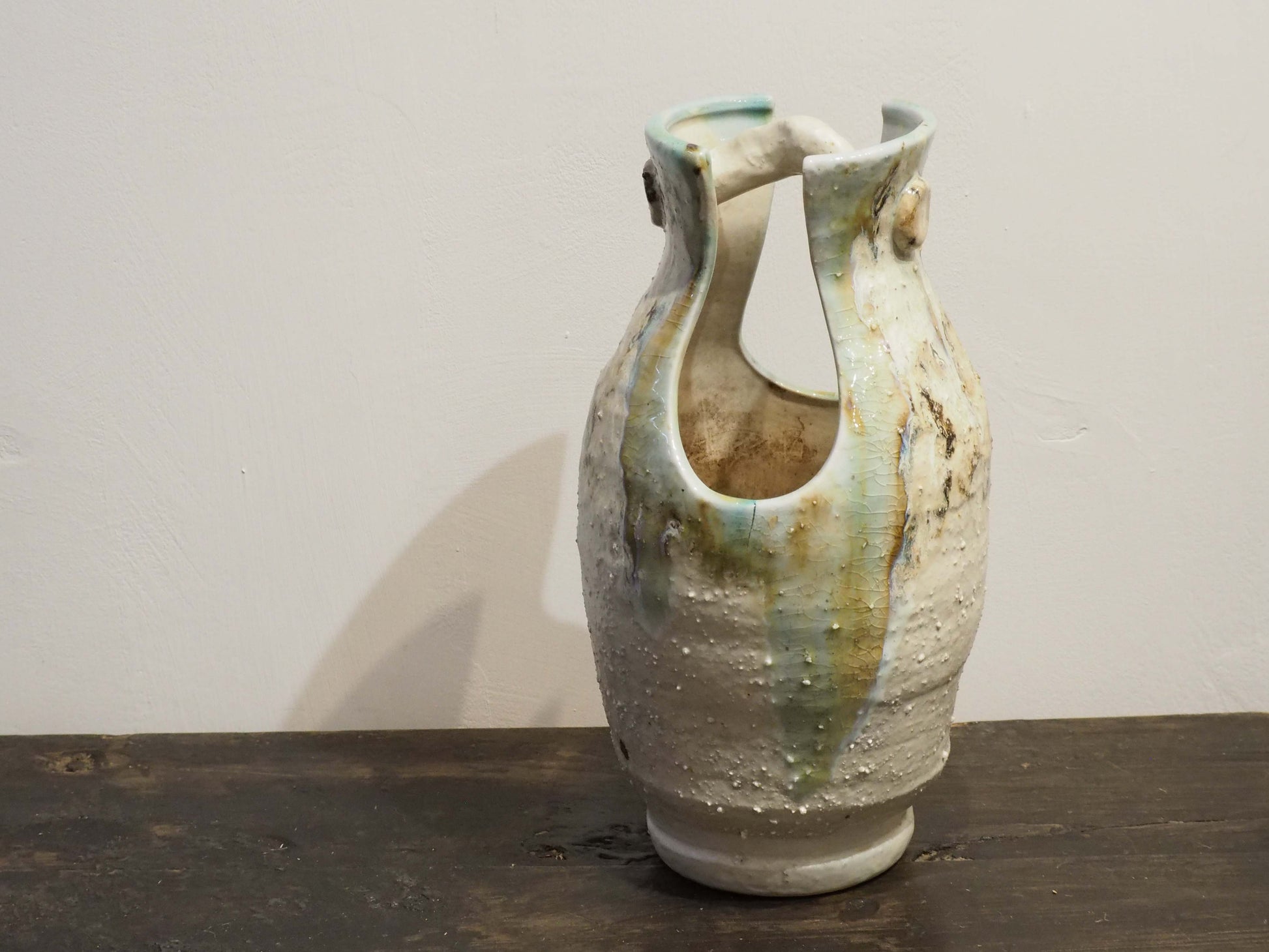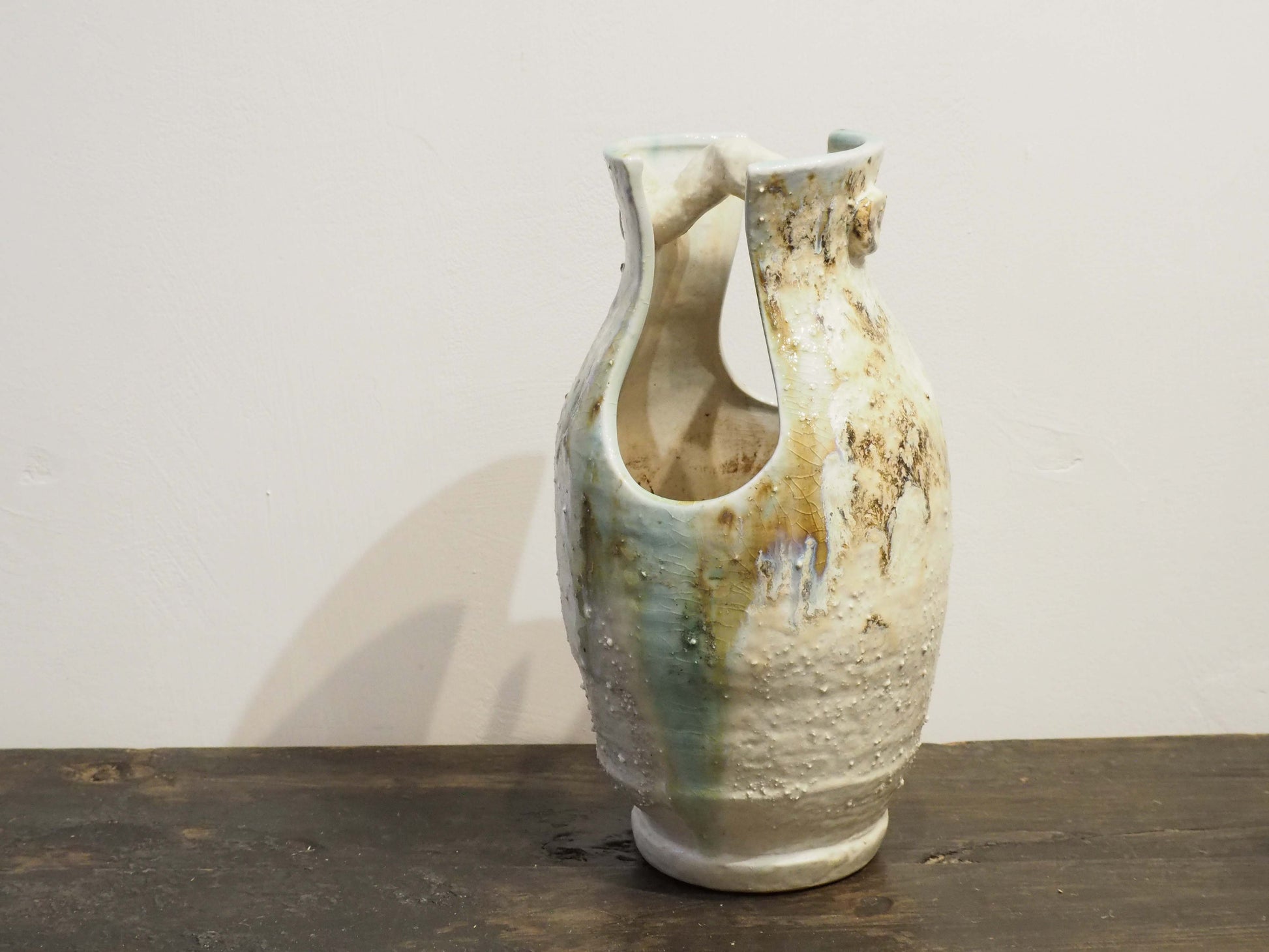 The glaze reveals an enchanting interplay of earthy tones: from cream and sand to pale green and teal, accentuated by a delicate craquelé texture. The granular surface and natural irregularities – hallmarks of wood-fired Shigaraki ware – lend the vase a vibrant, organic presence.