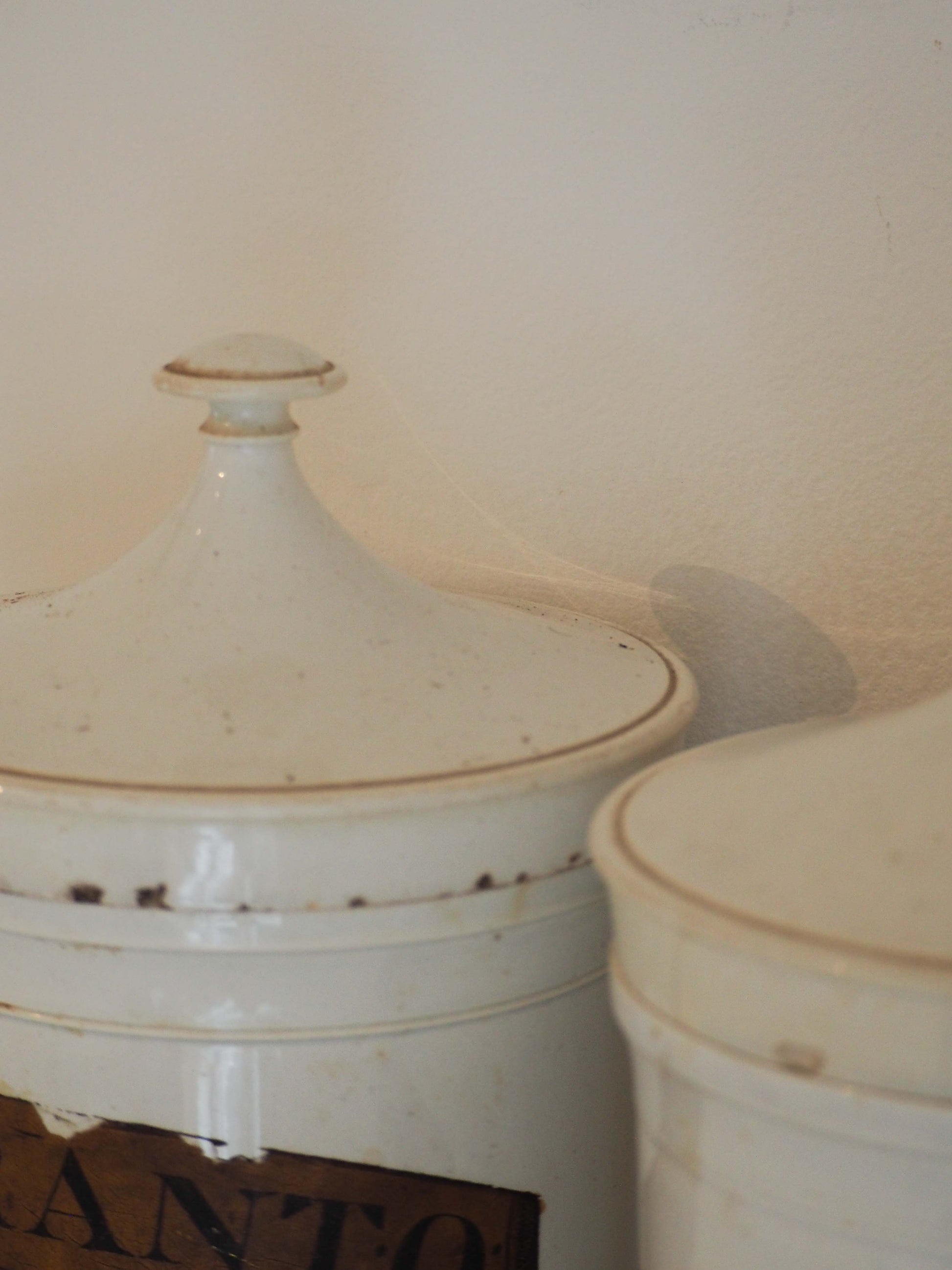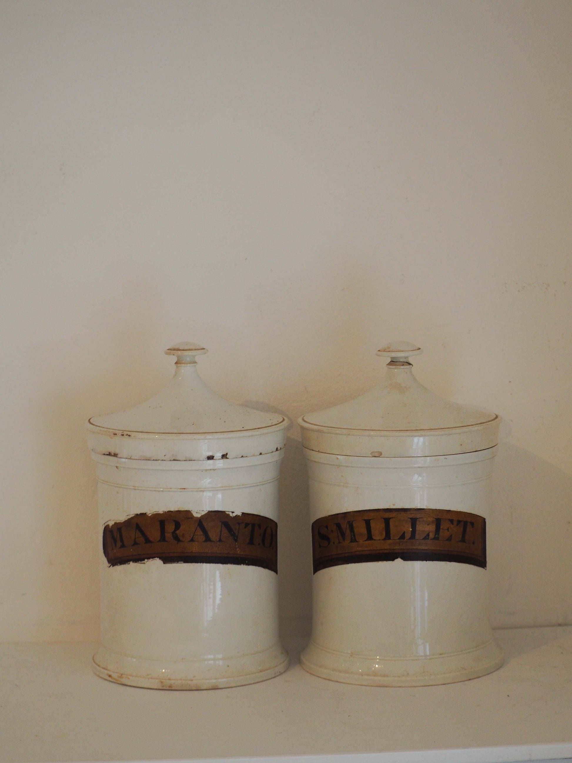 A pair of large white porcelain antique apothecary glass bottles with lids from the Victorian era. This particular style is rare, and the original labels are still in tact. Traditionally, these jars were used by apothecaries (early pharmacists) to store medicines, herbs and other ingredients.