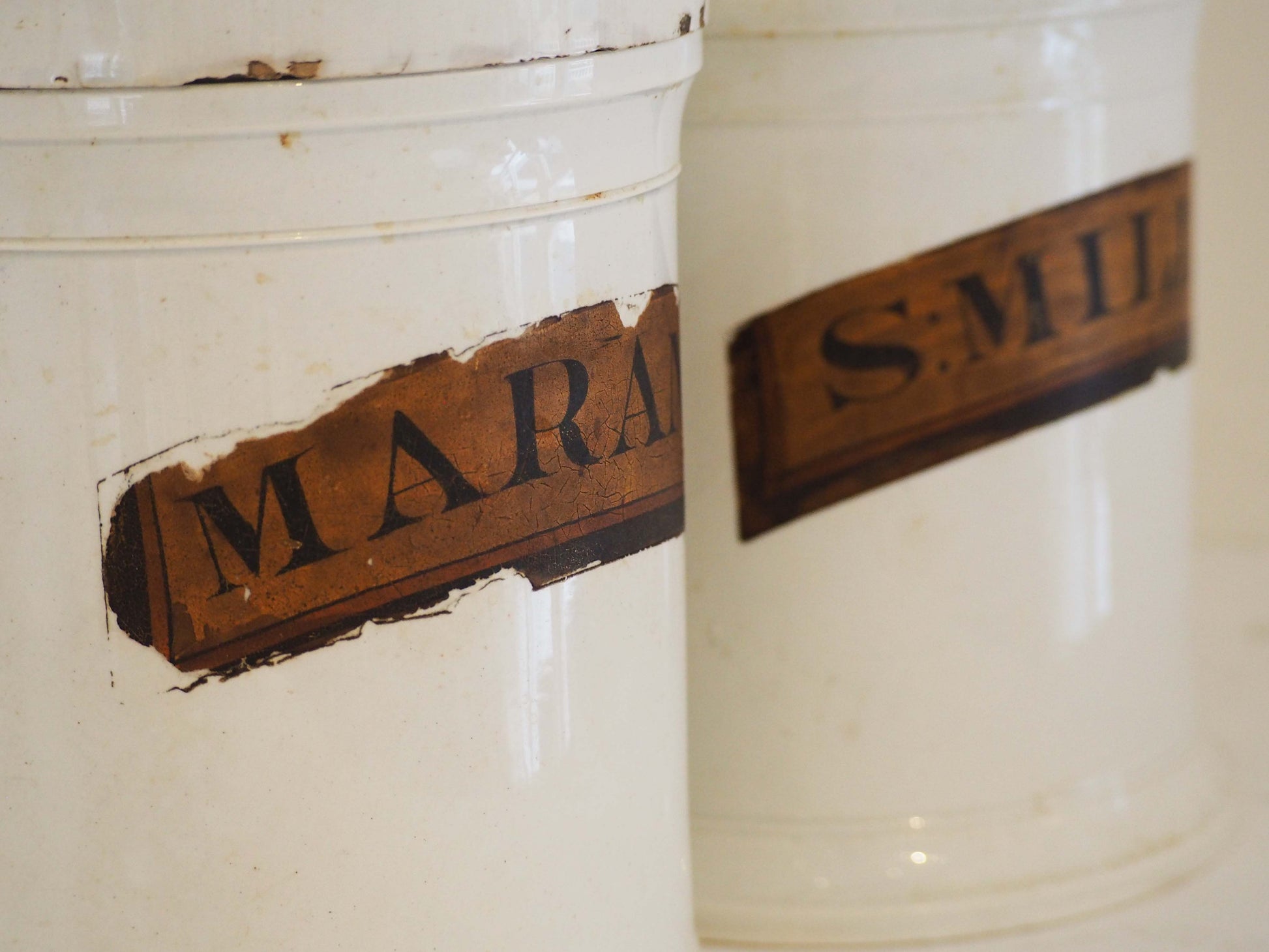 Pair of Vintage / Antique Large White Porcelain Apothecary Chemist Bottles With Original Labels