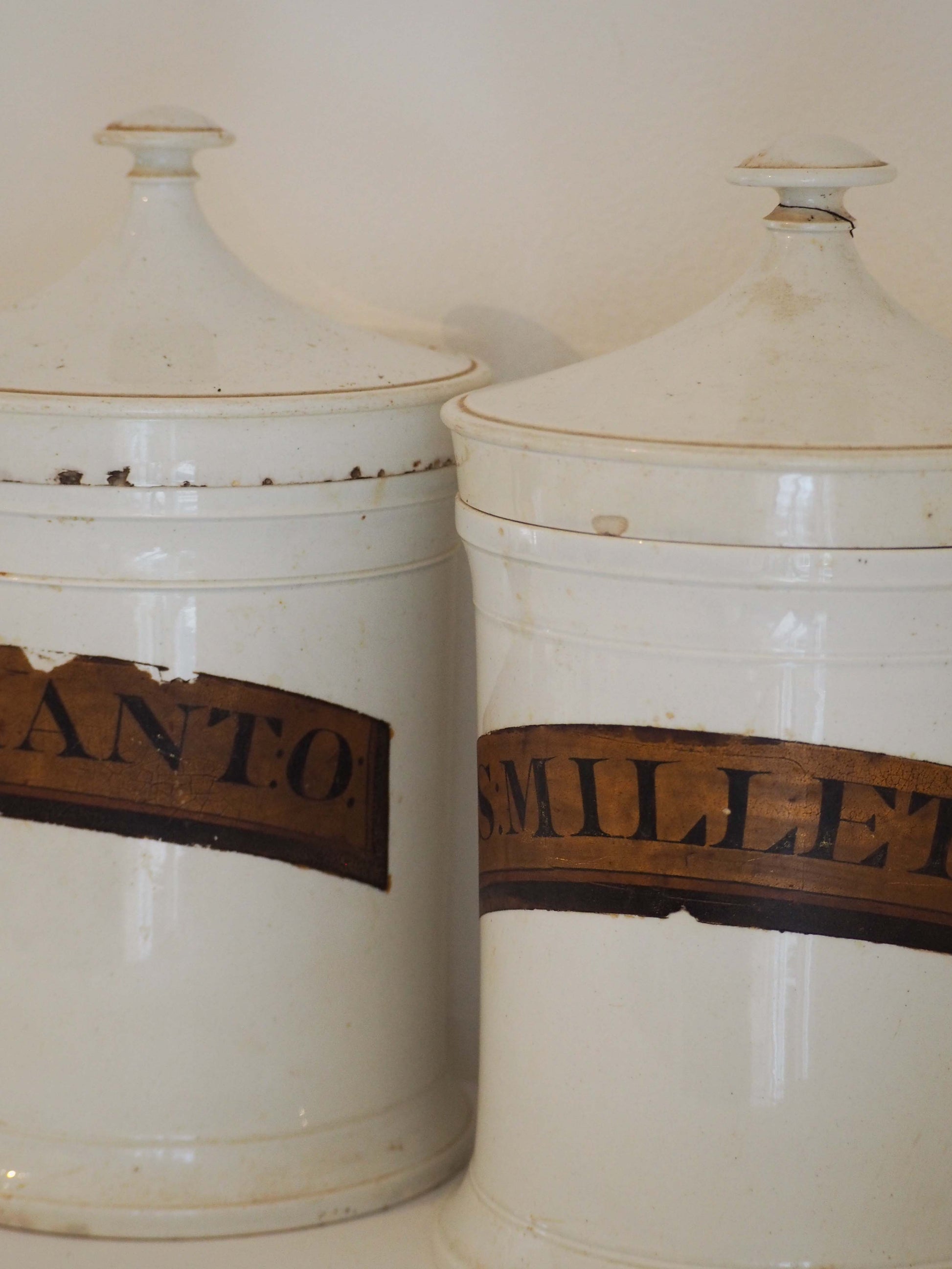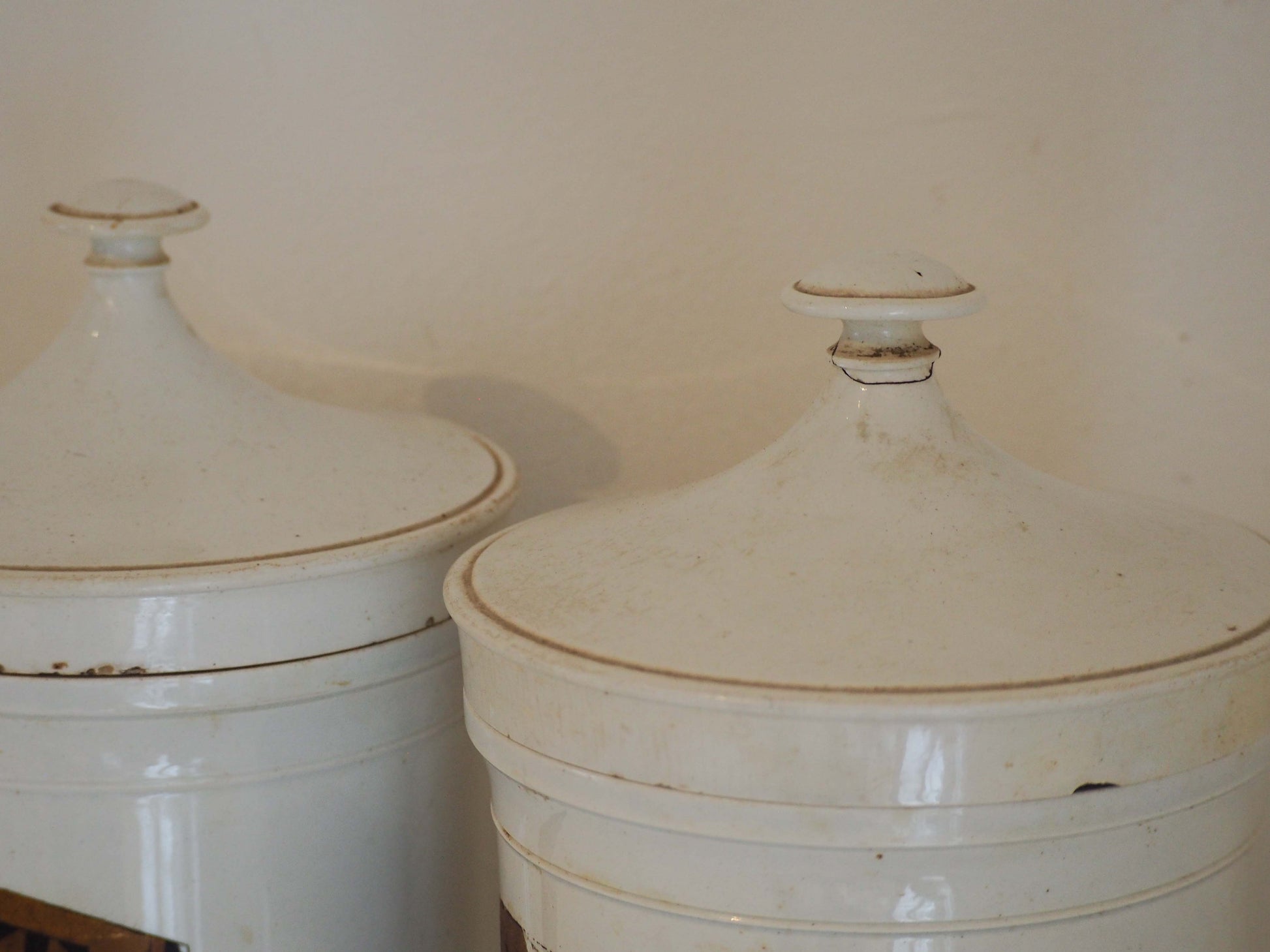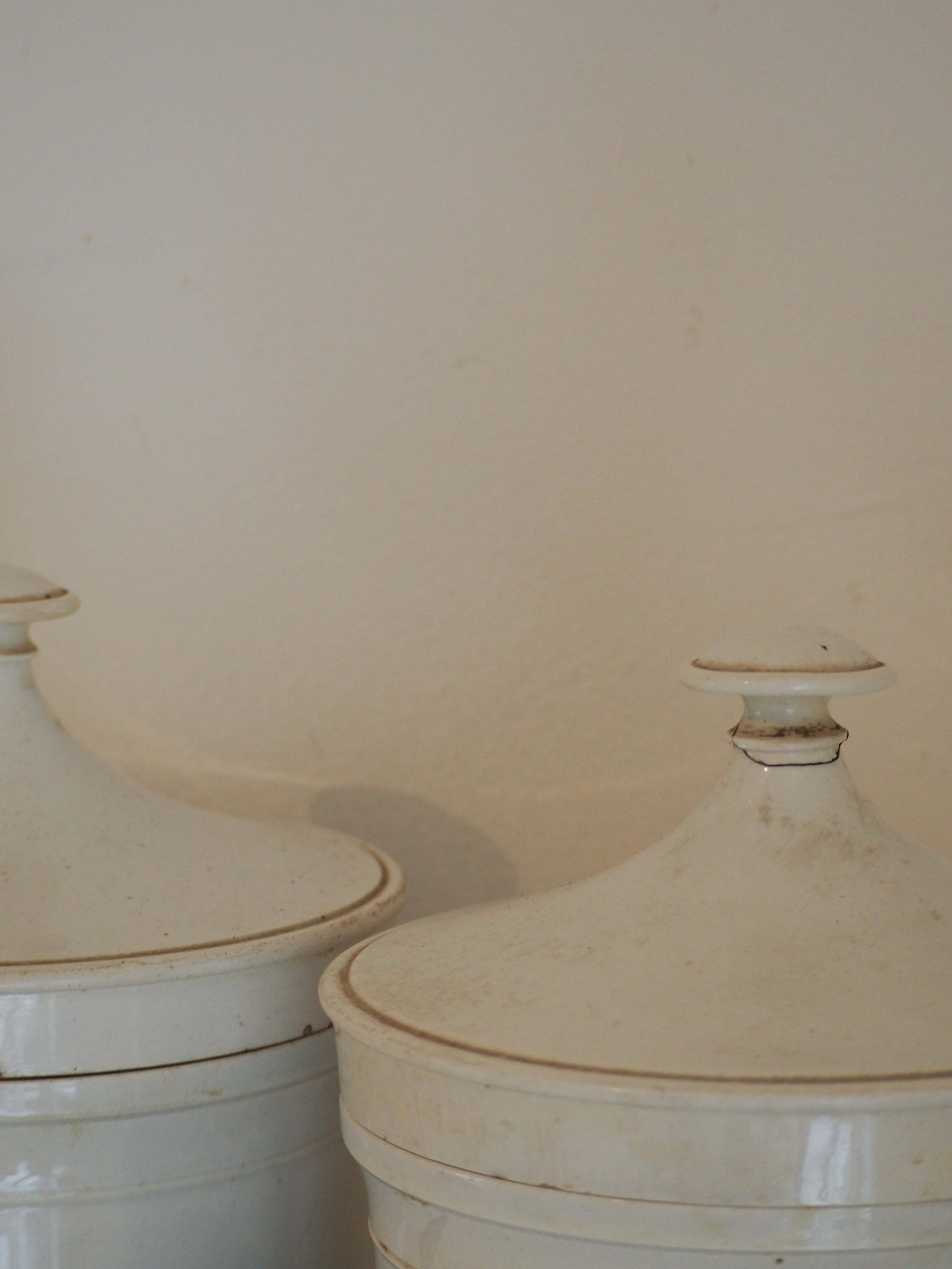 There is a minor crack on one of the lid handles (please refer to photographs), but otherwise they are in very good original condition.