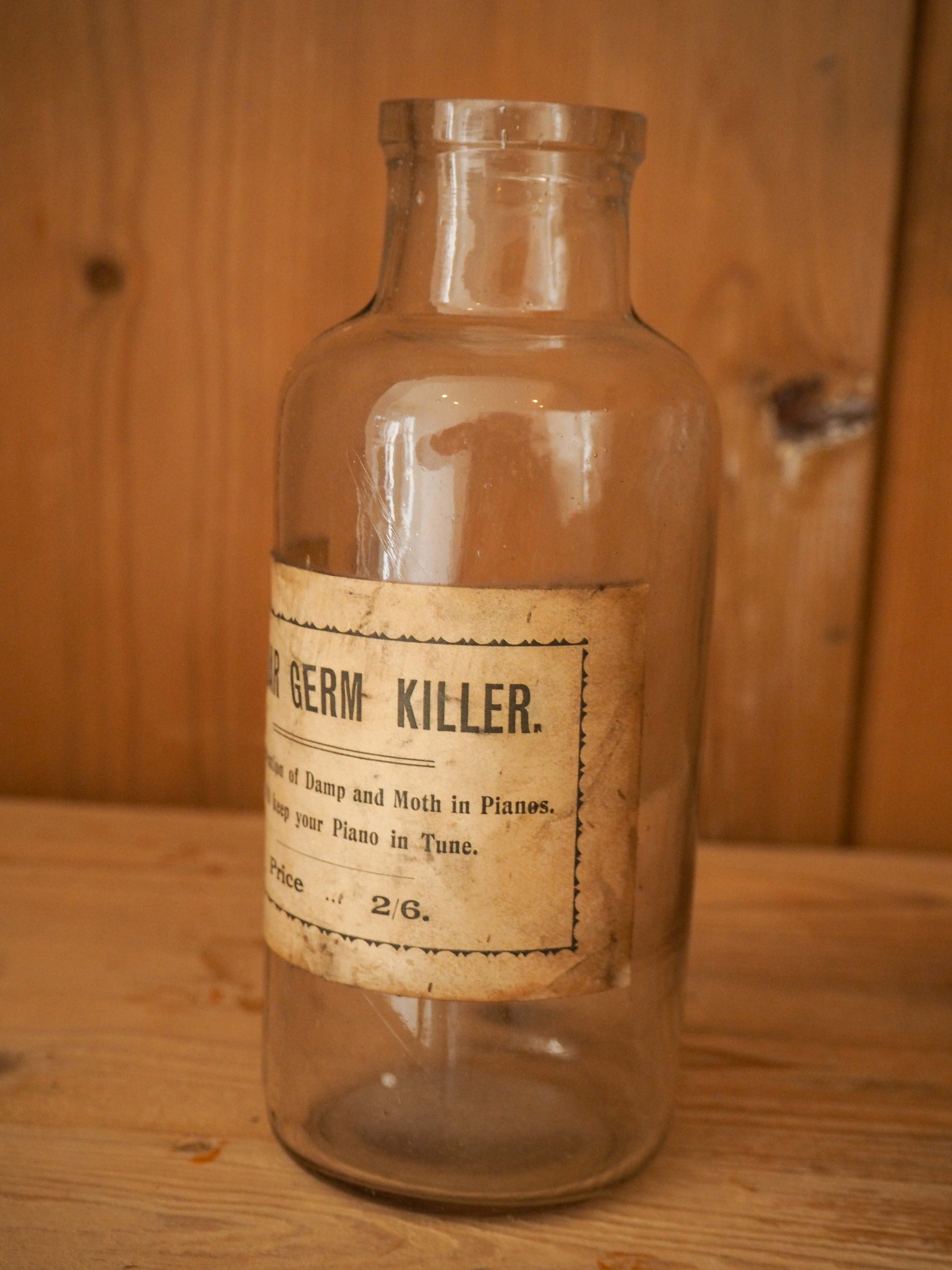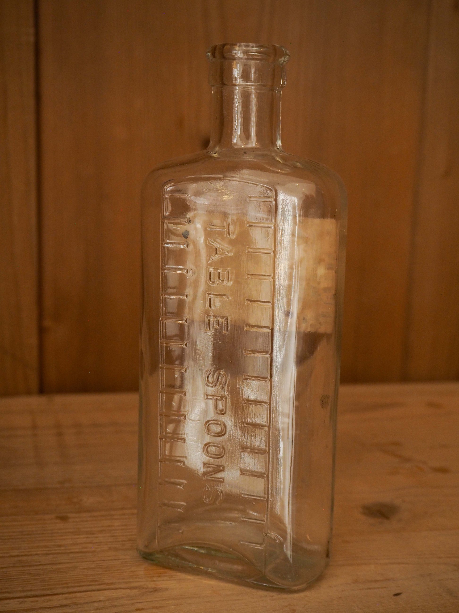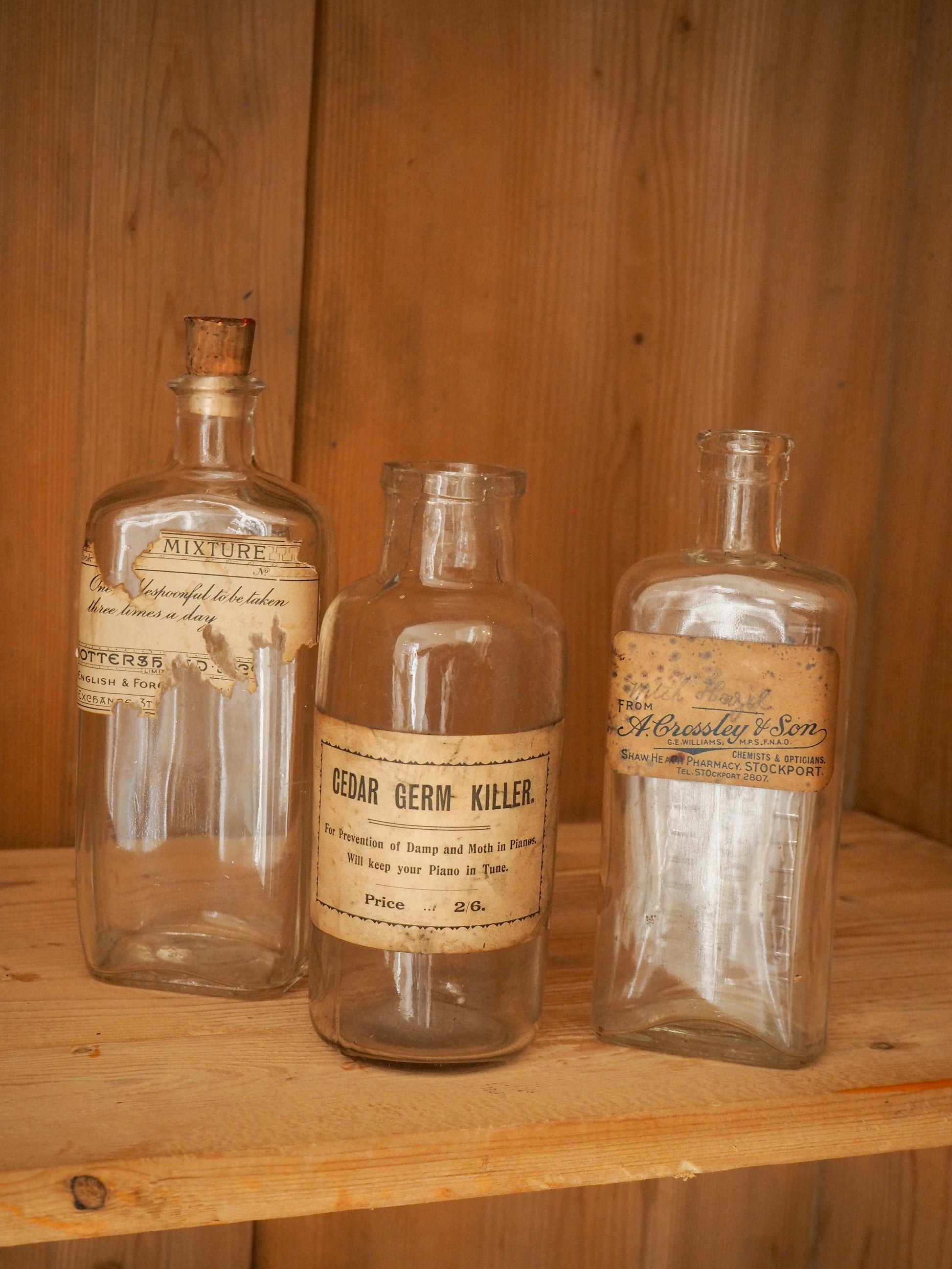 A trio of antique English apothecary glass bottles with their original labels still in tact. One of the bottles includes the original cork stopper. We recommend using them purely for decorative purposes.
