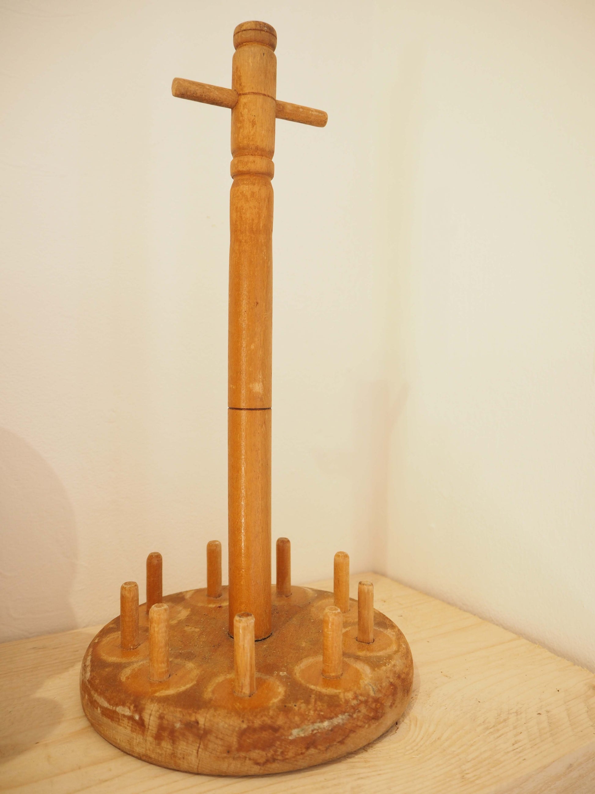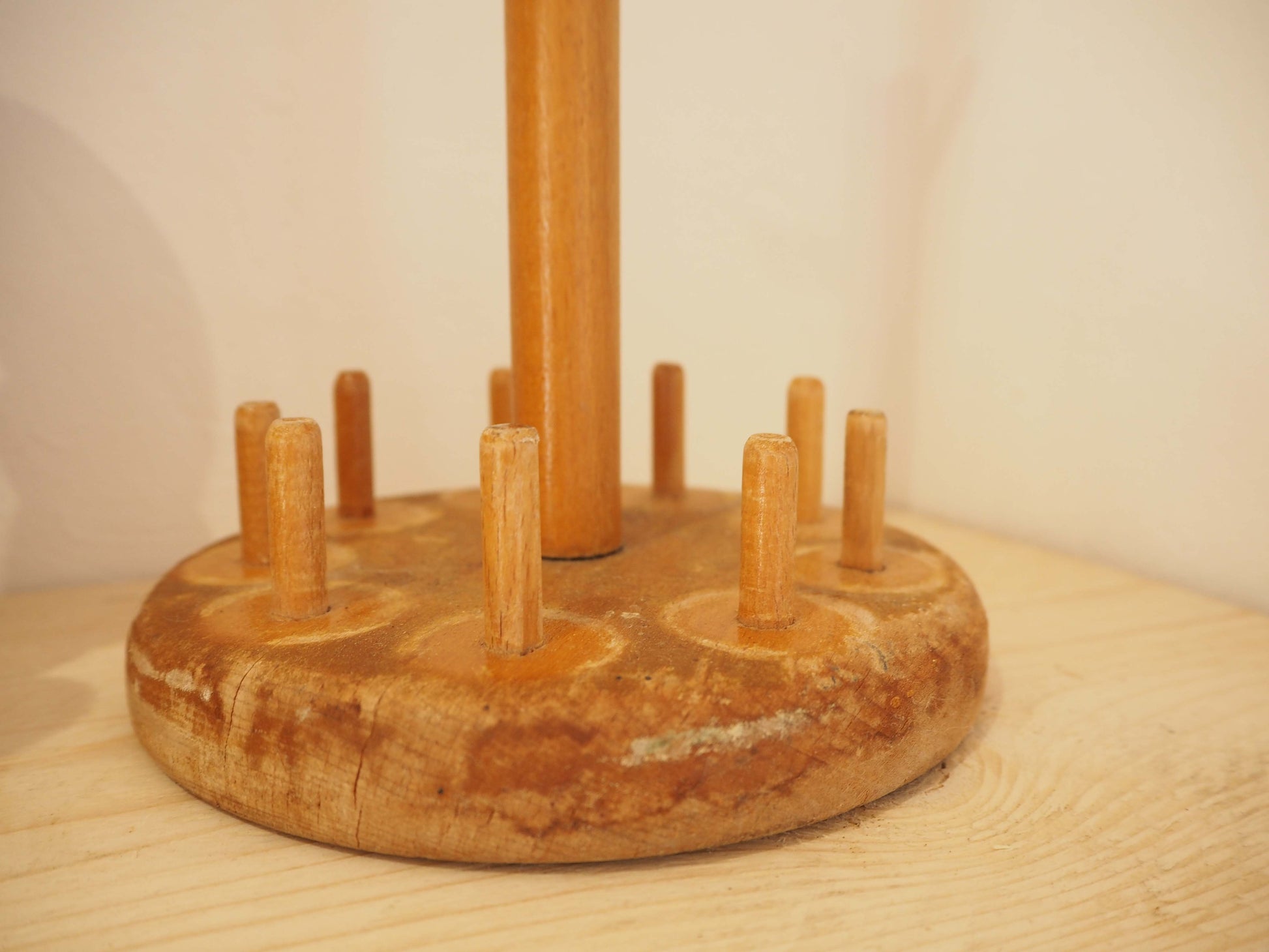 An early 20th-century blonde wooden skittle set with stand. Skittle is an English lawn game that is still popular throughout the United Kingdom today, only in its current iteration it is played as a miniature pub game. A fun and functional decorative accent with great sculptural appeal.