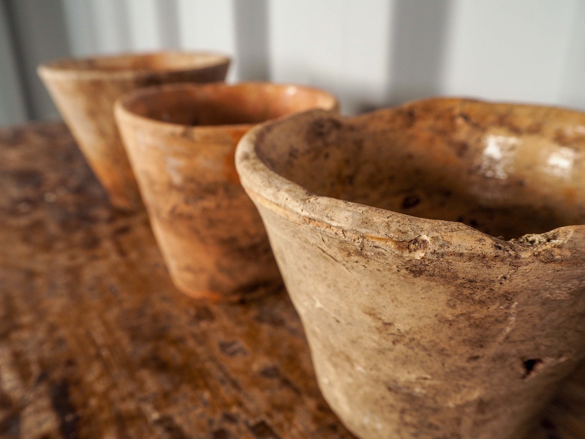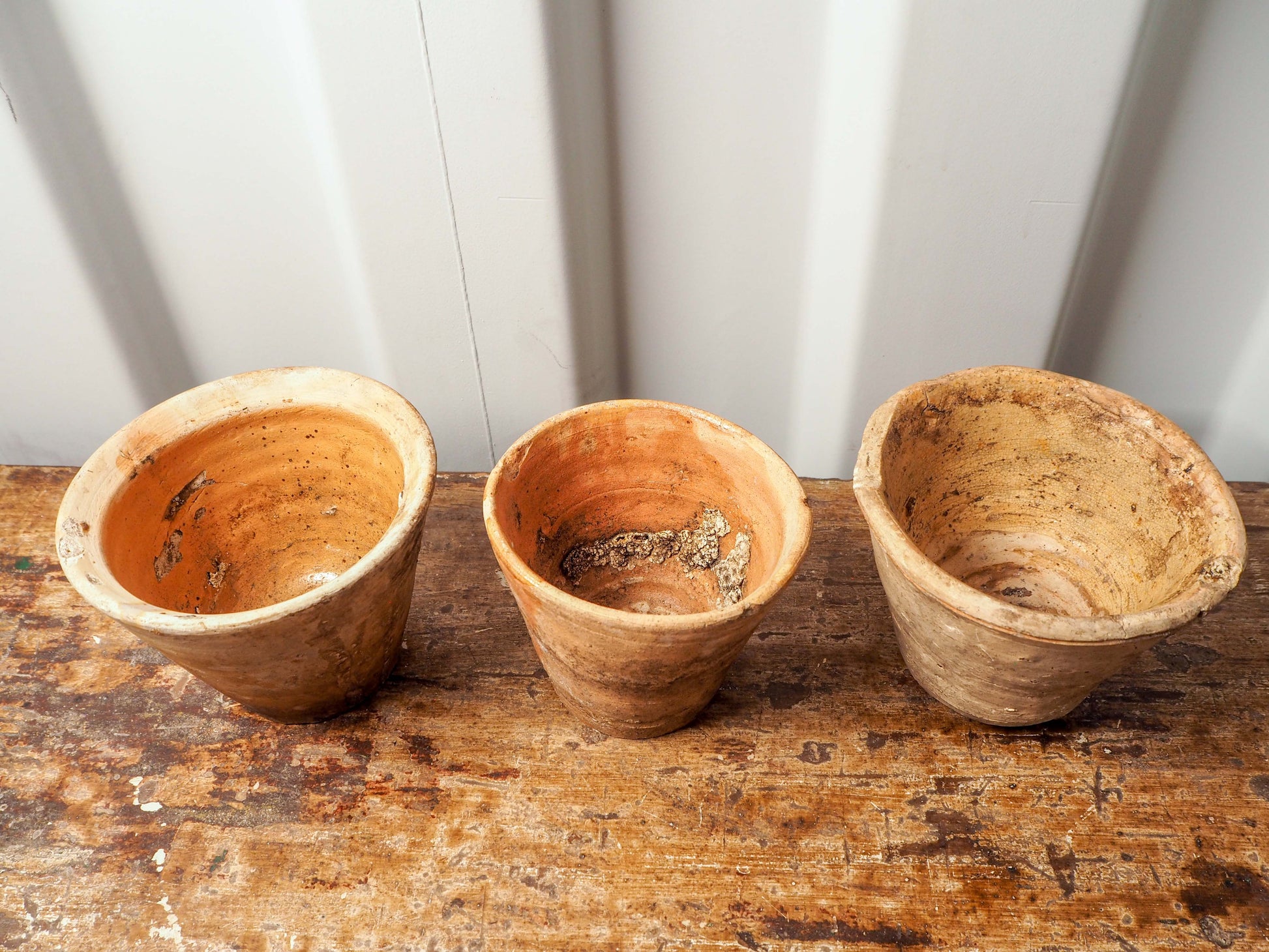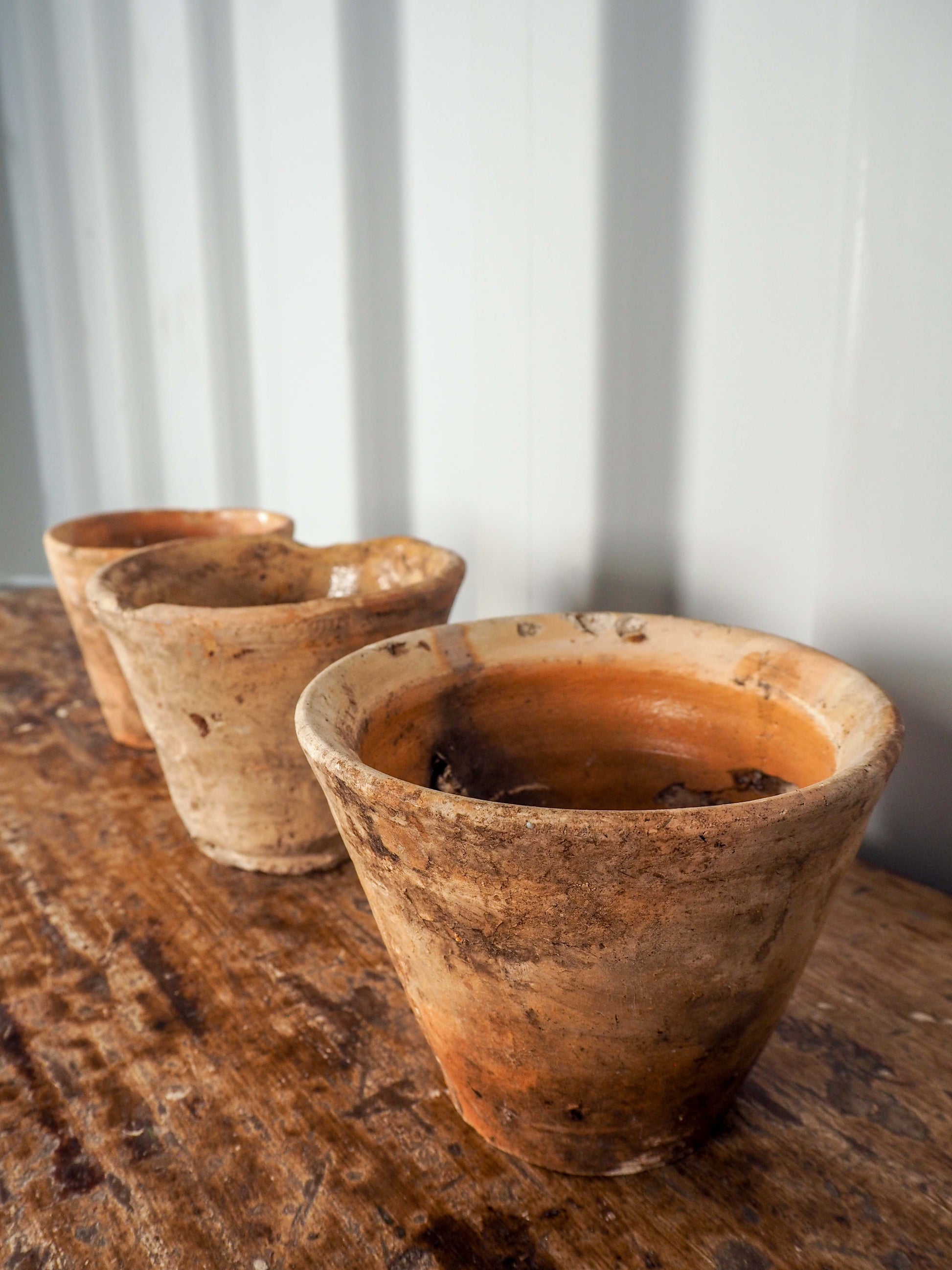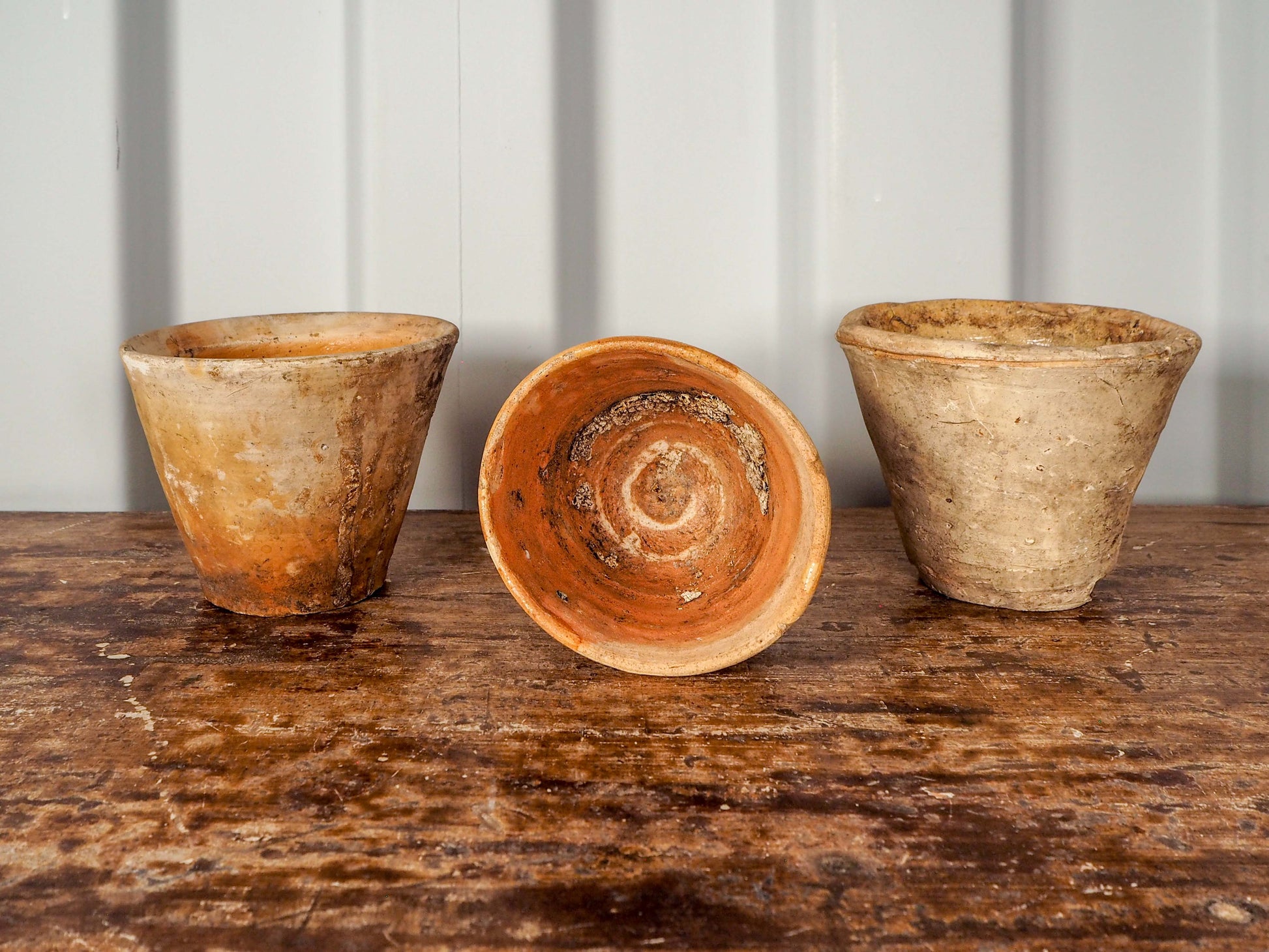 Charming vintage handmade 19th-century terracotta pots, originally used to harvest the resin tapped from the pine trees. With a beautifully aged patina, they also smell wonderful due to the residue of crystallised pine resin still inside.