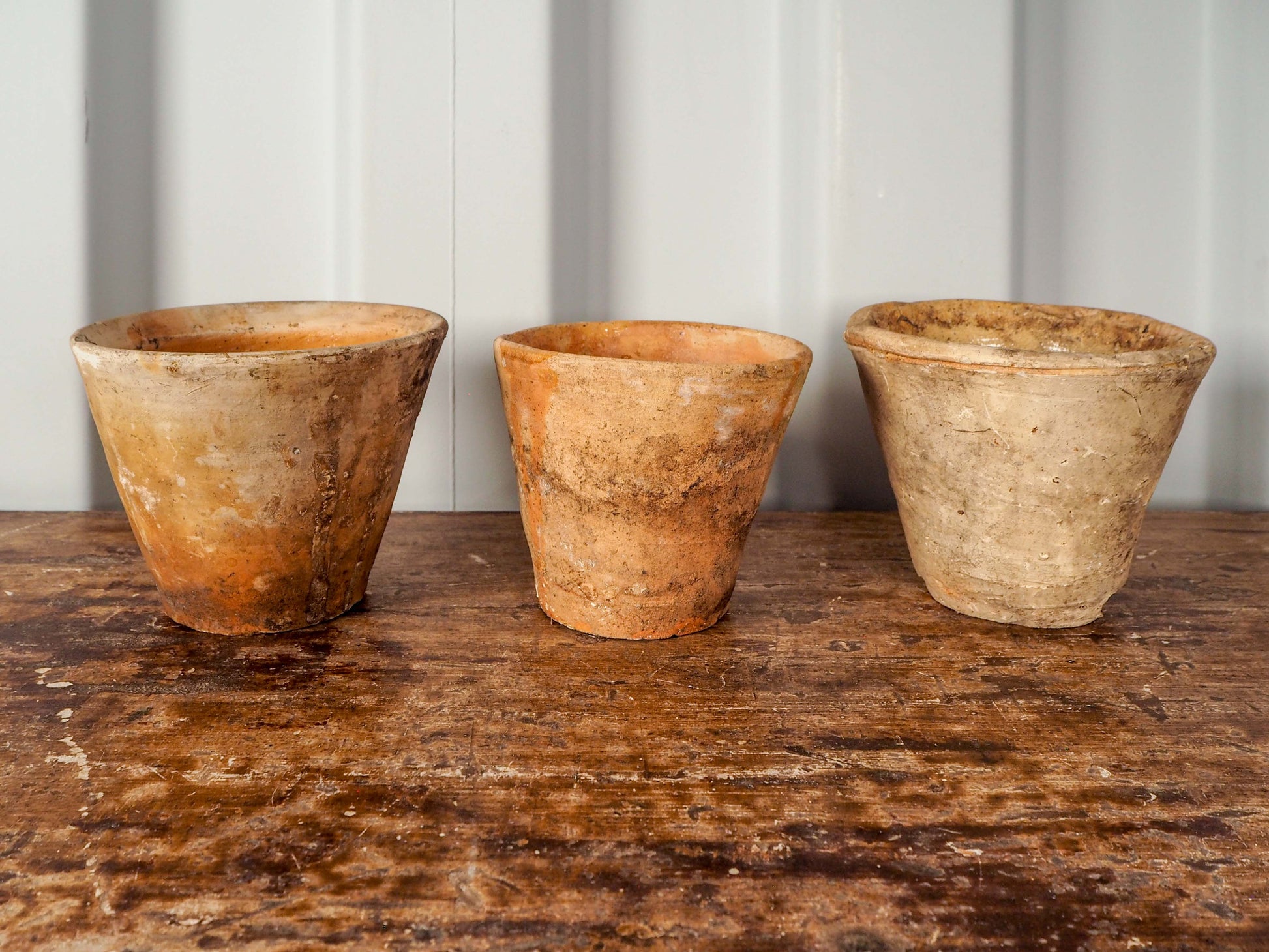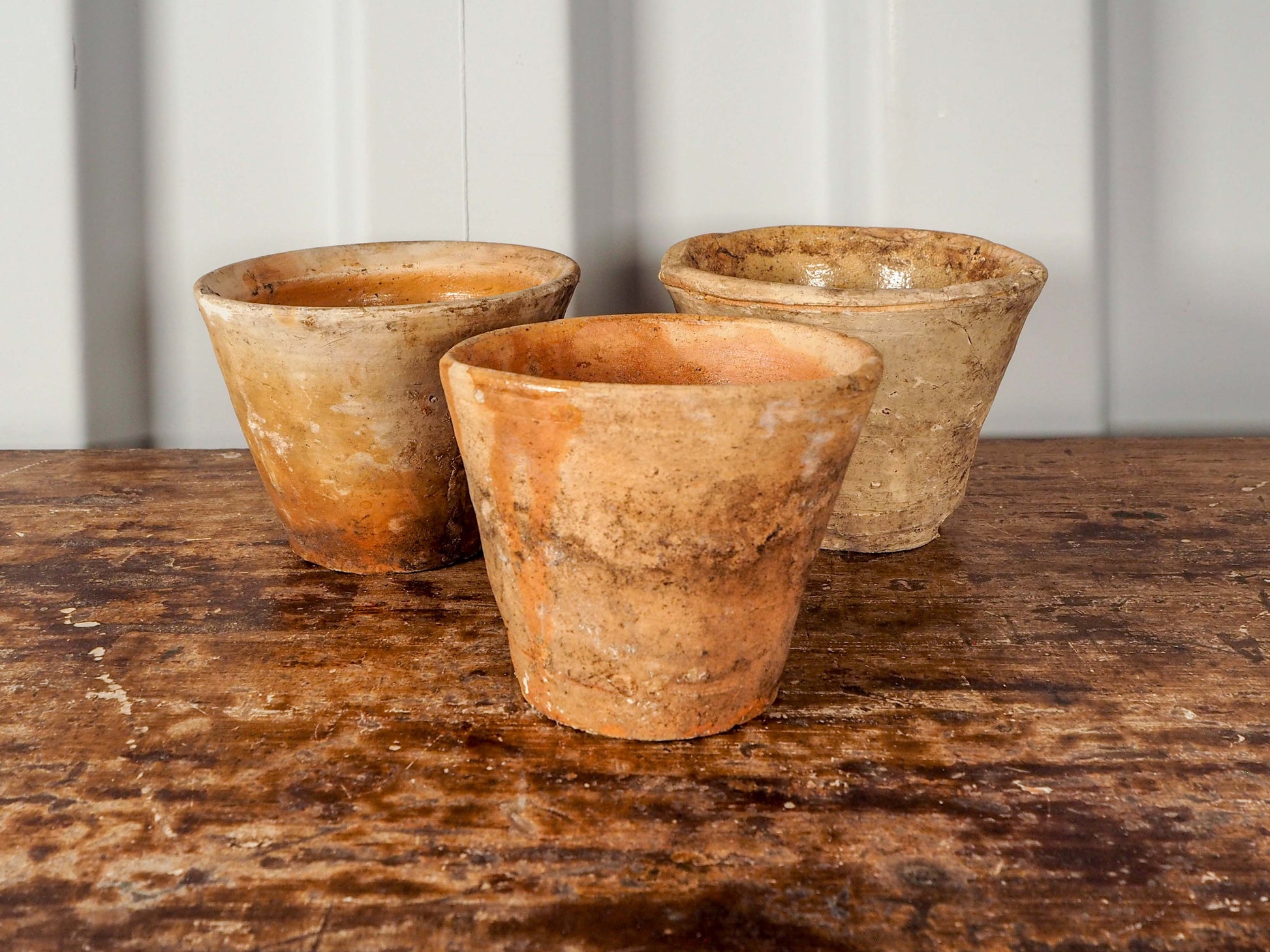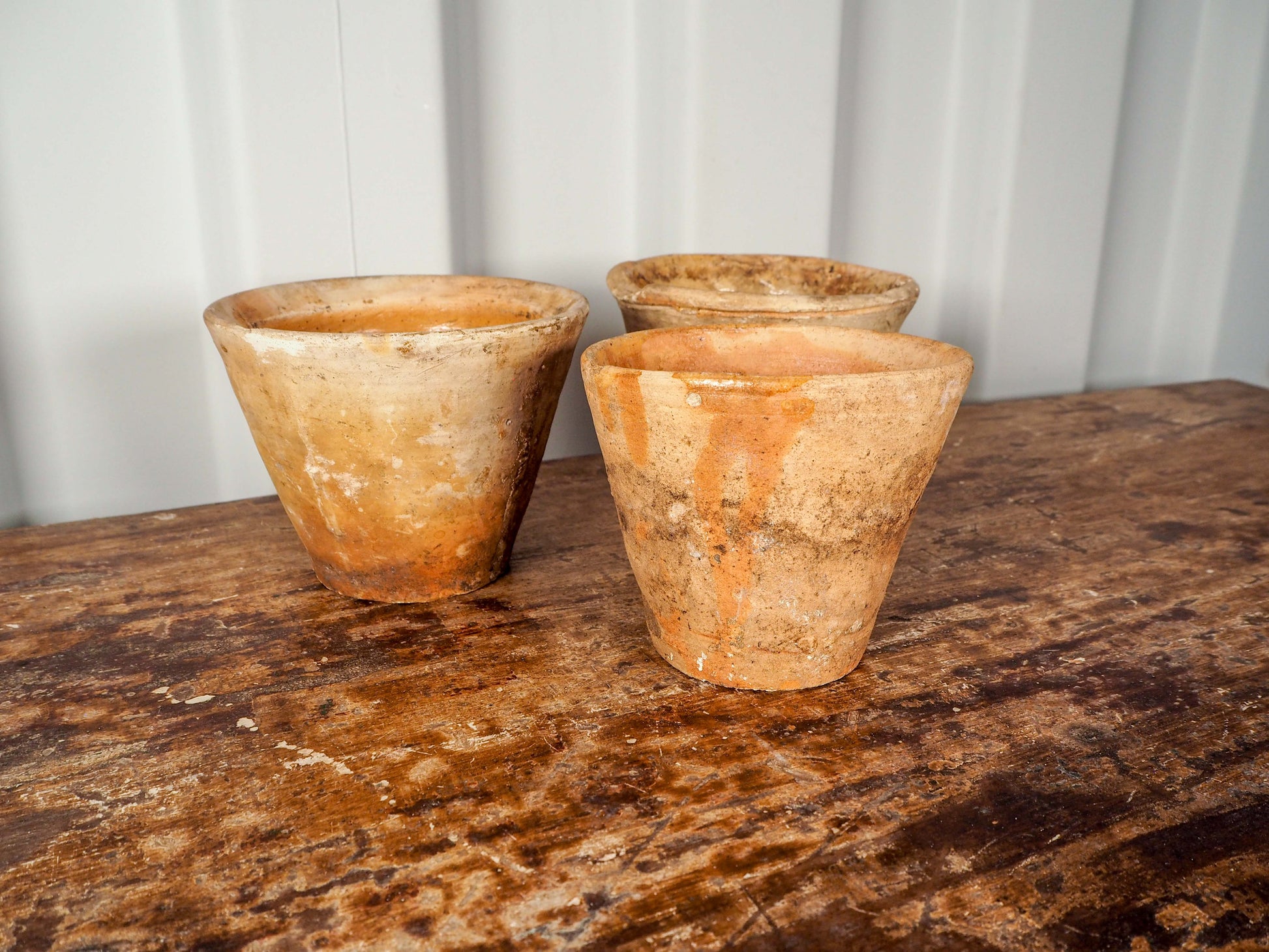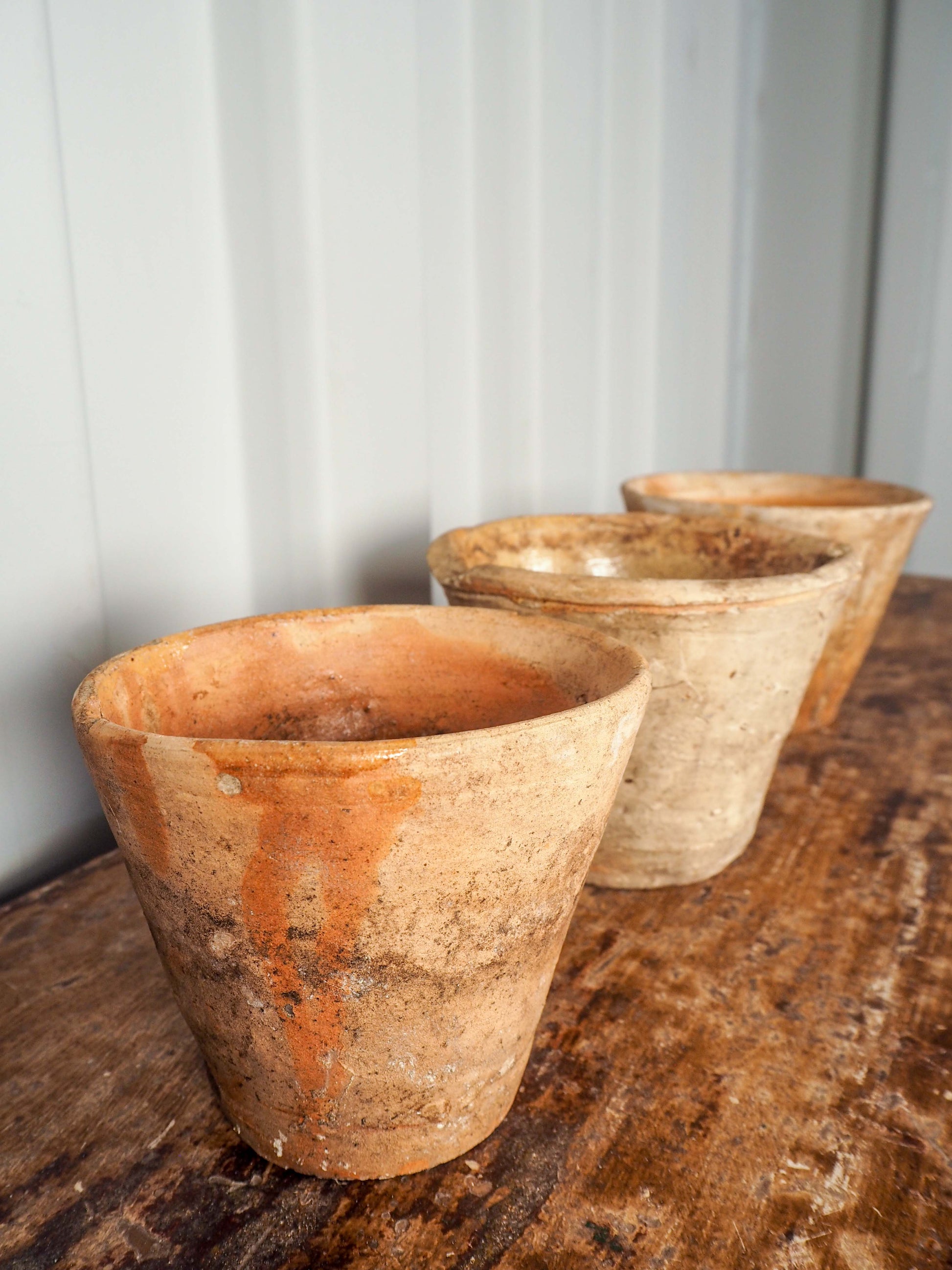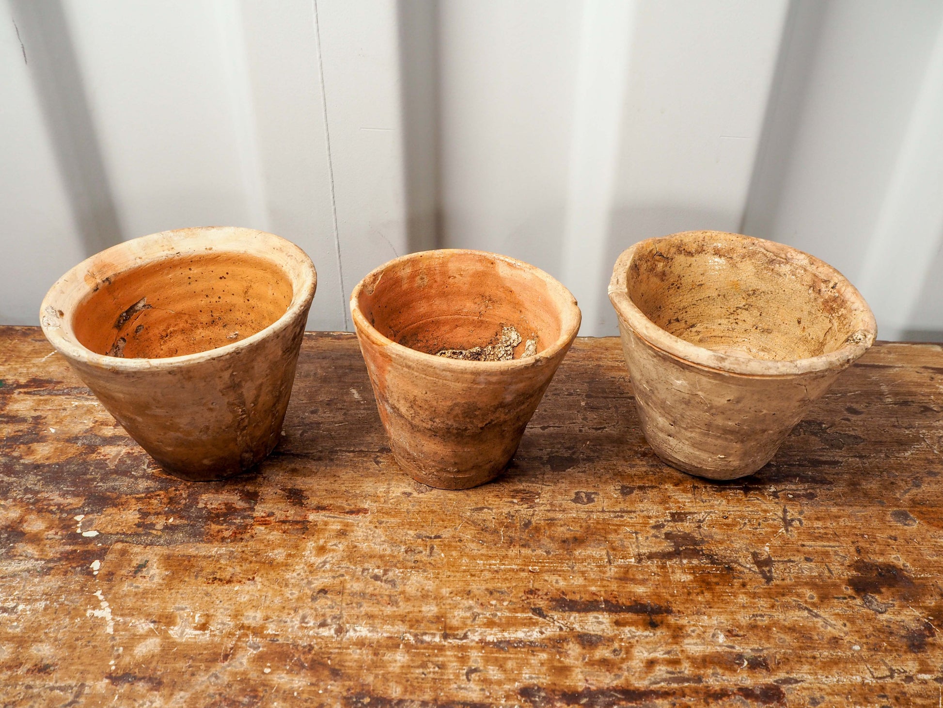 Charming vintage handmade 19th-century terracotta pots, originally used to harvest the resin tapped from the pine trees. With a beautifully aged patina, they also smell wonderful due to the residue of crystallised pine resin still inside.