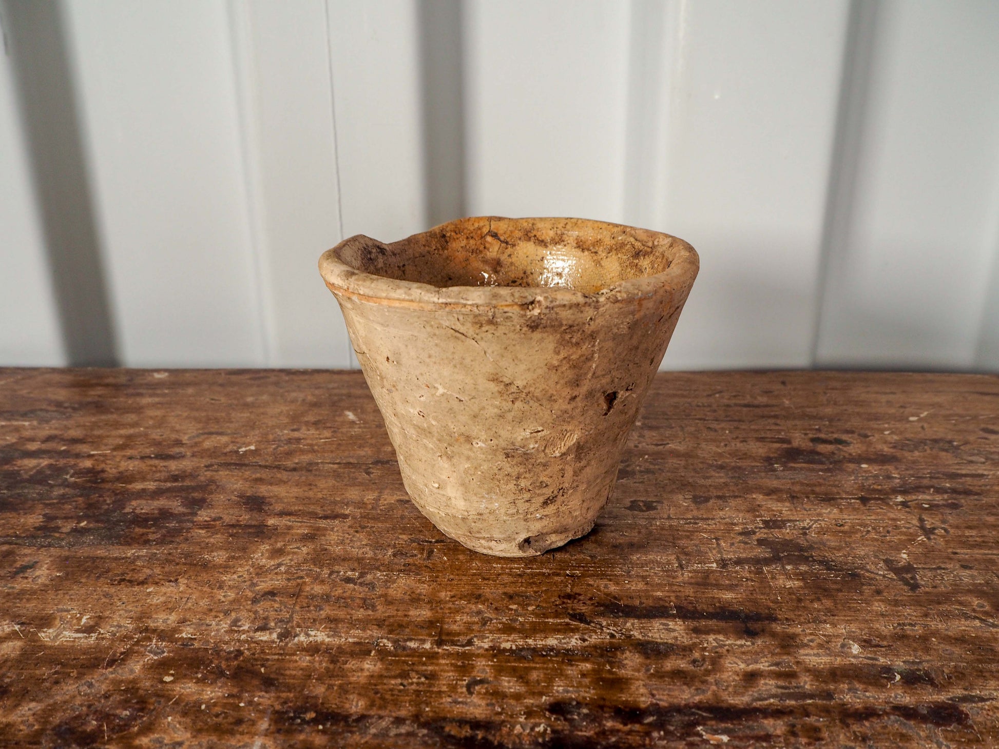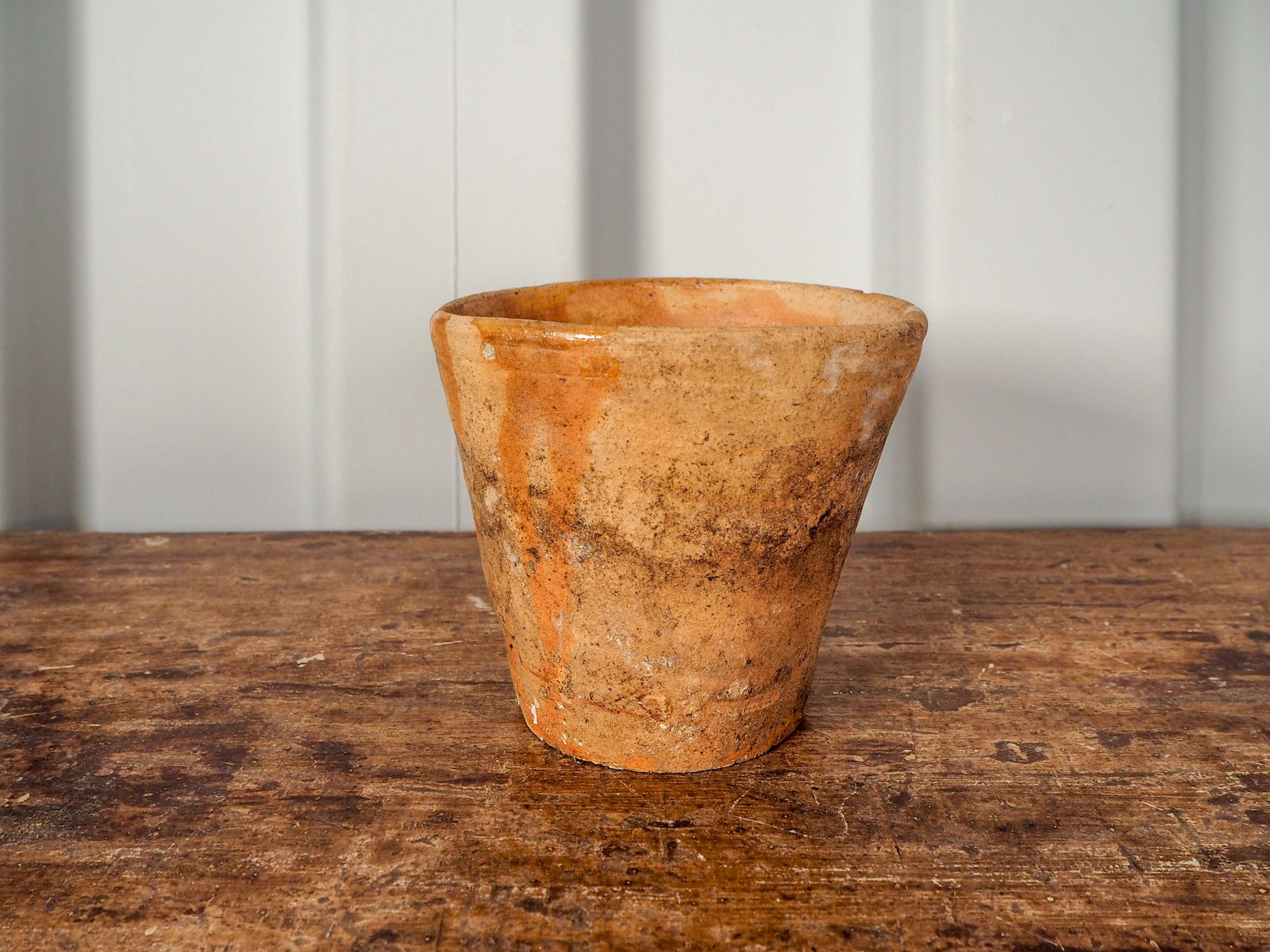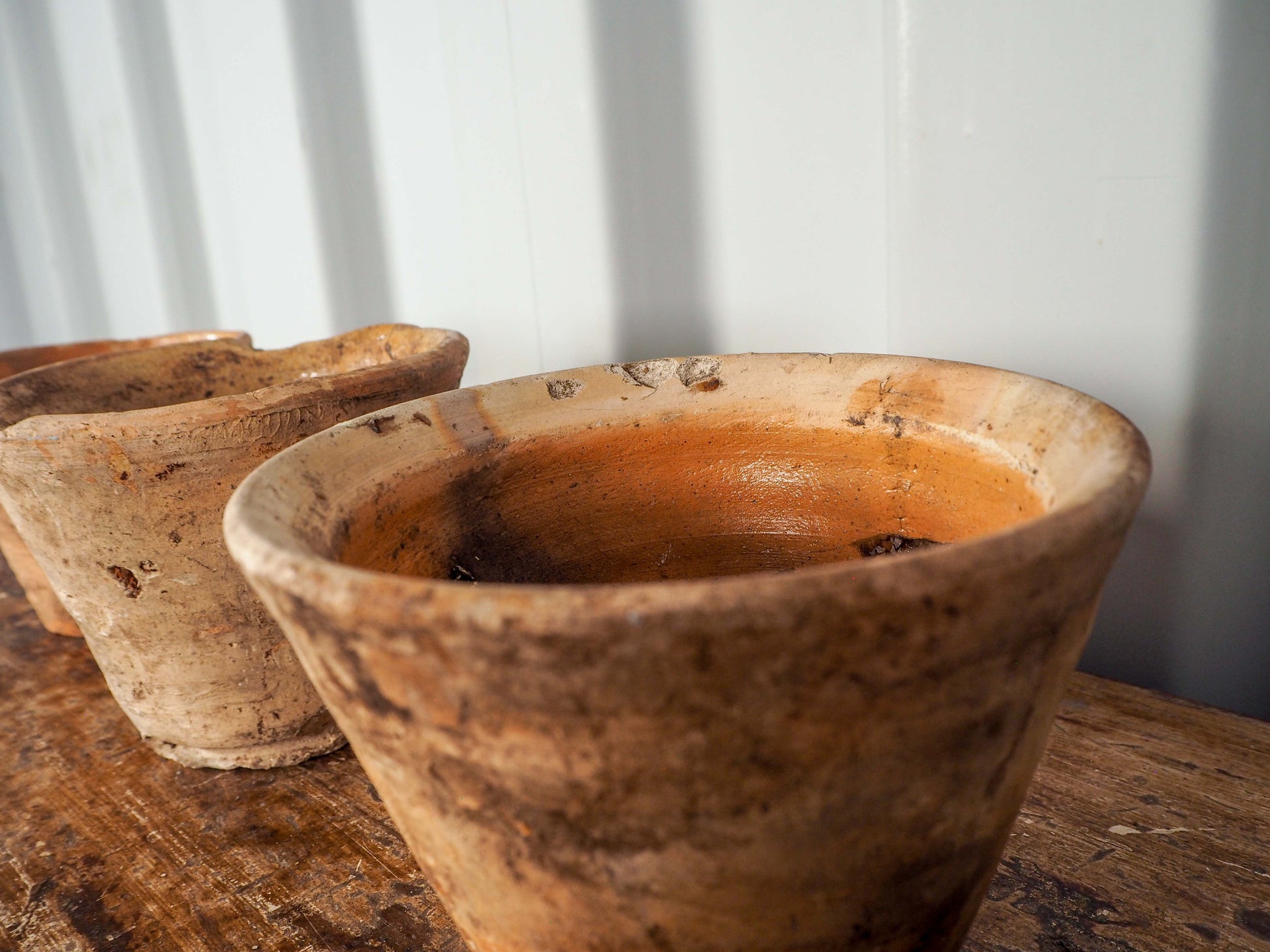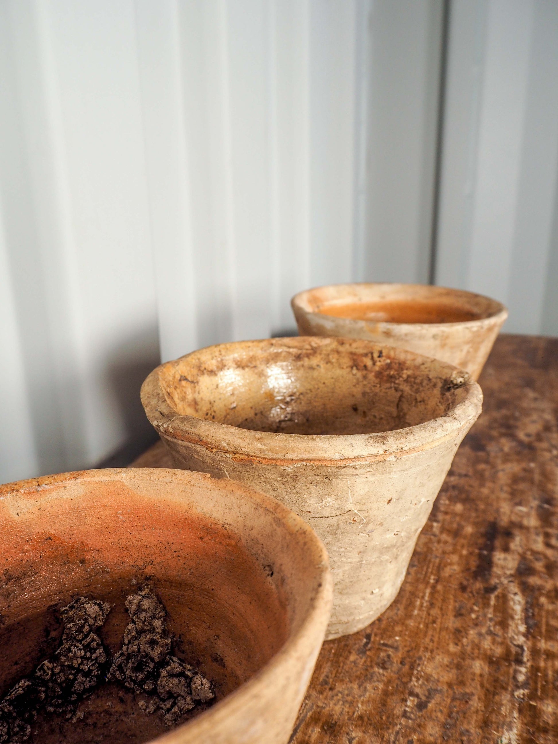 Charming vintage handmade 19th-century terracotta pots, originally used to harvest the resin tapped from the pine trees. With a beautifully aged patina, they also smell wonderful due to the residue of crystallised pine resin still inside.