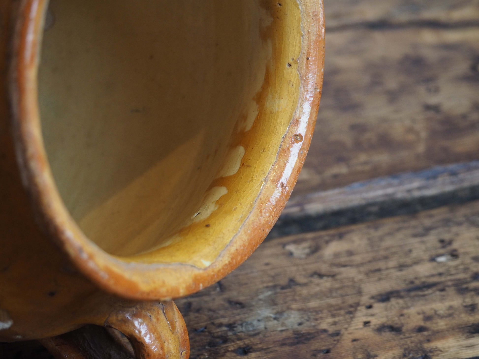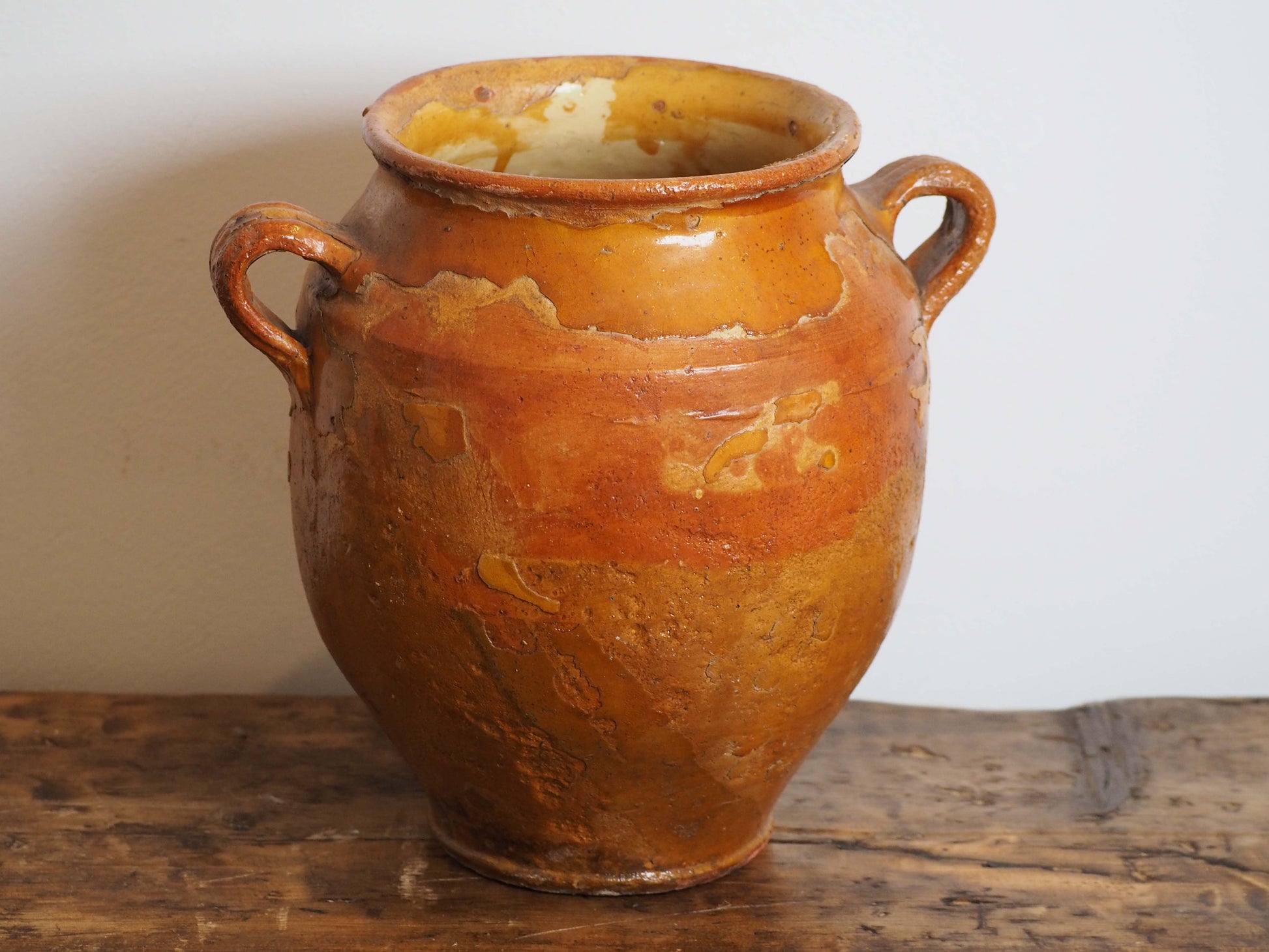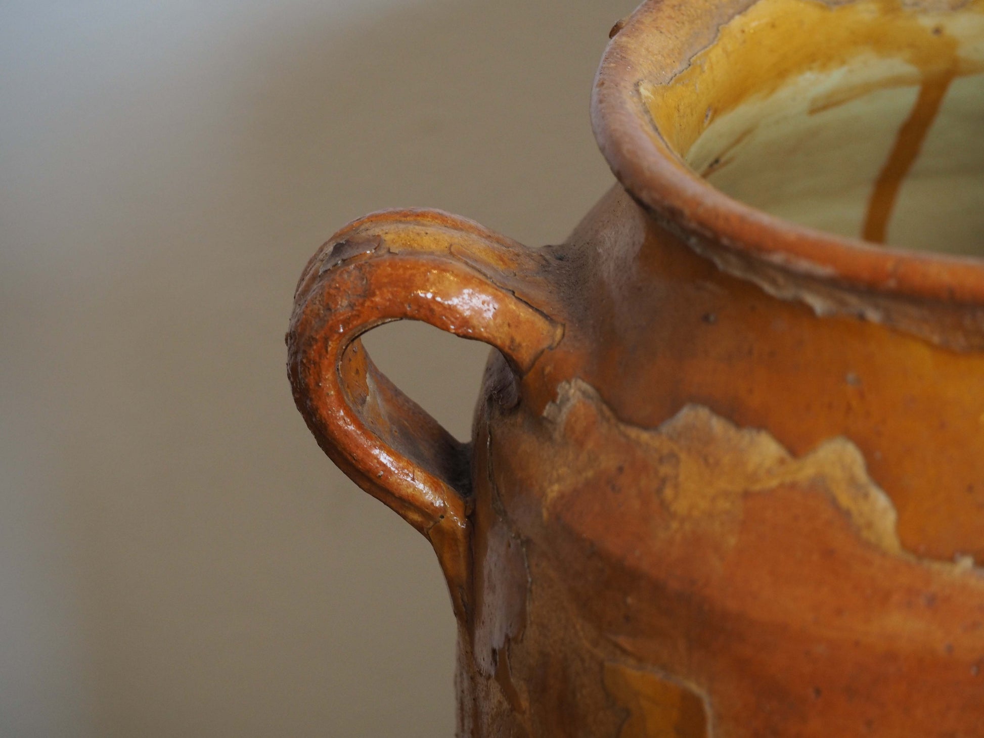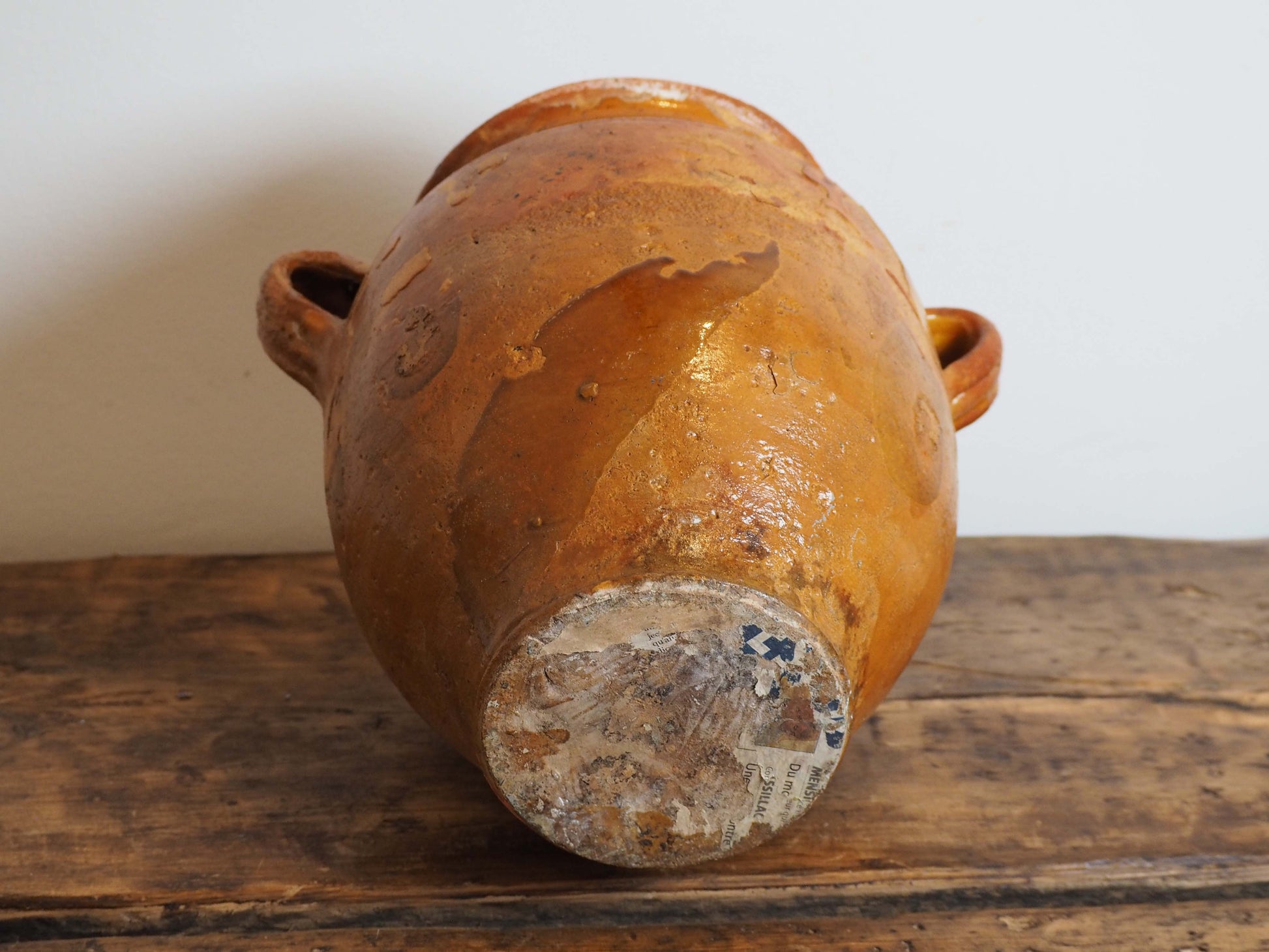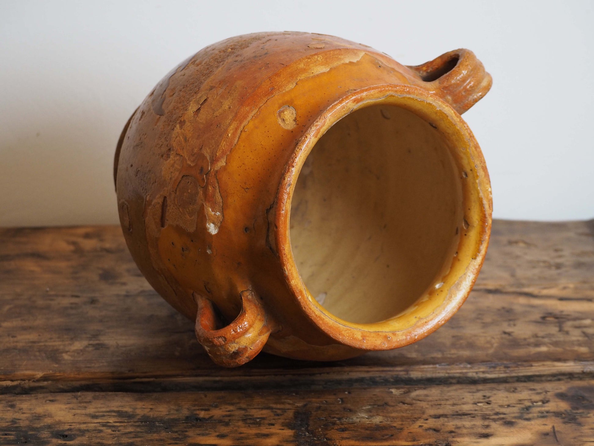 This Provencal pot is very solid, handmade by a craftsman potter over 100 years ago. It is distinguished by its magnificent yellow glaze, unique. Each piece is a work of art, highlighting the variations in thickness of the glaze, as well as the manufacturing drops that testify to its authenticity. The colour of the clay, revealed by some chips and losses of glaze, contributes to its rustic charm.