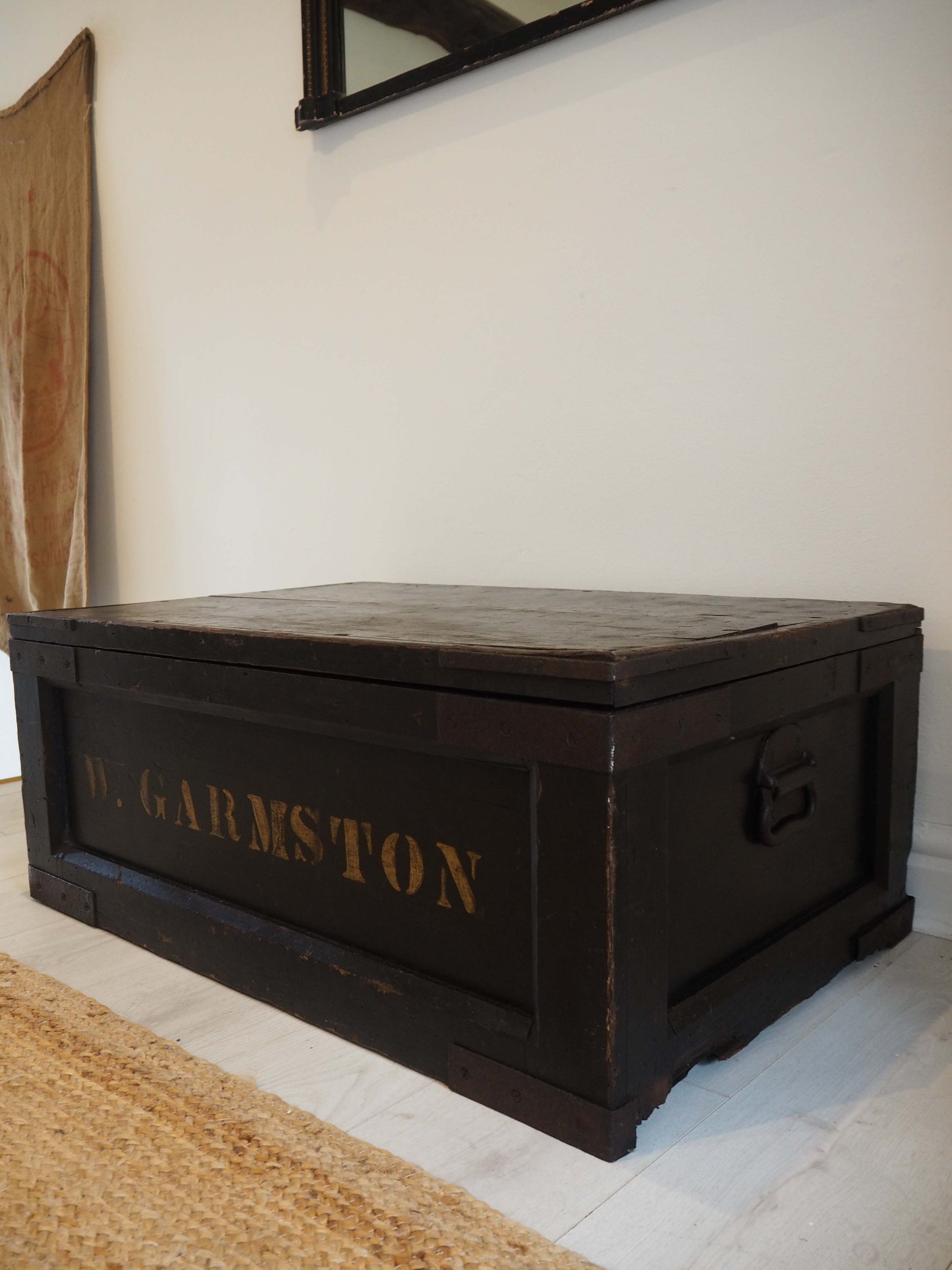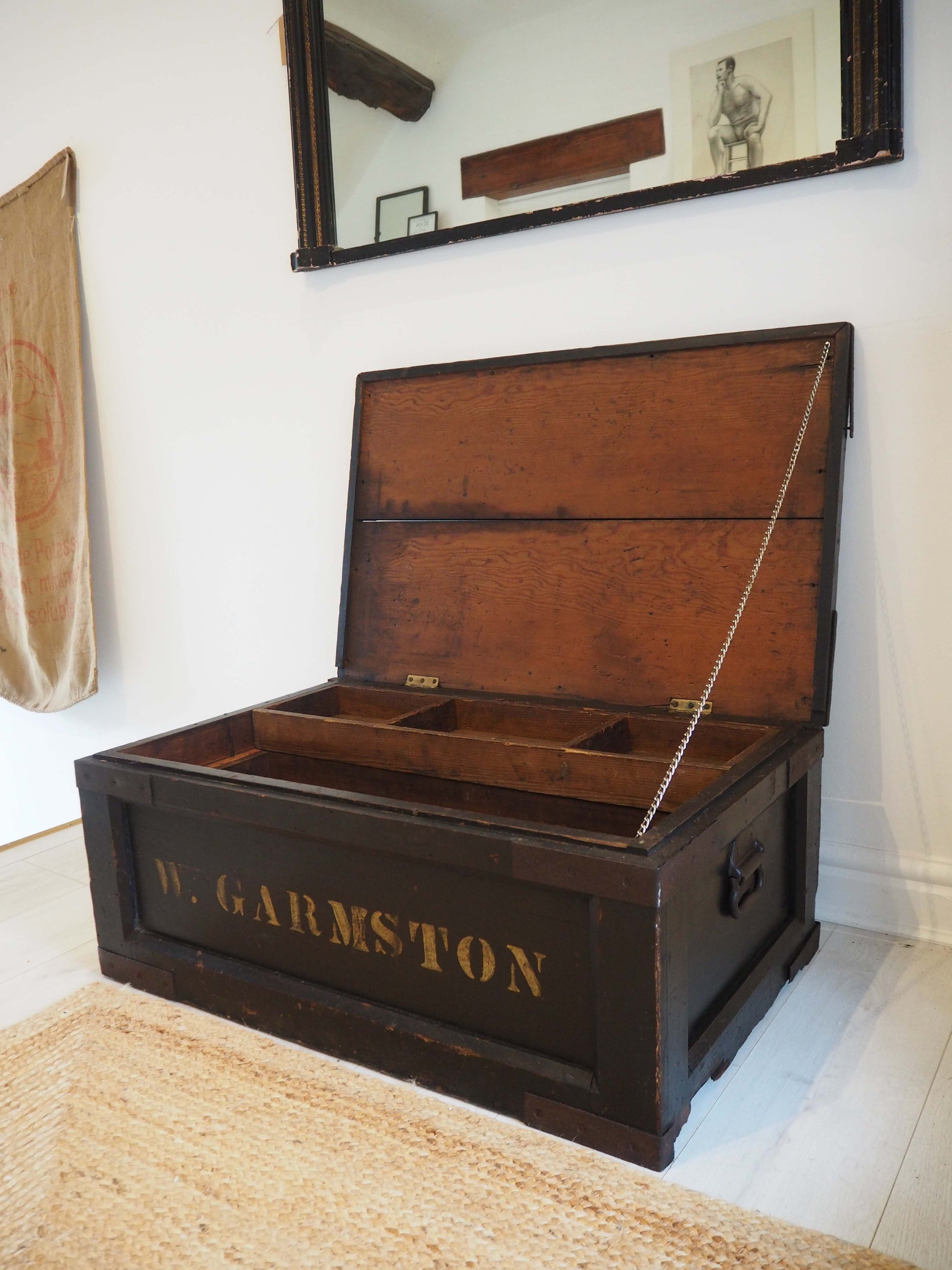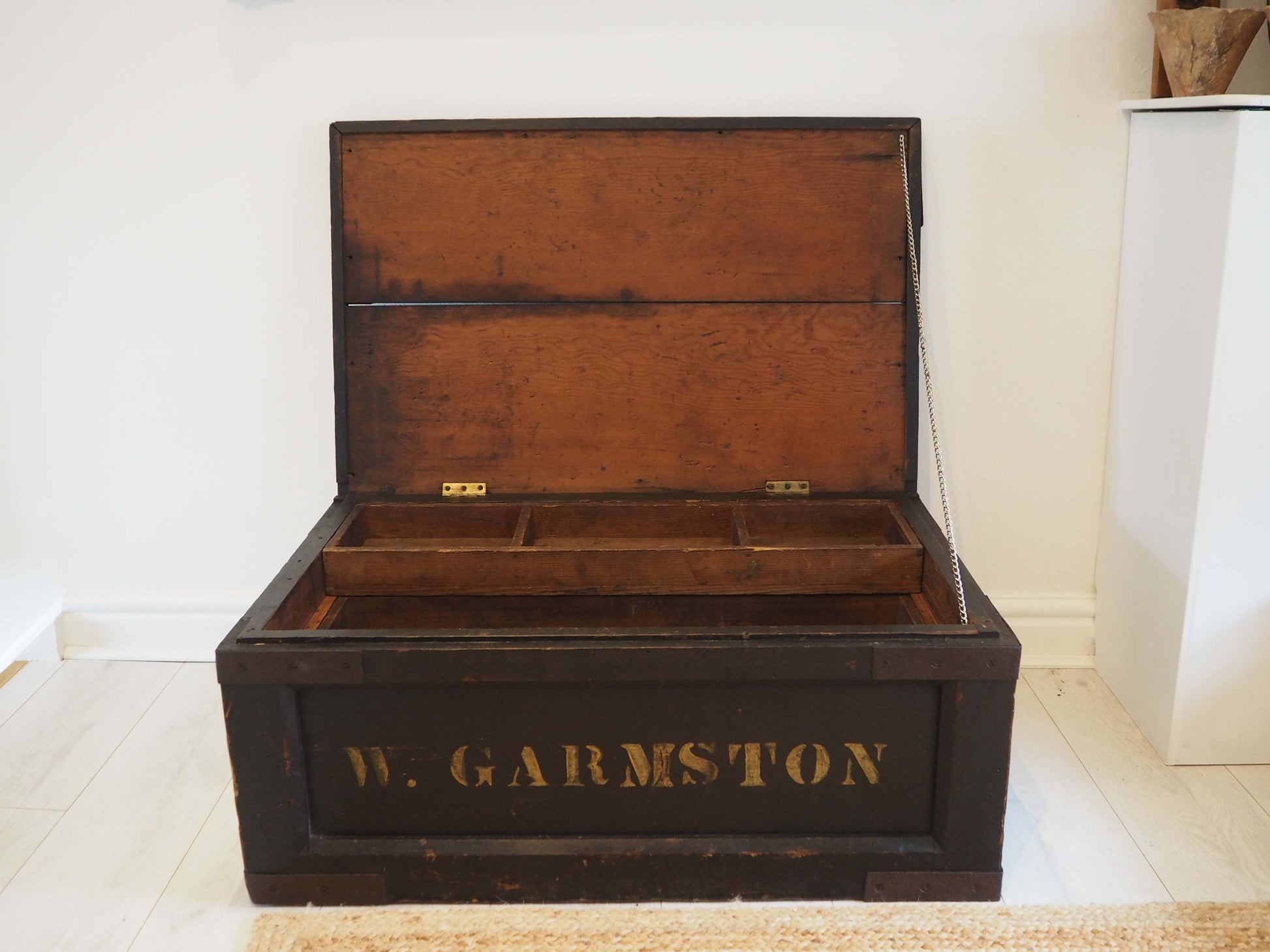 A beautiful large antique wooden trunk or chest with two removable inner compartments. It would make a fantastic quirky coffee table and doubles up as great storage space. The text on the front reads 'W.Garmston'.