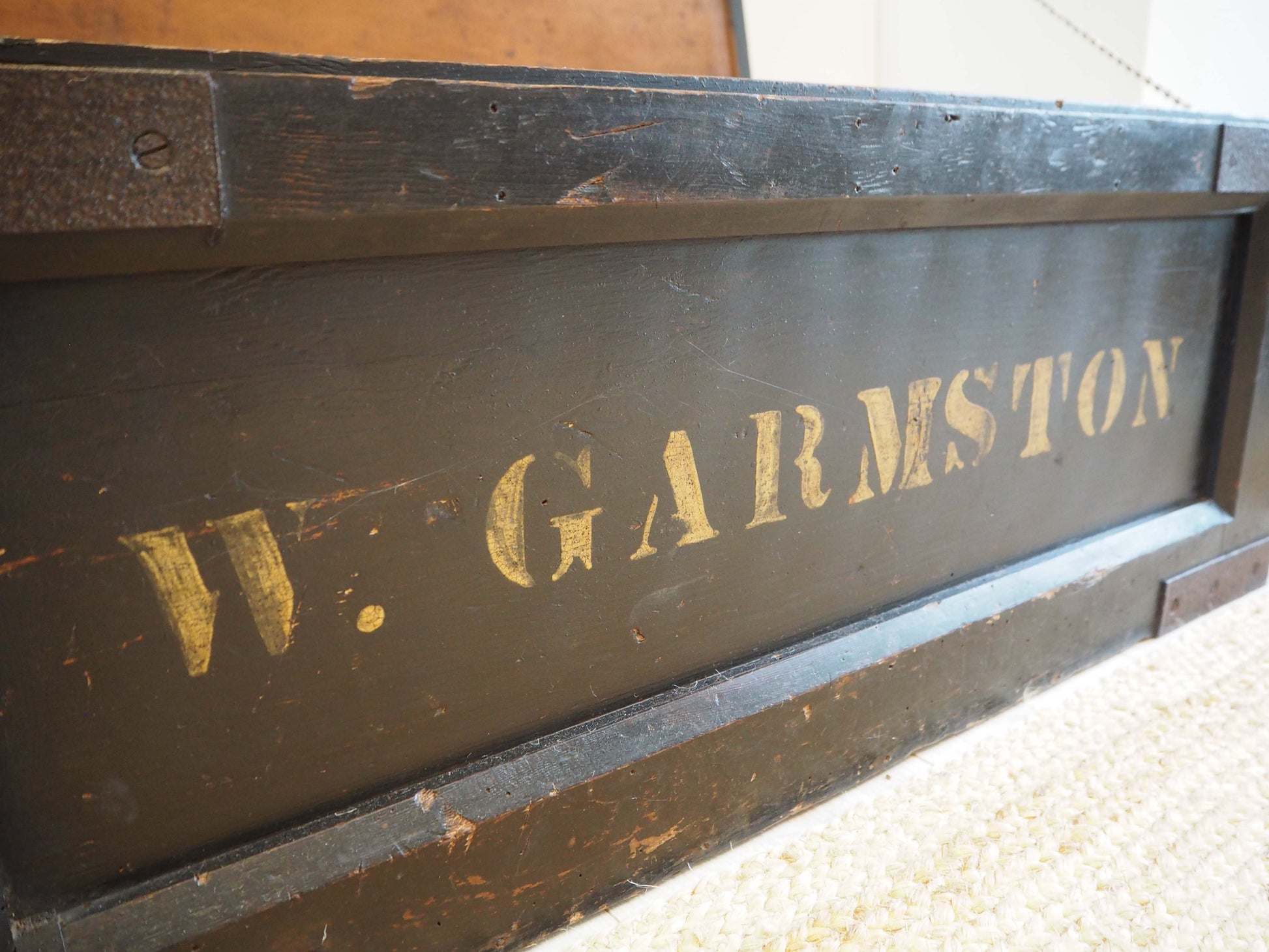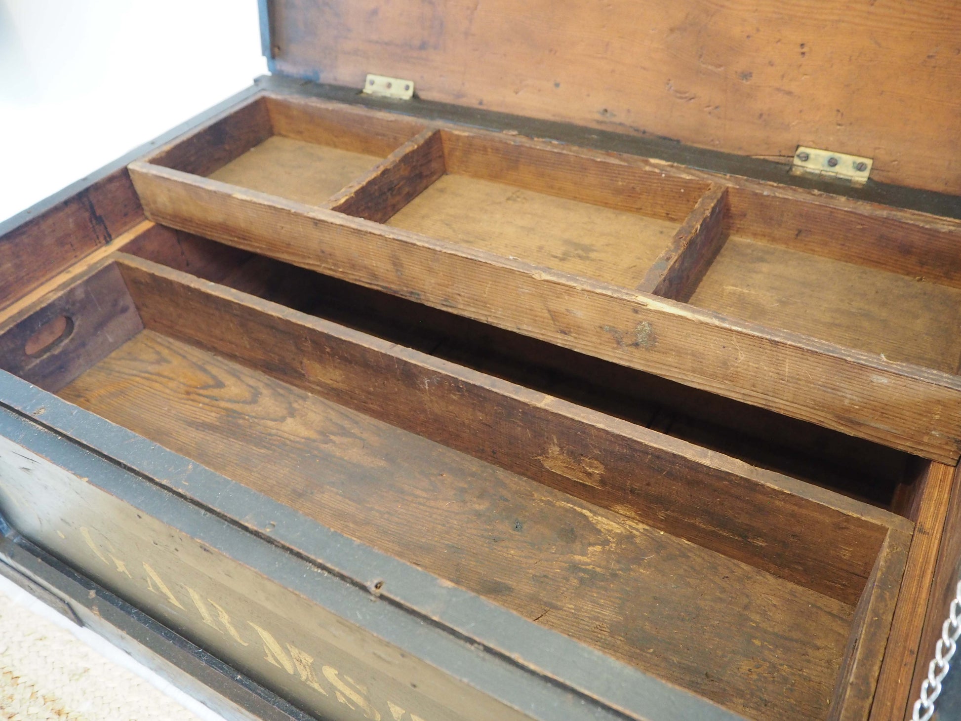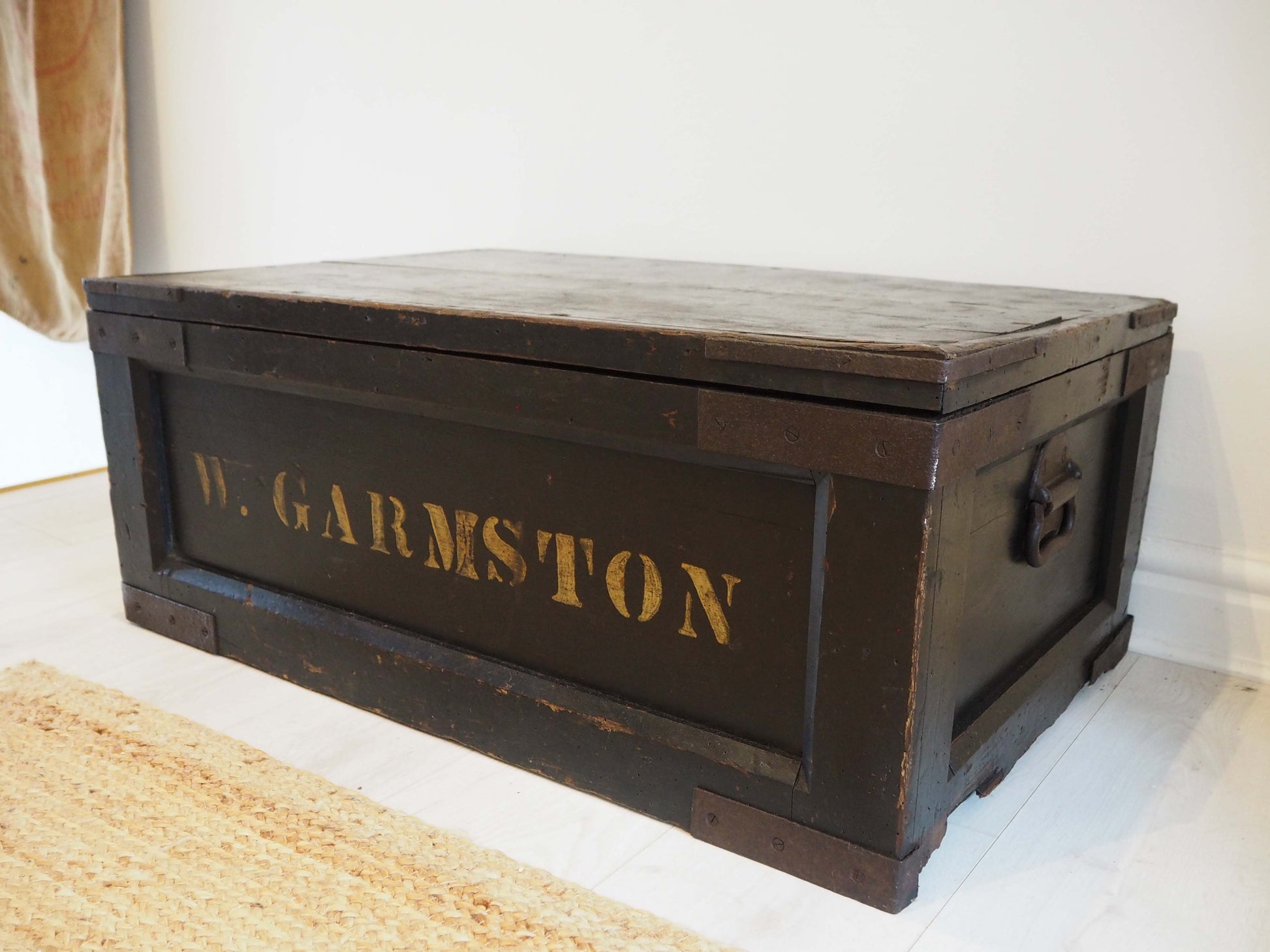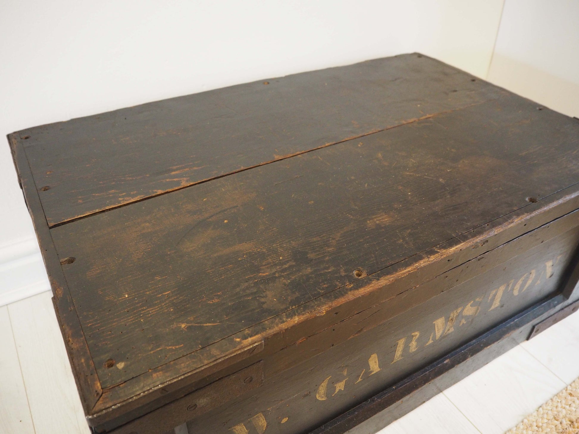 A beautiful large antique wooden trunk or chest with two removable inner compartments. It would make a fantastic quirky coffee table and doubles up as great storage space. The text on the front reads 'W.Garmston'.