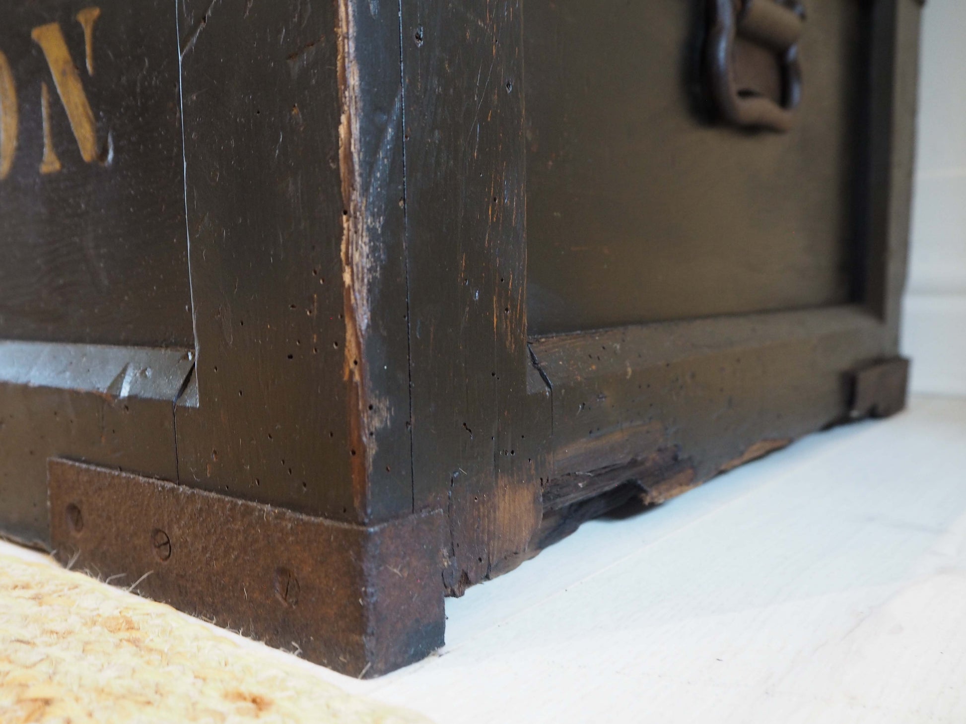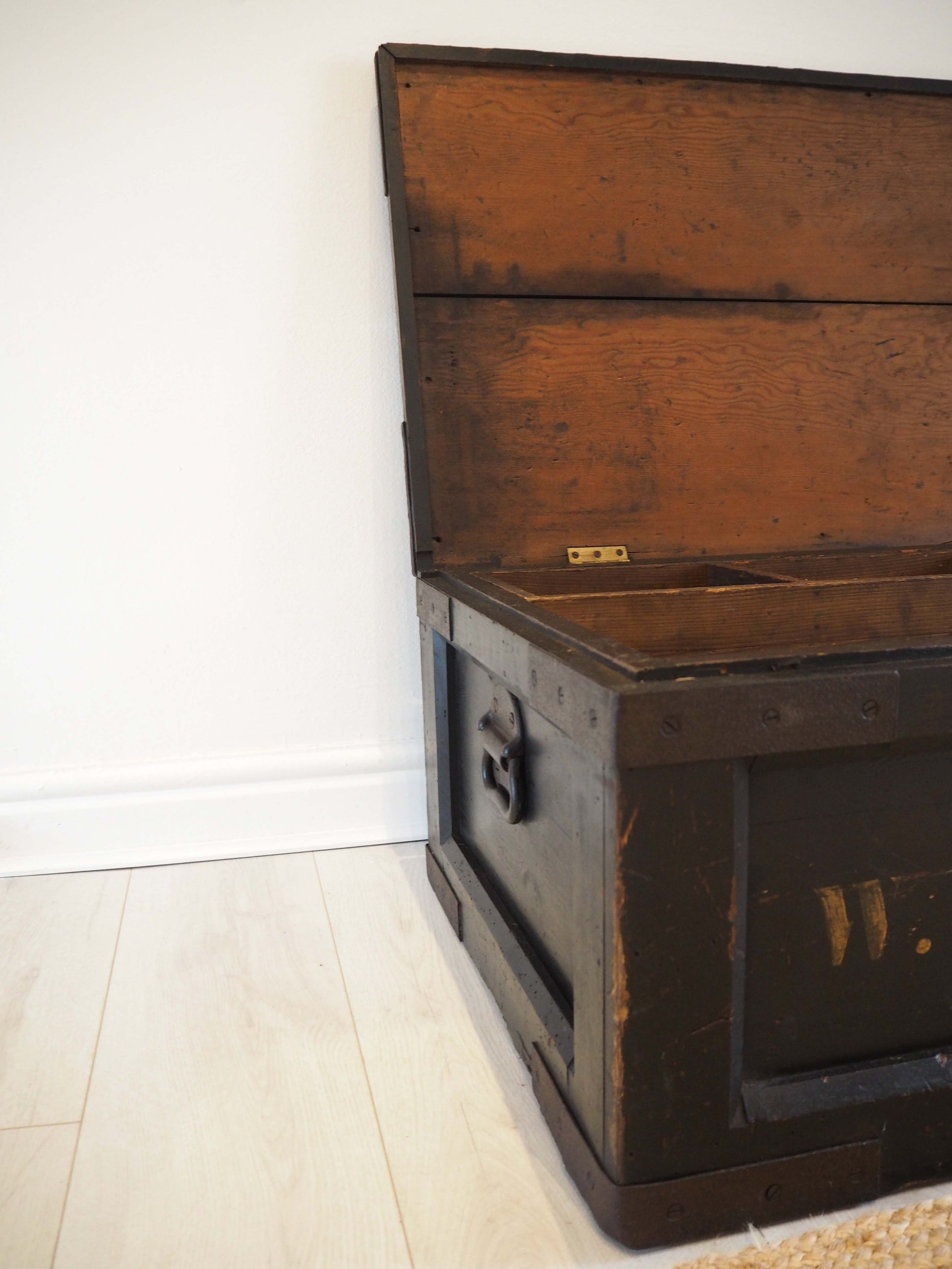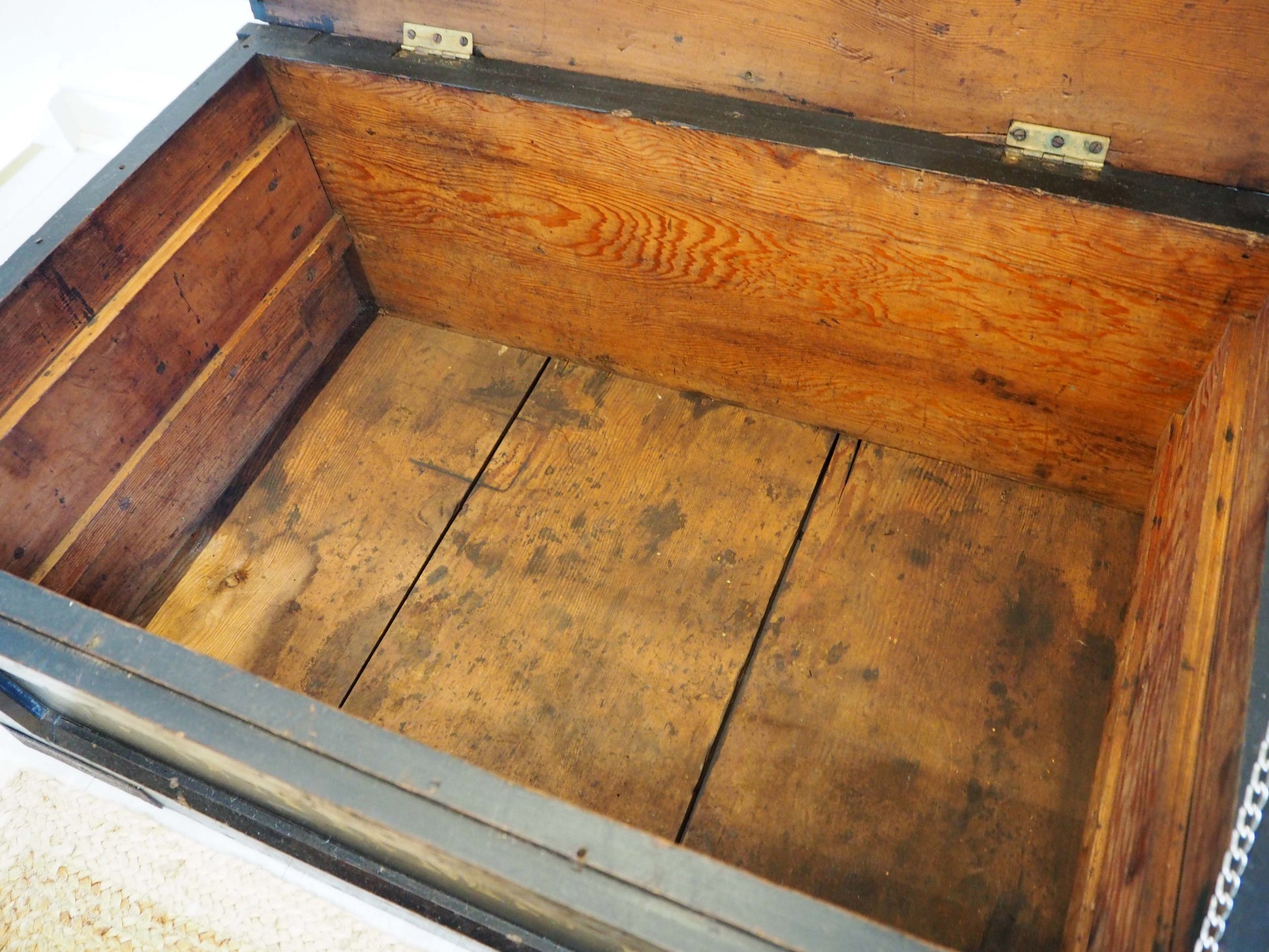 It has been woodworm treated and a fresh layer of wax has been applied. The silver chain is also a new addition, but could easily be removed if so desired. There is a small breakage in the front right metal clasp but this doesn't affect its use (please refer to photographs).