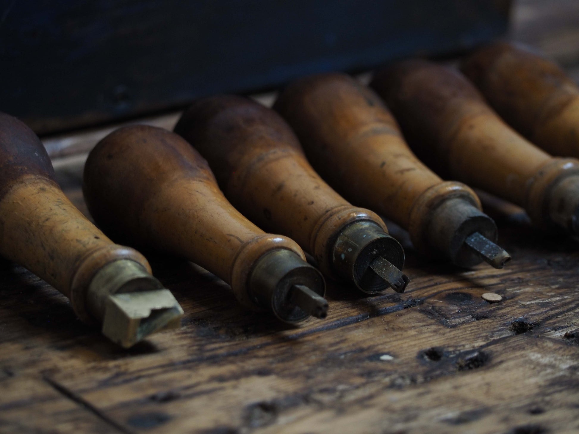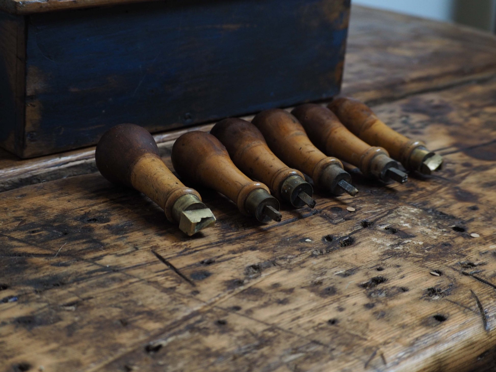 A beautiful display of antique leather working tools in a wooden storage box. Each tool is made from fruitwood and features a metal pin in varying shapes and sizes. Originally used for stamping leather, now it makes a beautiful decorative item.