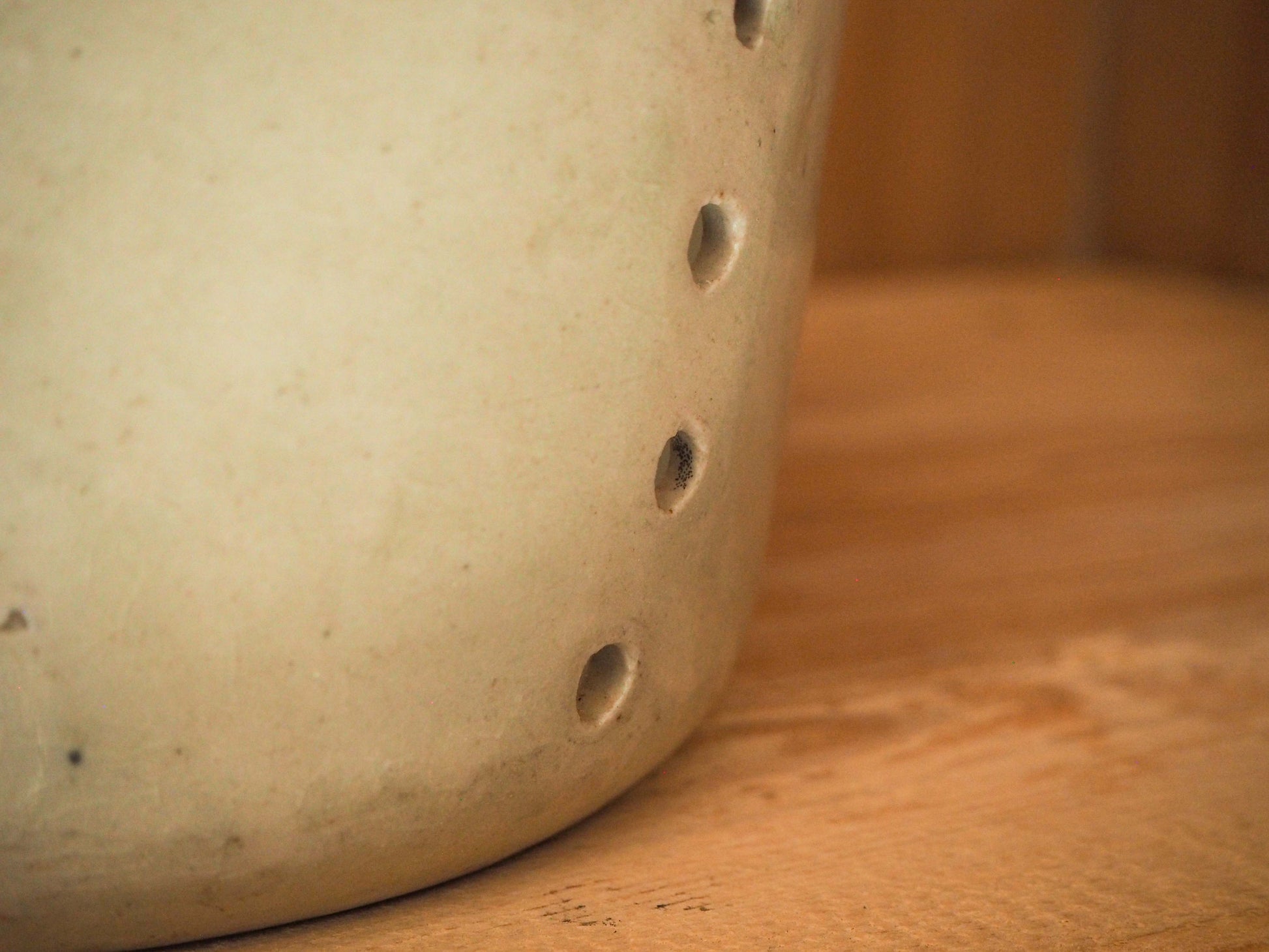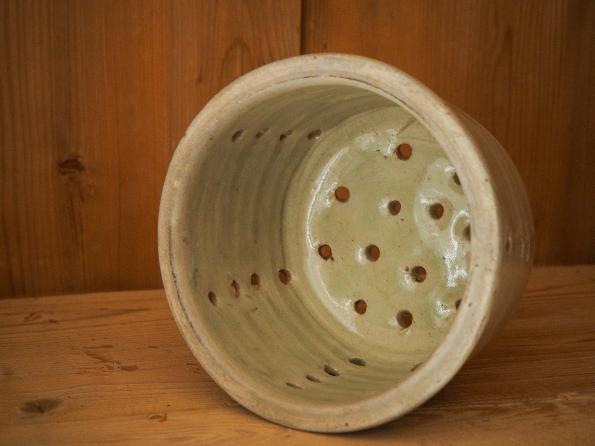 A lovely small vintage French stoneware cheese mould, also known as a faisselle. These moulds are traditionally used for making soft cheeses. The holes in the sides allow whey to train freely during the cheesemaking process. It's in great vintage condition with no cracks or chips.