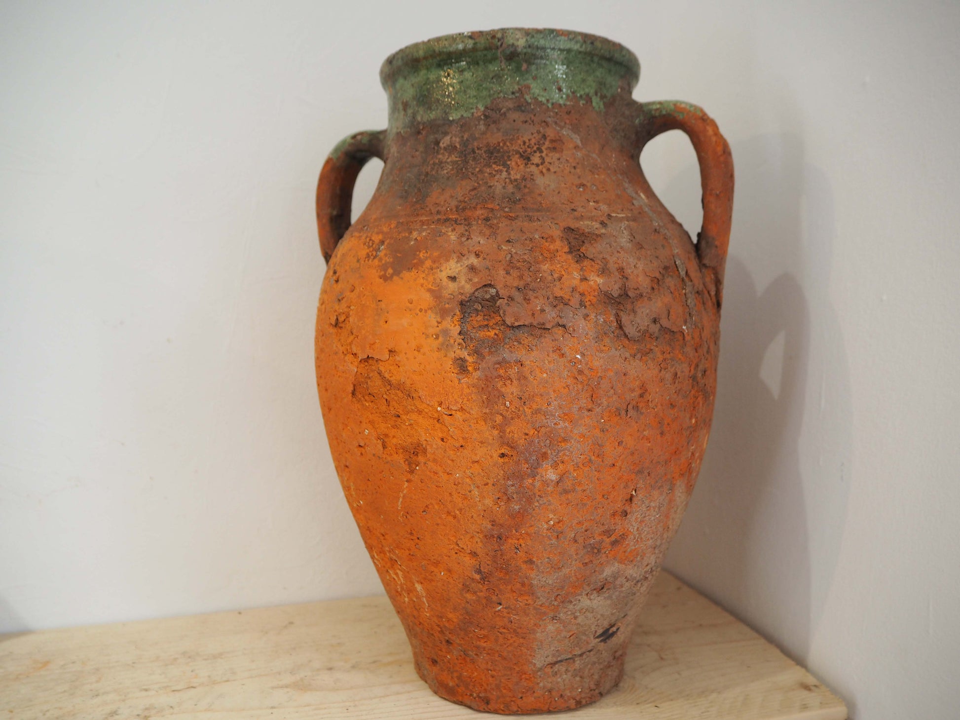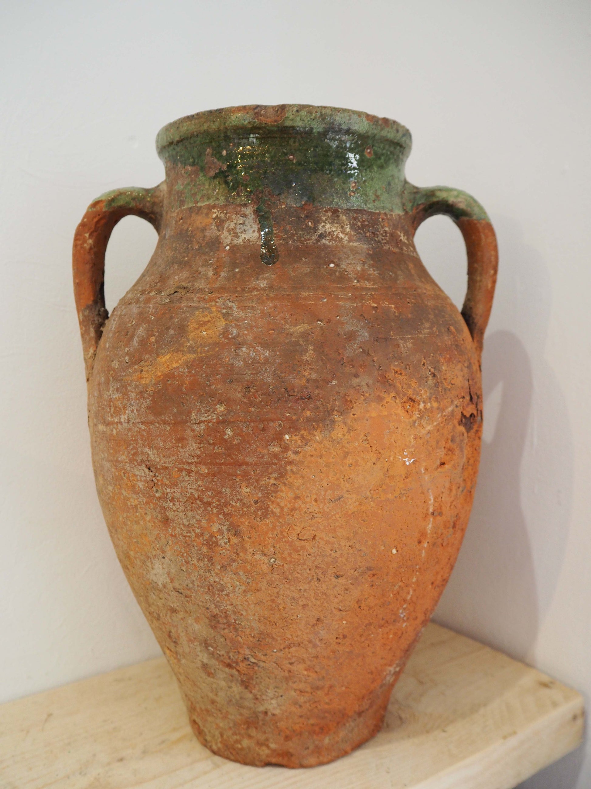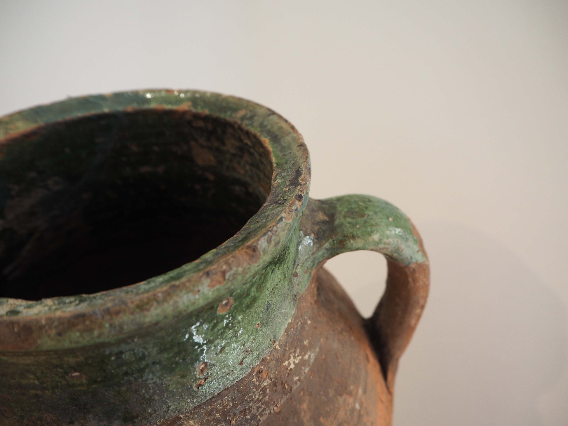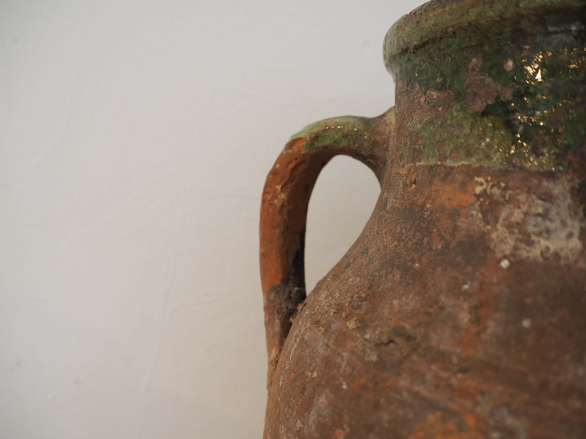 This vintage Turkish handcrafted terracotta urn originate would have been used for preserving and transporting various local delicacies, such as olive oil, grains, fruits and wine throughout Europe. Now, it makes a fantastic decorative item. This particular pot features the darker green glaze, indicating that it is much older than our other Turkish pots.