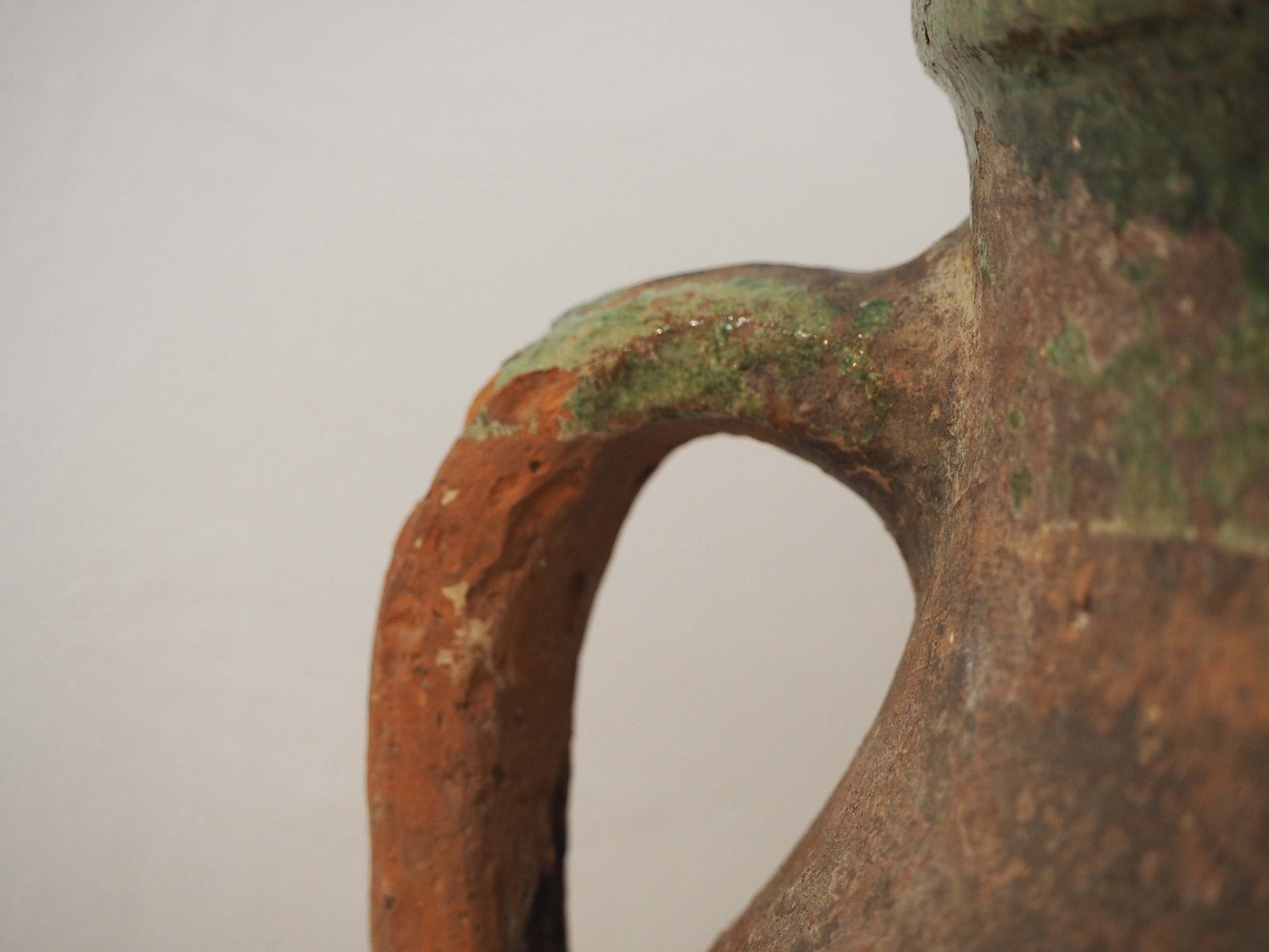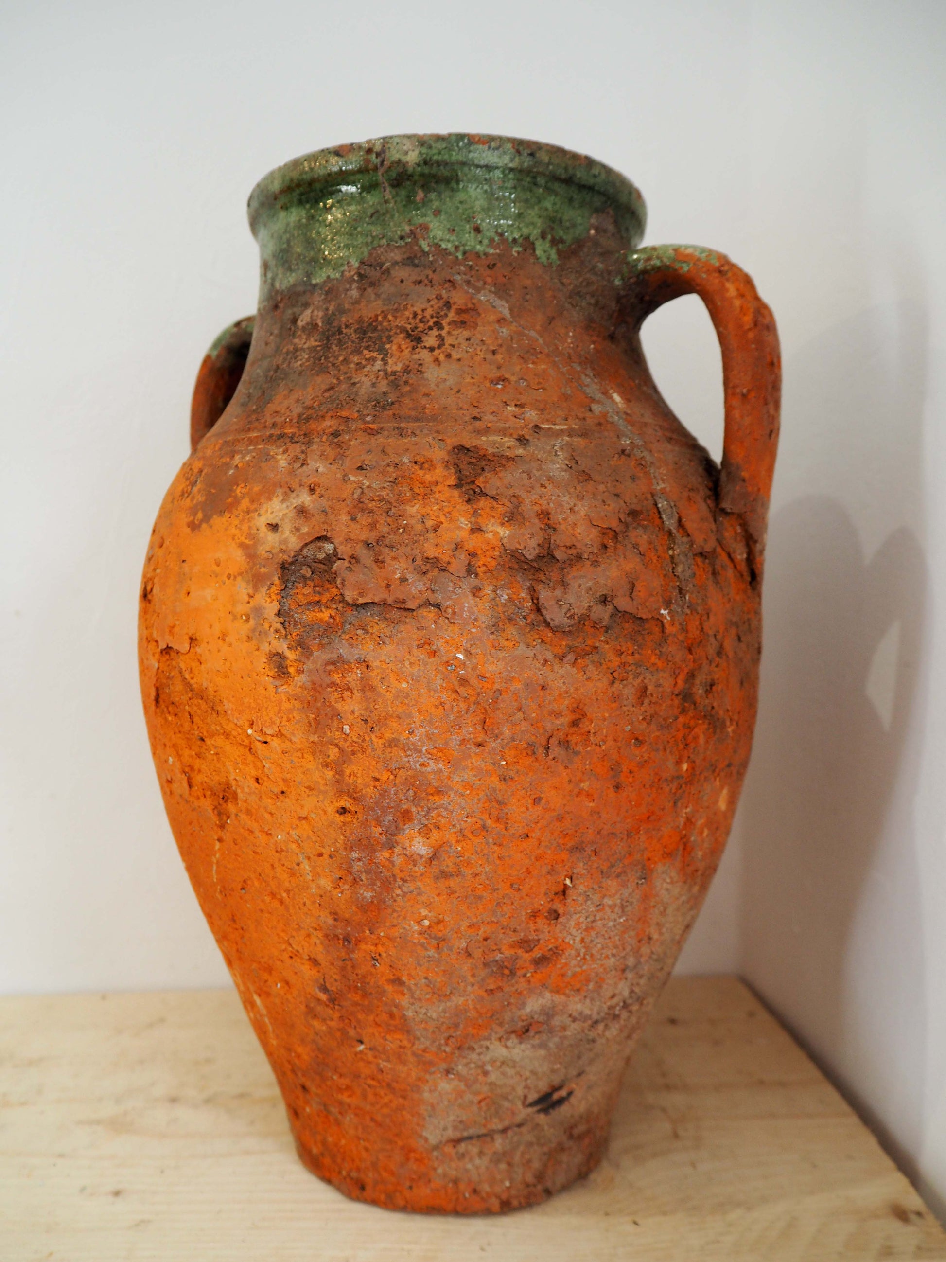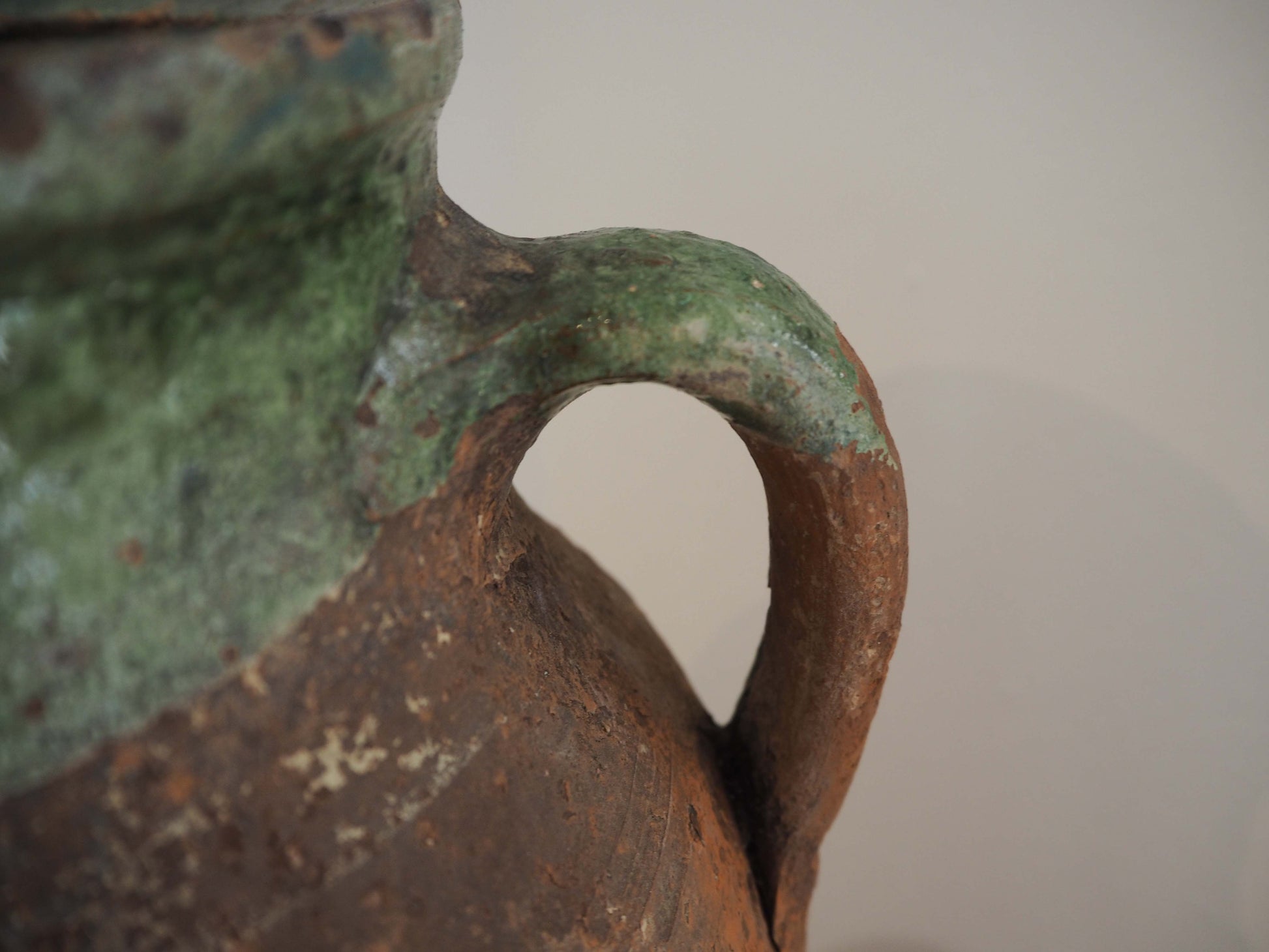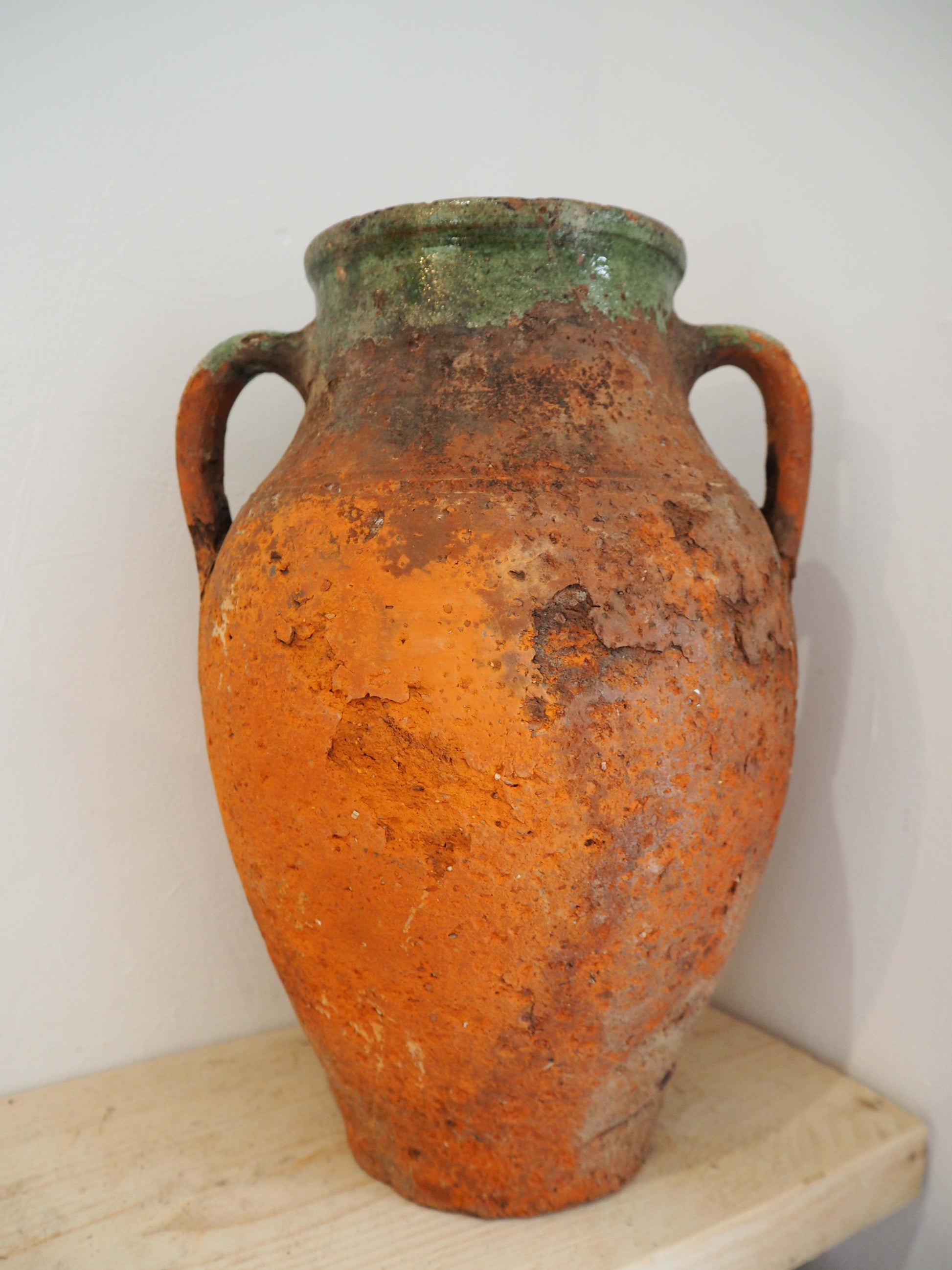 This vintage Turkish handcrafted terracotta urn originate would have been used for preserving and transporting various local delicacies, such as olive oil, grains, fruits and wine throughout Europe. Now, it makes a fantastic decorative item. This particular pot features the darker green glaze, indicating that it is much older than our other Turkish pots.