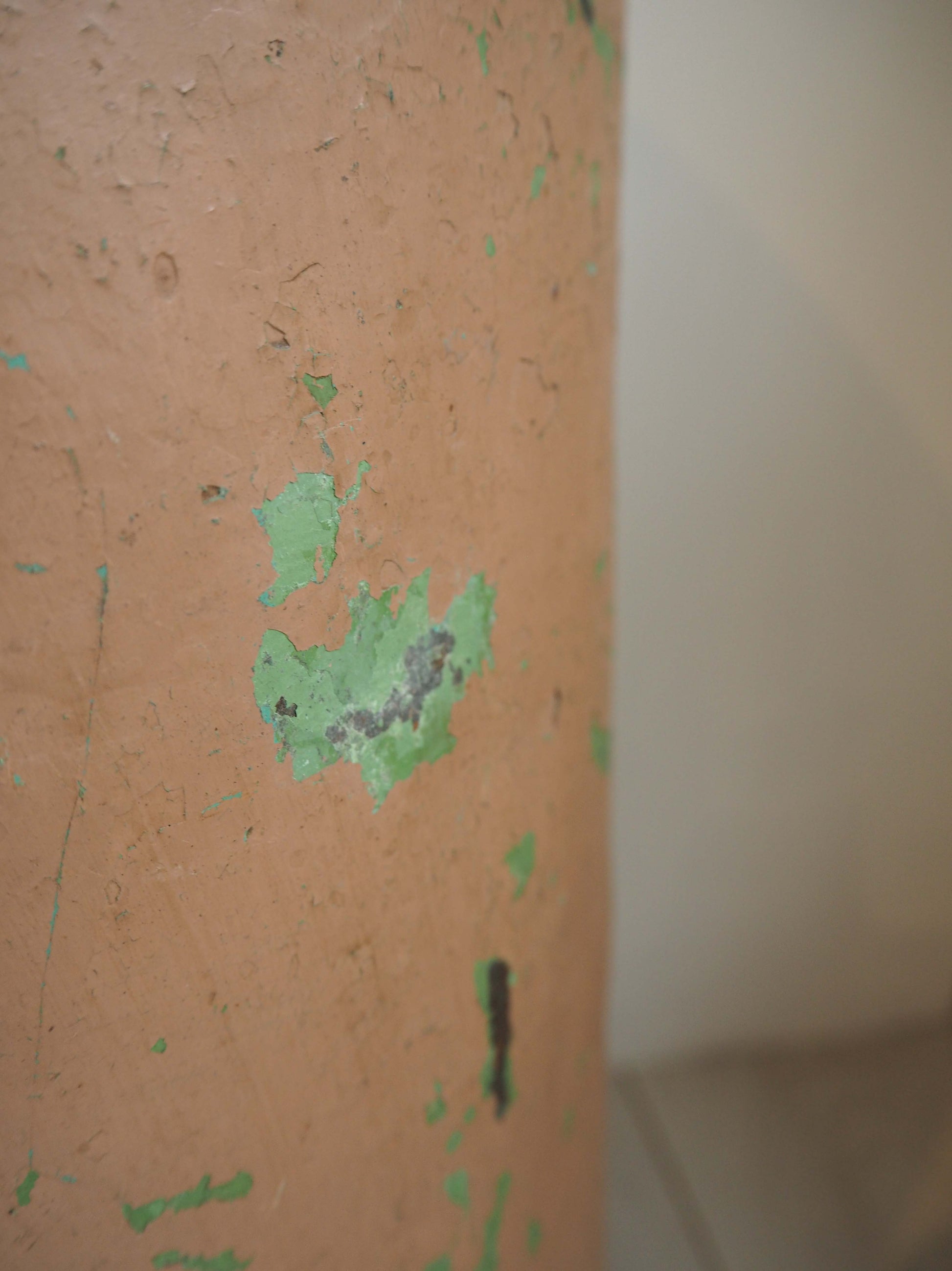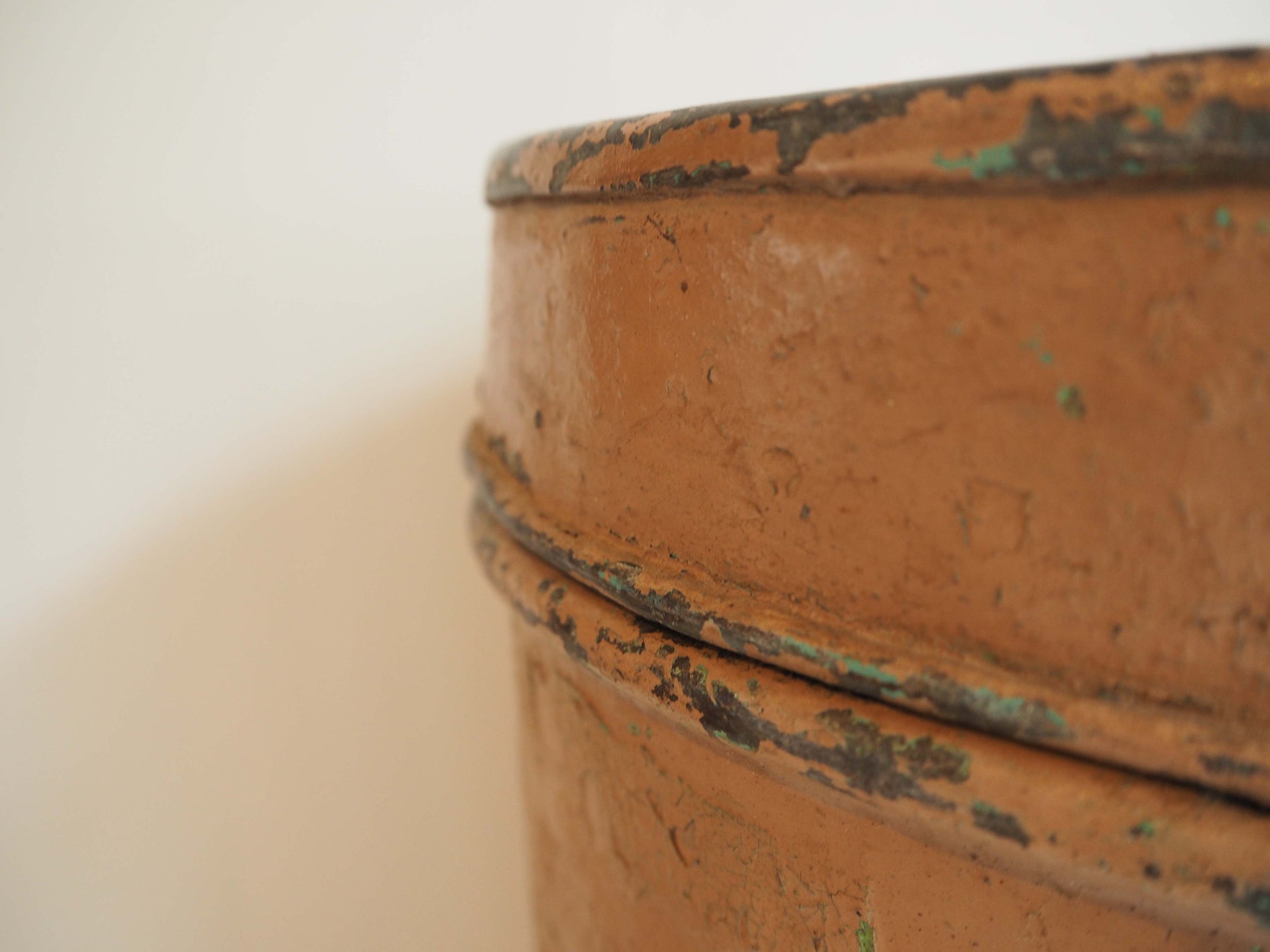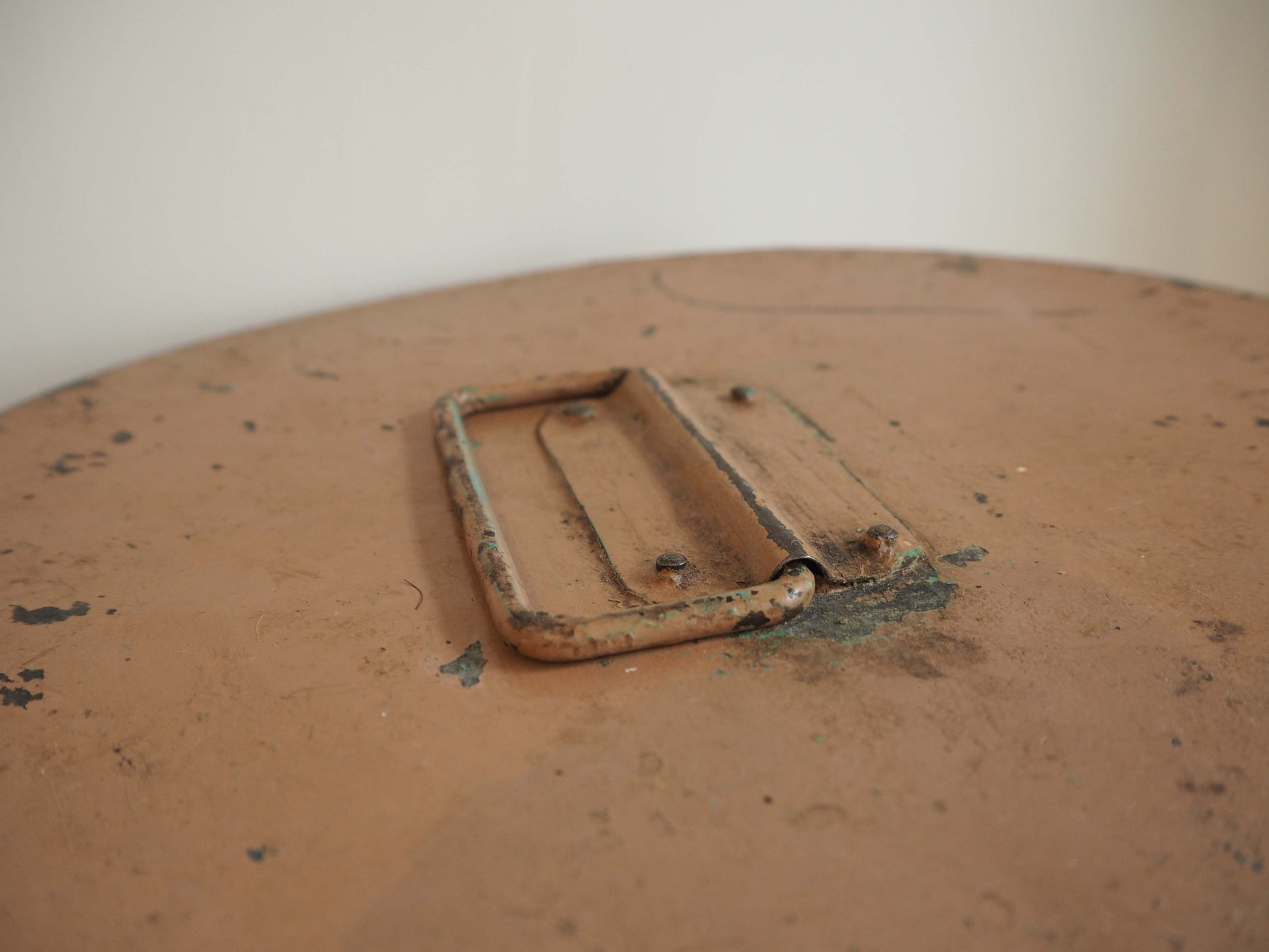 An early 20th Century original Indian storage drum. They were traditionally used to store grain and rice. The cylindrical shape creates an uncommon storage space as well as giving it a robust formation. Also, they're complete with an attached swing lid, handle and lock. This particular drum is a soft pink colour with remnants of vibrant green paint. Now, it could be used as a funky kitchen bin, laundry basket or for fire kindling.