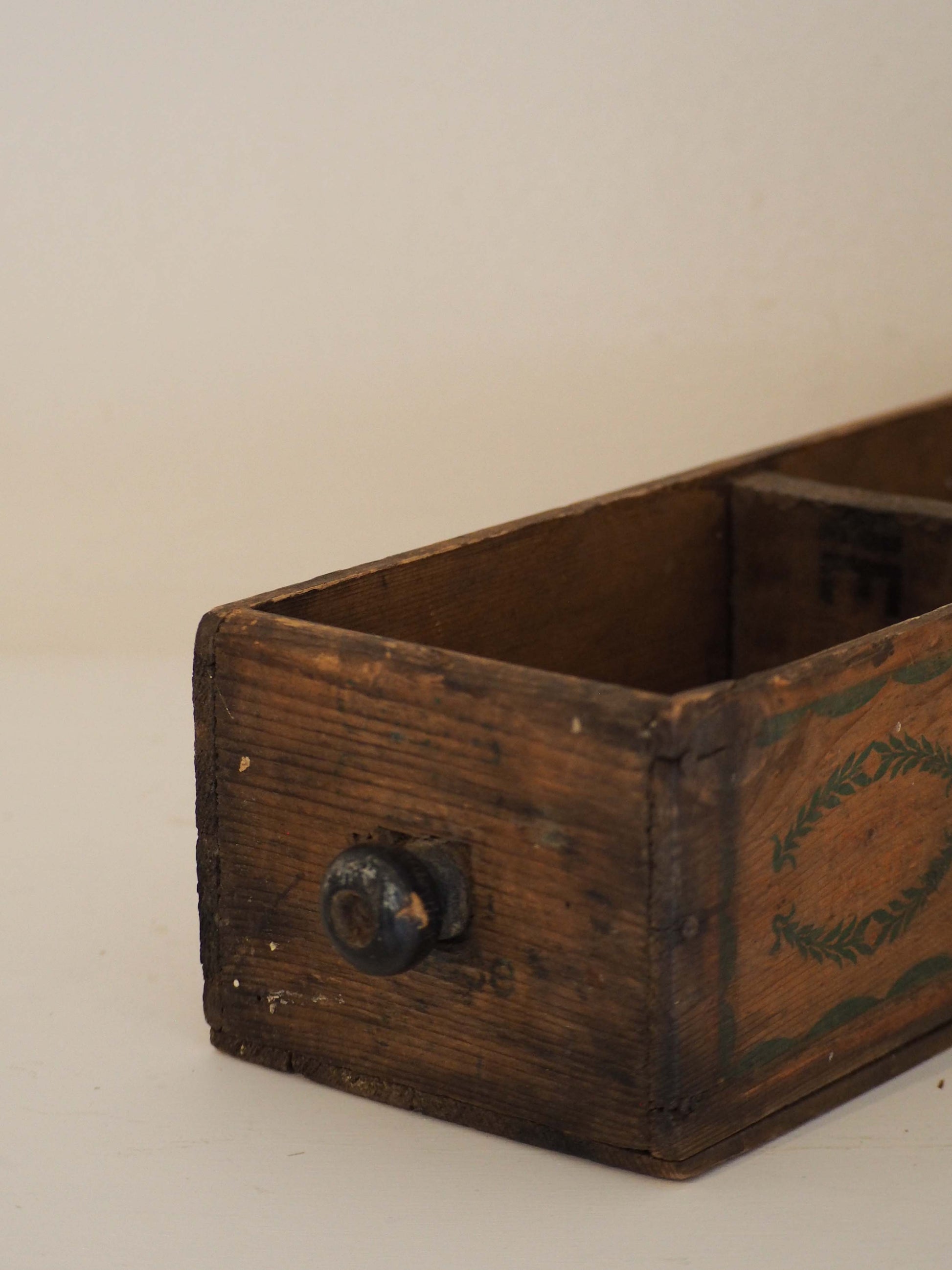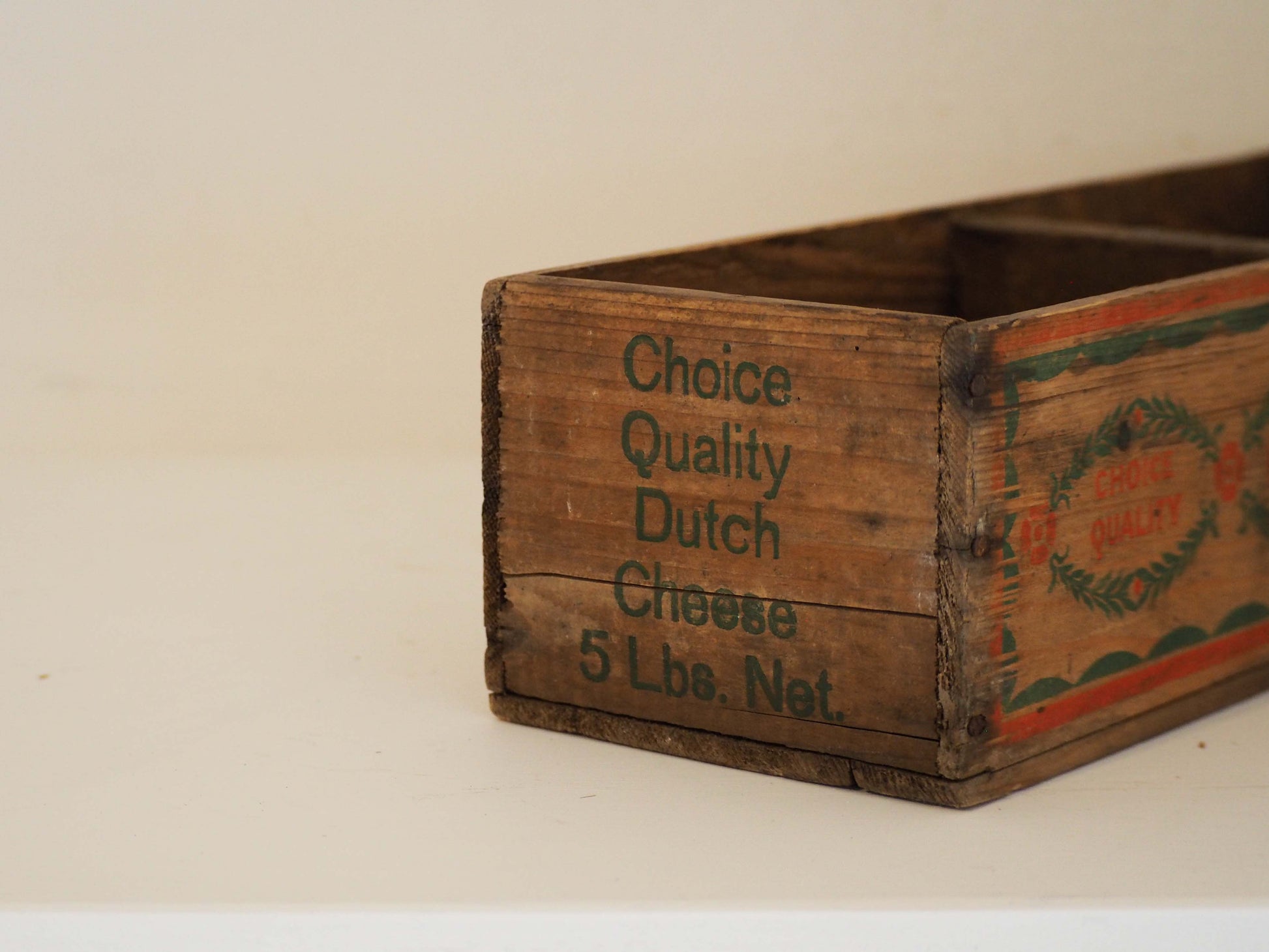 A lovely vintage rustic wooden box with inner divider and original knob, with 'Choice Quality Dutch Cheese 5lb. Net' stamped on one side and 'Choice Quality Garland' on the other.