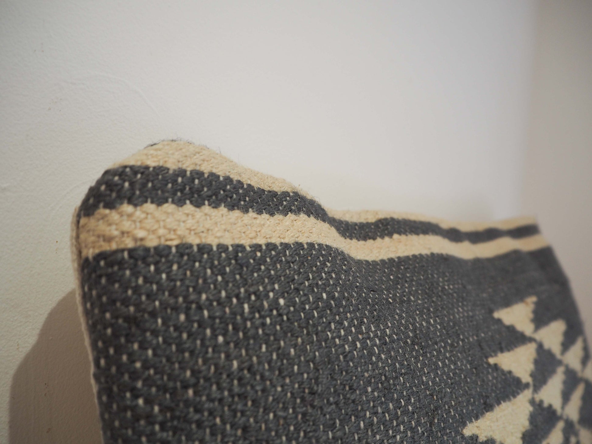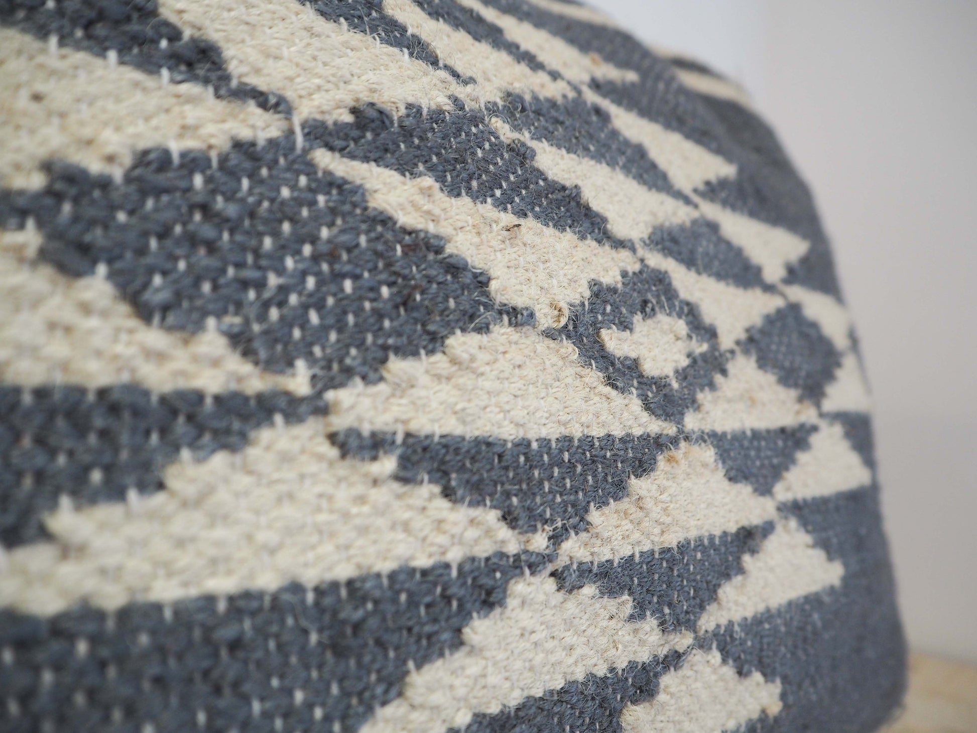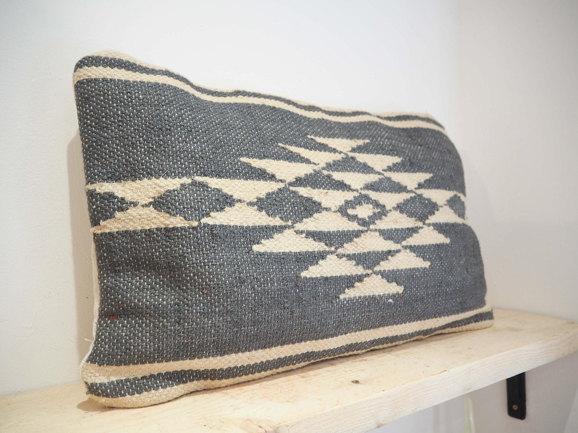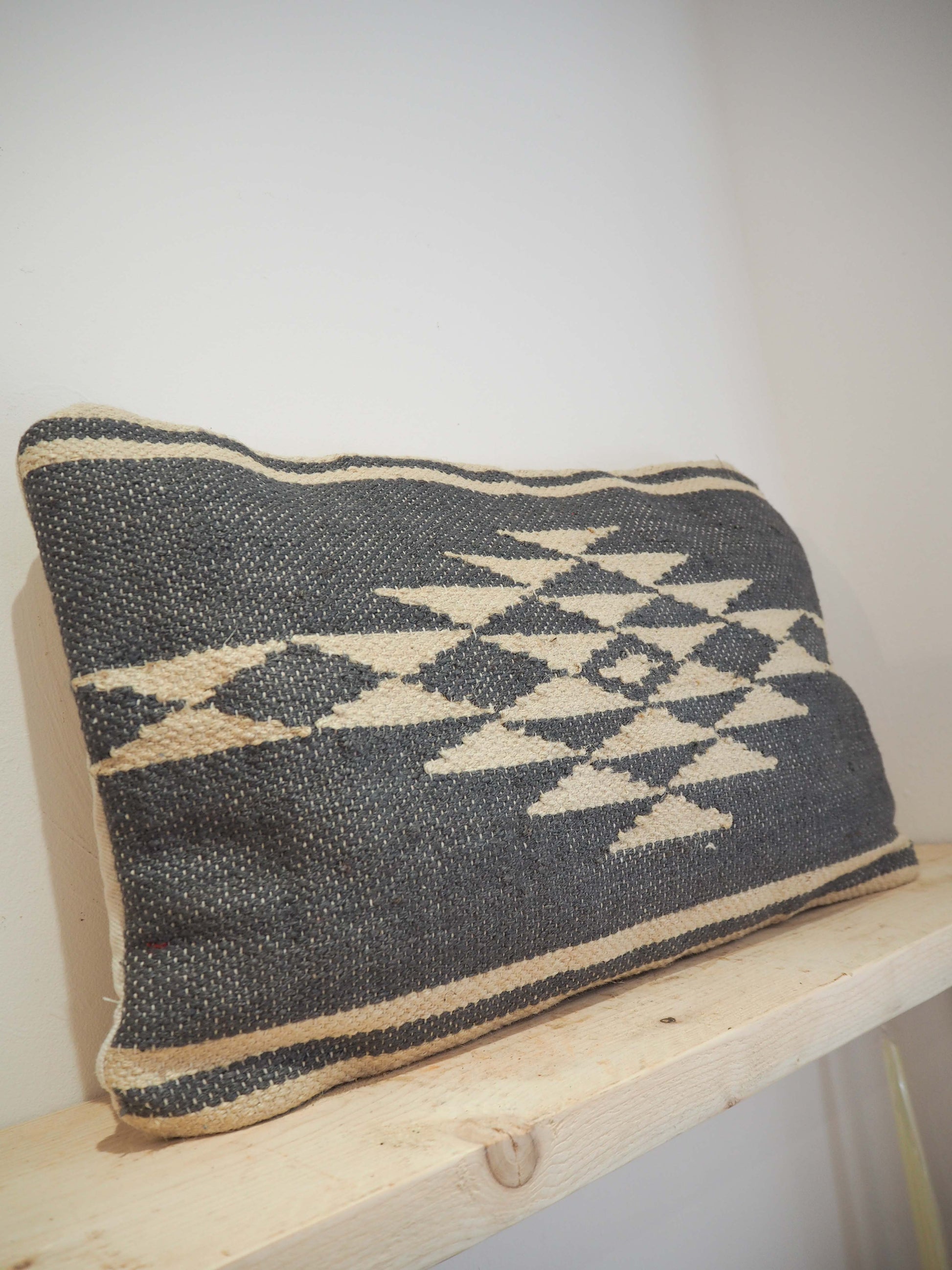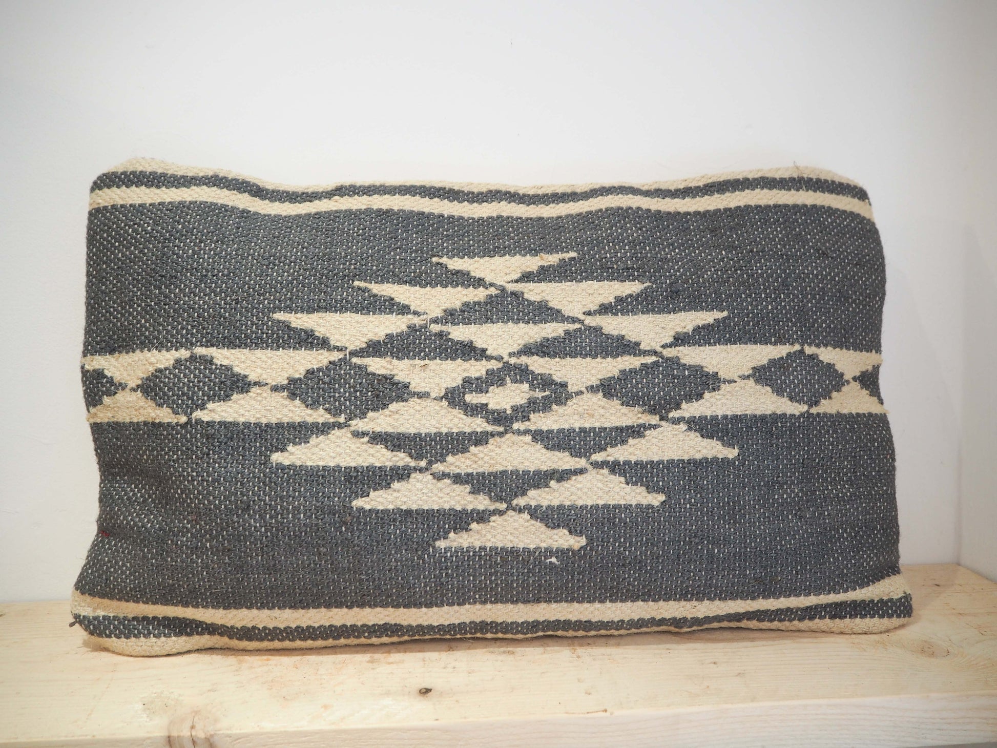 Vintage Style Jute Geometric Rectangular Cushion / Navy Blue & Cream