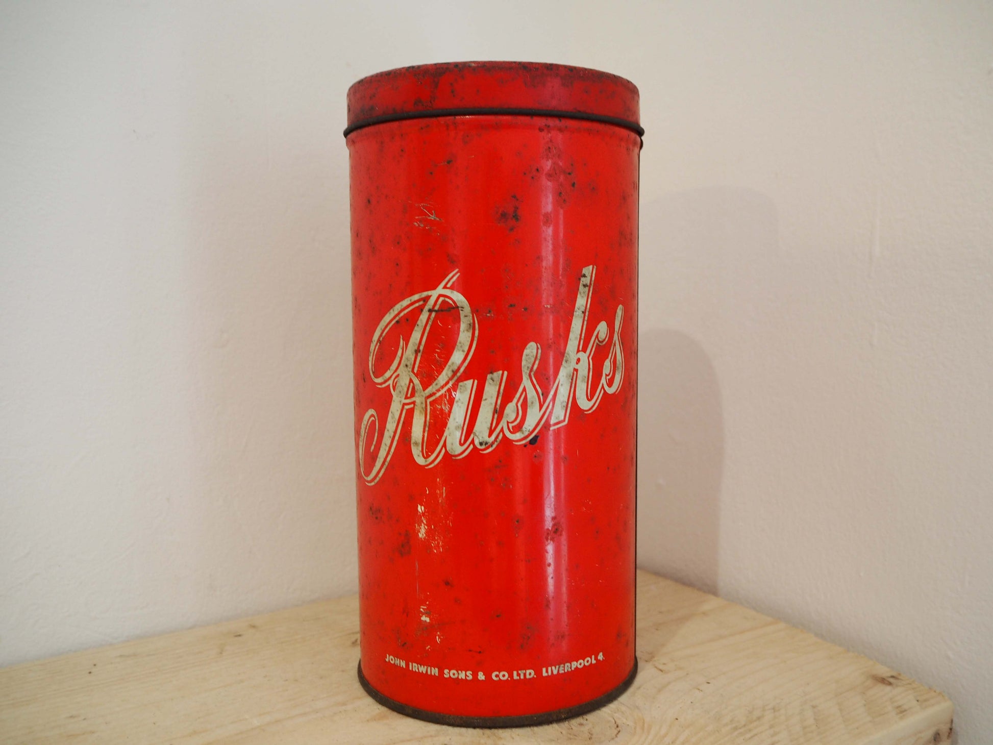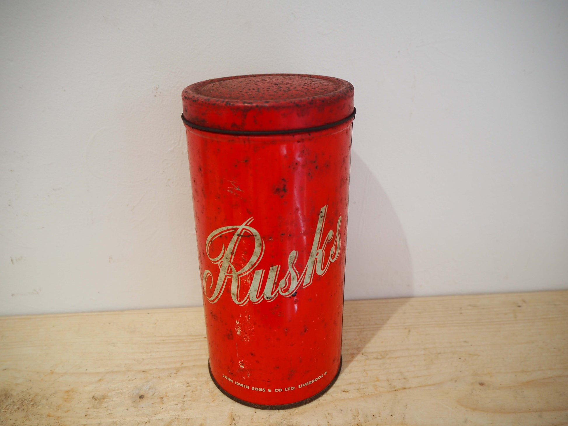 A vintage metal advertising tin in a vibrant red colour and decorative font from John Irwin, Sons & Co, a wholesale grocers and provision dealers that began business in 1892.